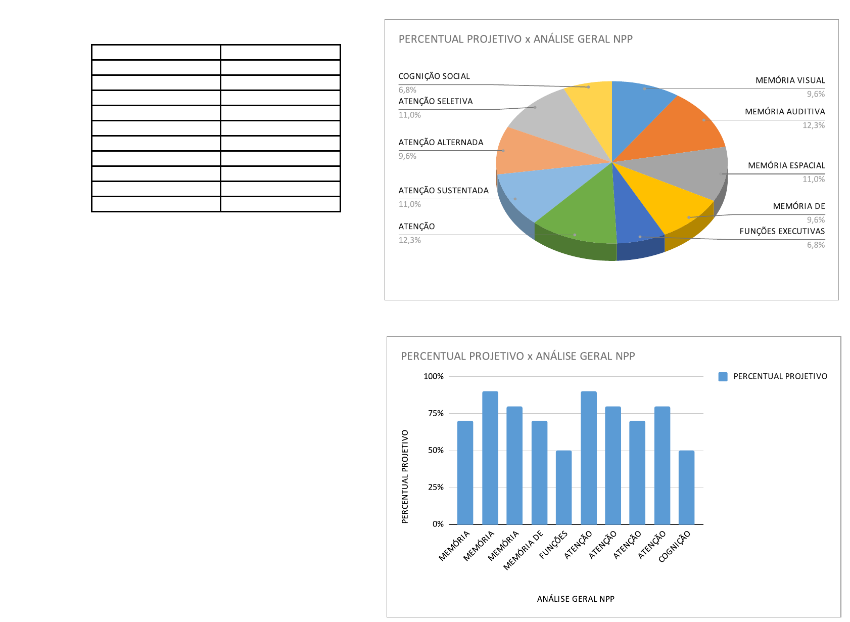 <p>ANÁLISE GERAL NPP PERCENTUAL PROJETIVO</p><p>MEMÓRIA VISUAL 70%</p><p>MEMÓRIA AUDITIVA 90%</p><p>MEMÓRIA ESPACIAL 80%</p><p>MEMÓRIA DE TRABALHO 70%</p><p>FUNÇÕES EXECUTIVAS 50%</p><p>ATENÇÃO CONCENTRADA 90%</p><p>ATENÇÃO SUSTENTADA 80%</p><p>ATENÇÃO ALTERNADA 70%</p><p>ATENÇÃO SELETIVA 80%</p><p>COGNIÇÃO SOCIAL 50%</p>