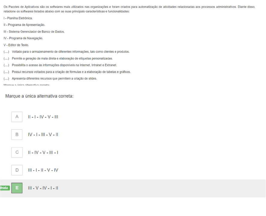 <p>Os Pacotes de Aplicativos são os softwares mais utilizados nas organizações e foram criados para automatização de atividades relacionadas aos processos administrativos. Diante disso, relacione os softwares listados abaixo com as suas principais características e Planilha Eletrônica. Programa de Apresentação. III Sistema Gerenciador de Banco de IV Programa de Navegação. V Editor de Texto. Voltado para armazenamento de diferentes informações, tais como clientes e produtos. (....) Permite a geração de mala direta e elaboração de etiquetas personalizadas. (....) Possibilita acesso às informações disponíveis na Internet, Intranet e (....) Possui recursos voltados para a criação de fórmulas e a elaboração de tabelas e (....) Apresenta diferentes recursos que permitem a criação de slides. Marque única Marque a única alternativa correta: A B C D Ihida E</p>