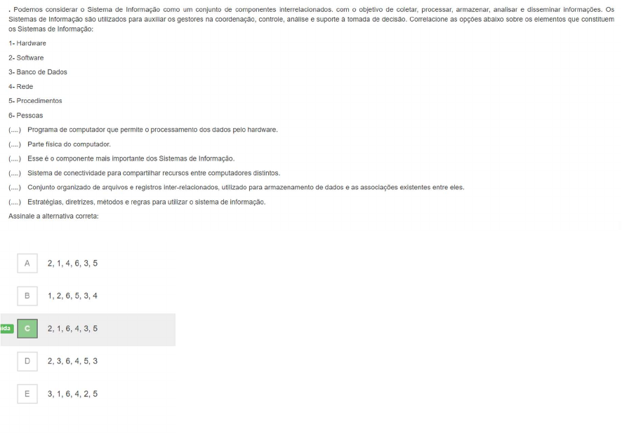 <p>. Podemos considerar Sistema de Informação como um conjunto de componentes interrelacionados. com objetivo de coletar, processar, armazenar, analisar e disseminar informações. Os Sistemas de Informação são utilizados para auxiliar os gestores na coordenação, análise e suporte à tomada de decisão. Correlacione as opções abaixo sobre os elementos que constituem os Sistemas de Informação: 1- Hardware 2- Software 3. Banco de Dados 4. Rede 5. Procedimentos Pessoas Programa de computador que permite processamento dos dados pelo hardware. (....) Parte física do computador. (....) Esse é o componente mais importante dos Sistemas de Informação. (....) Sistema de conectividade para compartilhar recursos entre computadores distintos. (....) Conjunto organizado de arquivos e registros utilizado para armazenamento de dados e as associações existentes entre eles. (....) Estratégias, diretrizes, métodos e regras para utilizar sistema de informação. Assinale a alternativa correta: A 2. 4, 6, 3, 5 B C 2, 1, 6, 4, 3, 5 D 2,3,6,4,5,3 E 3,1,6,4,2,5</p>