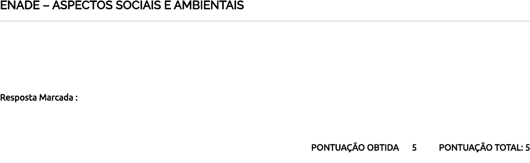 <p>ENADE – ASPECTOS SOCIAIS E AMBIENTAIS</p><p>AS ALTERNATIVAS QUE SE SEGUEM SÃO TRECHOS ADAPTADOS DE REINALDO DIAS. INTRODUÇÃO À SOCIOLOGIA. SÃO</p><p>PAULO: PEARSON PRENTICE HALL, 2005. P. 52 E 53. CONSIDERANDO A PRESCRIÇÃO GRAMATICAL, A COESÃO E A COERÊNCIA</p><p>TEXTUAIS NOS TRECHOS APRESENTADOS, ASSINALE A ALTERNATIVA CORRETA.</p><p>PONTUAÇÃO TOTAL: 5PONTUAÇÃO OBTIDA 5</p><p>Resposta Marcada :</p><p>Os valores estéticos de uma sociedade revelam os conceitos de beleza apreciados em determinada cultura e</p><p>abrangem todo tipo de manifestação artística expressa pelas diferentes camadas sociais.</p><p>23/07/24, 22:51 Course Status – AVA Saúde Unifaveni</p><p>https://ava.saude.unifaveni.com.br/course-status/ 1/3</p><p>23/07/24, 22:51 Course Status – AVA Saúde Unifaveni</p><p>https://ava.saude.unifaveni.com.br/course-status/ 2/3</p><p>20 / 20</p><p>A RESPEITO DO CONTEÚDO DESSE TEXTO É CORRETO AFIRMAR QUE:</p><p>PONTUAÇÃO TOTAL: 5PONTUAÇÃO OBTIDA 5</p><p>Resposta Marcada :</p><p>apresentado no primeiro parágrafo, o assunto é analisado nos dois seguintes.</p><p>SOBRE GESTÃO DE RESÍDUOS SÓLIDOS E SUSTENTABILIDADE EM UMA UNIDADE DE ALIMENTAÇÃO E NUTRIÇÃO (UAN),</p><p>MARQUE V PARA AS AFIRMATIVAS VERDADEIRAS E F PARA AS FALSAS.</p><p>( ) AS UAN, DEVIDO À NATUREZA DE SUA ATIVIDADE, AINDA NÃO REPRESENTAM UMA IMPORTANTE FONTE DE PRODUÇÃO</p><p>DE LIXO EM TODA A SUA CADEIA DE PRODUÇÃO.</p><p>( ) GERALMENTE, O LIXO PREDOMINANTE EM UMA UAN É INORGÂNICO E CORRESPONDE A 60% DO RESÍDUO TOTAL.</p><p>( ) OS RESÍDUOS SÓLIDOS GERADOS EM UMA UAN DEPENDEM DE VÁRIOS FATORES, COMO DIVERSIDADE E SOFISTICAÇÃO</p><p>DAS PREPARAÇÕES, TIPO DE SERVIÇO E NÚMERO DE COMENSAIS/CLIENTES.</p><p>( ) A GESTÃO AMBIENTAL DEVE ESTAR SEMPRE FOCADA NO SEU OBJETIVO PRIMÁRIO, QUE É A GERAÇÃO DE MENOR</p><p>QUANTIDADE POSSÍVEL DE RESÍDUOS, SEJAM ELES ORGÂNICOS OU INORGÂNICOS.</p><p>ASSINALE A SEQUÊNCIA CORRETA.</p><p>PONTUAÇÃO TOTAL: 5PONTUAÇÃO OBTIDA 5</p><p>Resposta Marcada :</p><p>F, F, V, V</p><p>A INDÚSTRIA FARMACÊUTICA E DE BIOTECNOLOGIA UTILIZAM, COMO INSUMOS PRIMÁRIOS, O TRABALHO HUMANO, OS</p><p>CONHECIMENTOS TÉCNICOS, OS RECURSOS BIOLÓGICOS E O CAPITAL. ESTAS MATÉRIAS-PRIMAS E SABERES SÃO FONTES</p><p>INESGOTÁVEIS PARA O PROCESSO DE PESQUISA E DESENVOLVIMENTO DE NOVOS PRODUTOS E PROCESSOS BIOMÉDICOS E</p><p>BIOTECNOLÓGICOS NOS SETORES CIENTÍFICOS E PRODUTIVOS.</p><p>OS PAÍSES EM DESENVOLVIMENTO CONTRIBUEM COM RECURSOS NATURAIS E CONHECIMENTOS TRADICIONAIS</p><p>ASSOCIADOS À BIODIVERSIDADE. ENTRETANTO, DE ACORDO COM (RODRIGUES JUNIOR, 2009), “ESSAS ORGANIZAÇÕES</p><p>CIENTÍFICAS E INDUSTRIAIS, MOVIDAS PELA AMBIÇÃO DESMEDIDA, FREQUENTEMENTE RETRIBUEM O BEM RECEBIDO COM</p><p>A IMPOSIÇÃO DE UMA EXTERNALIDADE NEGATIVA SOBRE AS COMUNIDADES TRADICIONAIS E PAÍSES EM</p><p>DESENVOLVIMENTO, AO NÃO RECONHECEREM O PAPEL DESTAS CONTRIBUIÇÕES AO DESENVOLVIMENTO DE SUA MISSÃO</p><p>NEM BENEFICIÁ-LAS COM UMA PARCELA DOS LUCROS AUFERIDOS”.</p><p>A APROPRIAÇÃO INDÉBITA DESTES RECURSOS DA DIVERSIDADE BIOLÓGICA, CONHECIMENTOS E EXPRESSÕES CULTURAIS</p><p>TRADICIONAIS CARACTERIZA A BIOPIRATARIA, GRANDE PARTE DESSA PRÁTICA ACONTECE LEGALMENTE PORQUE,</p><p>EQUIVOCADAMENTE, OS REGIMES DE PI (PROPRIEDADE INTELECTUAL) PRESSUPÕEM QUE ESSAS “PROPRIEDADES”</p><p>INTELECTUAIS SÃO CONSTRUÍDAS A PARTIR DO NADA E QUE OS RECURSOS BIOCULTURAIS IMATERIAIS (RBI) POSSUEM A</p><p>QUALIDADE DE BENS PÚBLICOS.</p><p>FONTE: RODRIGUES JUNIOR, EDSON B. A PROTEÇÃO INTERNACIONAL DO PATRIMÔNIO BIOCULTURAL IMATERIAL A PARTIR</p><p>DA CONCEPÇÃO DE DESENVOLVIMENTO SUSTENTÁVEL: O PROBLEMA DA BIOPIRATARIA. TESE(DOUTORADO). 555 P.</p><p>FACULDADE DE DIREITO DA UNIVERSIDADE DE SÃO PAULO. 2009.</p><p>O PATRIMÔNIO BIOCULTURAL IMATERIAL (PBI) É CONSTITUÍDO POR GRUPOS DE RBI´S, A SABER:</p><p>PONTUAÇÃO TOTAL: 5PONTUAÇÃO OBTIDA 5</p><p>Resposta Marcada :</p><p>a diversidade biológica e os conhecimentos e expressões culturais tradicionais.</p><p>Total de Pontos</p><p>23/07/24, 22:51 Course Status – AVA Saúde Unifaveni</p><p>https://ava.saude.unifaveni.com.br/course-status/ 3/3</p>