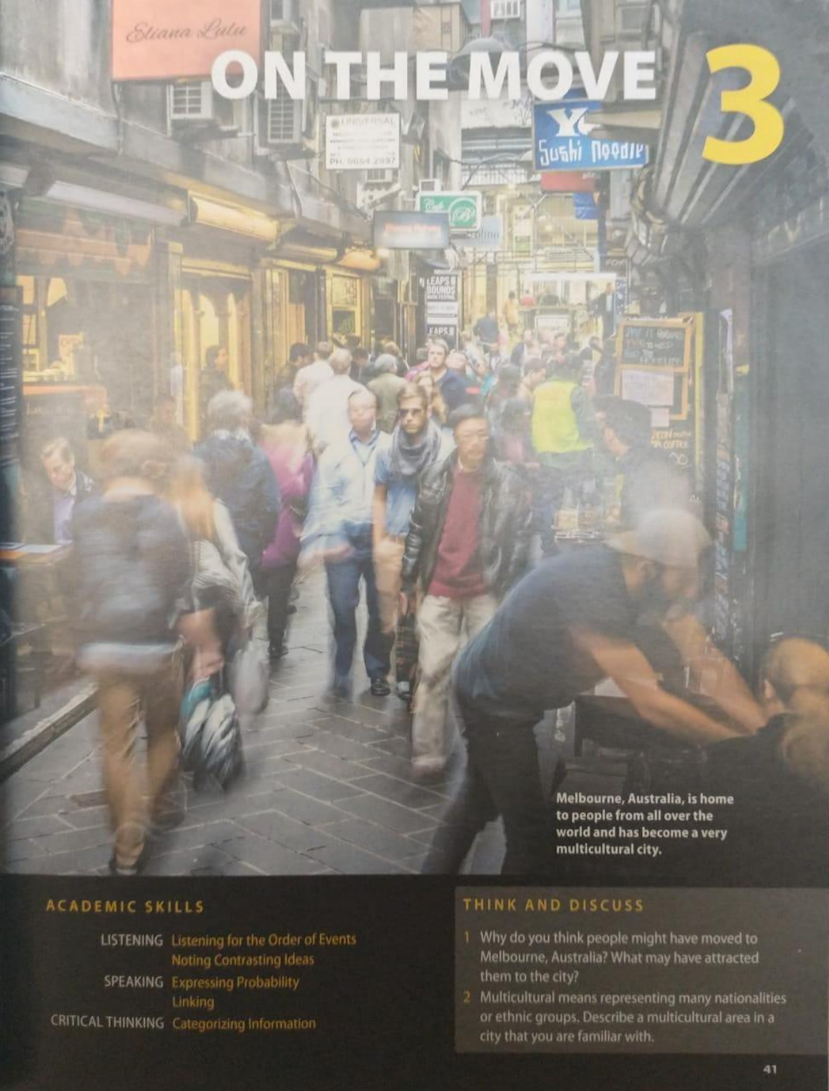 <p>Eliana Lutu THE MOVE B Sushi Melbourne, Australia, is home to people from all over the world and has become a very multicultural city. ACADEMIC SKILLS THINK AND DISCUSS LISTENING Listening for the Order of Events 1 Why do you think people might have moved to Noting Contrasting Ideas Melbourne, Australia? What may have attracted SPEAKING Expressing Probability them to the city? Linking 2 Multicultural means representing many nationalities CRITICAL THINKING Categorizing Information or ethnic groups. Describe a multicultural area in a city that you are familiar with. 41</p><p>EXPLORE THE THEME HUMAN Look at the map and key and read the Then answer the questions. 1. What do the arrows and circles show? MIGRATION 2. Which two cities receive the greatest number of immigrants? 3. Which two cities have the largest proportion of residents who are immigrants? 4. Why do you think the cities on the map are called gateway cities? 08 IRELAND Toronto 23 NORTH AMERICA UNITED STATES New York from Les CHINA 13 Houston MEXICO 2.1 Miami DOMINICAN REPUBLIC BALVADOR Gateway city populations Metro area population in millions Circle area current data ECUADOR Total foreign born SOUTH 0.8 Vancouver AMERICA PERU Total native born Migrant populations BOLIVIA Top migrant source countries of selected gateway cities PARAGUAY Migration arrow color-keyed to gateway city CHILE URUGUAY Aires ARCENTINA 42 UNIT</p><p>ND ASIA CHINA PAKISTAN 2.7 BANGLADESH INDIA Riyadh ICA VIETNAM PHILIPPINES SRI LANKA Singapore AUSTRALIA Sydney NEW ZEALAND ON THE MOVE 43</p><p>A Vocabulary VOCABULARY SKILL Noticing Clues to Meaning Writers unfamiliar speakers Learn to recognize the ways that writers and sometimes use clues to help readers and listeners and speakers understand do this By giving a synonym (or antonym) of a word Some airports mainly handle domestic or internal 2. By defining a word Some airports mainly handle domestic flights. This means ones within the but not international 3. By giving an explanation or example to clarify a word's meaning Some airports mainly handle domestic flights, which are generally flights between a country's major cities. MEANING FROM A Listen to five short excerpts from a lecture you will hear later. Think about CONTEXT what each word in blue means. Listen for synonyms or explanations. Complete each definition with one word from the excerpt. Then listen again to check your answers. 1. a. Settle means to move to a new country or and make a home b. Voluntary describes something that have freely chosen to do. 2. a. Emigration means movement from one place. b. Immigration means movement 3. a. Nation is another word for b. Domestic migration is within one country. 4. a. Stability is a political or situation that is certain or safe. b. Discrimination occurs when people treat a 5. a Migrants are people who have moved from one region to a new b. Barrier means some kind of that people must B With a partner, answer the questions. Then use a dictionary to confirm your answers. What noun means a place where people settle? 2. What verb means to do something voluntarily? What are the verb forms of emigration and immigration? 4. What is the adjective form of stability? 5. What verb means the thing that migrants do? 44 UNIT 3 LESSON</p><p>ROMANIA C Read the article and fill in the blanks with the correct word from exercise Two of the words from exercise A will not be used. MIGRATION IN ROMANIA Romania is the largest in southeastern It has a population of around 20 million people. At the end of the last century, Romania saw a lot of People moved from the countryside to large cities such as Since joining the European Union in 2007, migration out of the country has become more Studies show that up to 2.5 million Romanians have made a(n) choice to leave the country in recent years. Some of these people have chosen to in Spain and Italy. Because Romanian is a Romance language like Spanish and Italian, the language in these countries may be easier for Romanian to addition to from Romania, over a quarter of a million people have moved into the country Most of this comes from the Republic 8 of Moldova, a small country that borders Romania and has Romanian as its official language D Discuss these questions in a small group. 1. If you could settle in any nation in the world, where would you choose? 2. Are you more interested in domestic news international news? 3. What is one barrier to learning English that you are working to overcome? ON THE MOVE 45</p><p>A Listening A Lecture about Migration BEFORE LISTENING PREDICTING A Work in a small group. You will hear a lecture in which a professor discusses some reasons why people migrate. Look at the photos and discuss what reasons they represent. Then predict some other reasons the professor might NEEDS WELDING An unemployed man looking for work The effects of drought in East Kenya WHILE LISTENING LISTENING FOR B 1.24 1.5 Listen to the lecture. Check () the statements that match points the MAIN IDEAS professor makes. 1. There are two kinds of domestic and 2. Push factors give people a reason to emigrate from a country. 3. Pull factors make a country attractive to potential 4. Countries with strong economies rarely experience 5. Push and pull factors can be divided into several 6. The majority of people who migrate can speak two languages. NOTE-TAKING SKILL Noting Contrasting Ideas During or more lectures other or presentations, it is common for speakers to with one stability and In some cases, the ideas may be different contrast one economic idea immigration political and stability; in other cases, they may be opposite such ideas as make note of When you hear speakers mention contrasting such ideas, as a what they say You can use a slash to mark a UNIT LESSON A</p><p>C 1.24 Listen again to the lecture. As you listen, complete these notes with words NOTE TAKING from the lecture. Write one word only in each blank. Migration can be forced or domestic or Emigration out of a country i