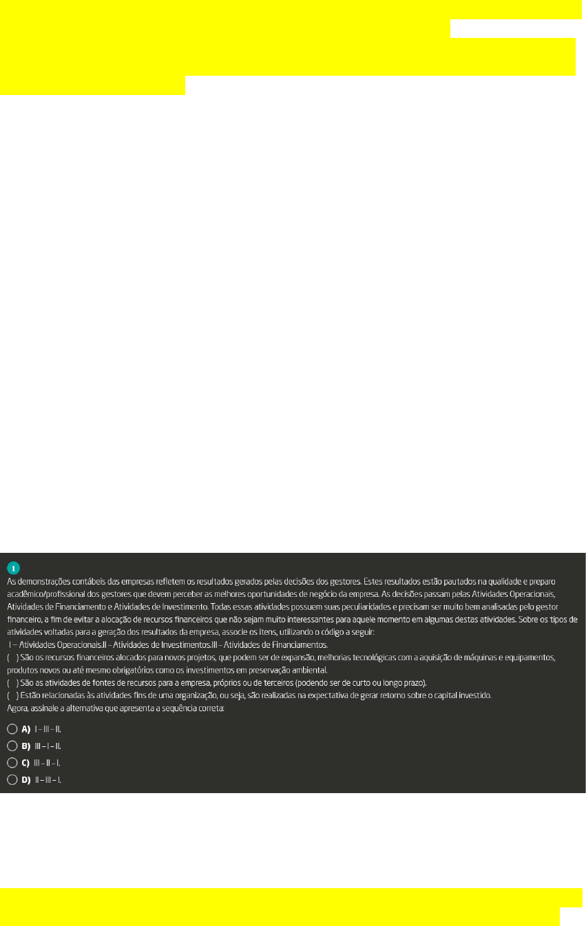 <p>As demonstrações contábeis das empresas refletem os resultados gerados pelas decisões dos gestores. Estes resultados estão pautados na qualidade e preparo acadêmico/profissional dos gestores que devem perceber as melhores oportunidades de negócio da empresa. As decisões passam pelas Atividades Operacionais, Atividades de Financiamento e Atividades de Investimento. Todas essas atividades possuem suas peculiaridades e precisam ser muito bem analisadas pelo gestor financeiro, a fim de evitar a alocação de recursos financeiros que não sejam muito interessantes para aquele momento em algumas destas atividades. Sobre os tipos de atividades voltadas para a geração dos resultados da empresa, associe os itens, utilizando o código a seguir:</p><p>I − Atividades Operacionais.</p><p>II – Atividades de Investimentos.</p><p>III – Atividades de Financiamentos.</p><p>( ) São os recursos financeiros alocados para novos projetos, que podem ser de expansão, melhorias tecnológicas com a aquisição de máquinas e equipamentos, produtos novos ou até mesmo obrigatórios como os investimentos em preservação ambiental.</p><p>( ) São as atividades de fontes de recursos para a empresa, próprios ou de terceiros (podendo ser de curto ou longo prazo).</p><p>( ) Estão relacionadas às atividades fins de uma organização, ou seja, são realizadas na expectativa de gerar retorno sobre o capital investido.</p><p>Agora, assinale a alternativa que apresenta a sequência correta:</p><p>R: D 2,3,1</p><p>2</p><p>Para combater e controlar a inflação, o Estado necessita implantar uma série de medidas que visam ao desenvolvimento econômico. Algumas vezes, estas medidas podem ter efeitos mais rápidos e, outras vezes, podem ter efeitos mais lentos na economia. Sobre esses aspectos, analise os tipos de políticas adotadas pelo Estado para o combate e controle da inflação e associe os itens utilizando o código a seguir:</p><p>I − Política Fiscal.</p><p>II – Política Monetária.</p><p>III – Política Cambial.</p><p>IV − Política de Rendas.</p><p>( ) Define o valor externo da moeda; controla os fluxos de moeda estrangeira; impacta o valor interno da moeda.</p><p>( ) Define e aplica os impostos e taxas sobre os agentes econômicos; com base na Receita Fiscal, define os gastos do Governo; influi na política monetária, em especial no fluxo de caixa e na concessão de créditos dos agentes econômicos.</p><p>( ) É o conjunto de medidas adotadas pelo governo visando adequar os meios de pagamentos disponíveis às necessidades da economia do país.</p><p>( ) Controla os fatores de produção, como salários, encargos, distribuição de resultados da atividade econômica e sistemas de preços.</p><p>Agora, assinale a alternativa que apresenta a sequência CORRETA:</p><p>R: D 3,1,2,4</p><p>3 A análise do mercado é uma etapa de suma importância para a confecção do plano de negócios, uma vez que ela ajudará o empreendedor...</p><p>Assinale a alternativa que completa corretamente a frase:</p><p>R:B</p><p>4</p><p>A união das atividades dos departamentos integrantes de uma empresa resulta em um sistema organizacional, no qual existe uma ordem hierárquica a ser respeitada em decorrência do agrupamento humano integrante da organização. Dessa forma, para que o Sistema Empresa tenha um bom funcionamento é dividido em vários subsistemas. Em relação aos subsistemas, associe os itens utilizando o código a seguir:</p><p>I – Organização.</p><p>II – Institucional.</p><p>III – Gestão.</p><p>IV – Social.</p><p>V – Informação.</p><p>( ) Abrange o quadro funcional da empresa, incluindo-se nessa esfera a cultura e demais características inerentes ao capital intelectual da organização.</p><p>( ) É como a empresa está organizada, o tipo de estrutura empregada (vertical ou horizontal), o grau de autoridade e atribuição de responsabilidade.</p><p>( ) É também denominado de matriz, responsável pelos demais subsistemas, compreende a missão, assim como crenças e valores da organização.</p><p>( ) Tendo em vista a atual dinâmica dos mercados como um todo, este subsistema aparece com considerável importância, pois consiste no conjunto de dados necessários para uma melhor tomada de decisão dos gestores da empresa.</p><p>( ) É o responsável pelo processo de tomada de decisões, pois abrange as atividades de planejamento, gerenciamento e mecanismo de controle interno.</p><p>Agora, assinale a alternativa que apresenta a sequência correta:</p><p>R: D, 4, 1, 2,5,3</p><p>5</p><p>Os recursos de capital próprio são importantes para alavancar as atividades da empresa e devem possuir certo equilíbrio em relação aos recursos do capital de terceiros. Isso porque se a empresa for bastante conservadora, manterá menor volume de recursos de terceiros do que de capital próprio, de acordo com a imobilização do Capital Próprio. Apure a imobilização do Capital Próprio, uma vez que a empresa apresenta o valor do Patrimônio Líquido de R$ 19.870.000,00 e o valor do Imobilizado em R$ 17.850.000,00. A partir disso, verifique as sentenças a seguir e classifique (V) para as verdadeiras e (F) para as falsas:</p><p>( ) Este indicador é interessante porque permite demonstrar os percentuais do patrimônio líquido que estão aplicados no ativo permanente. Nada mais é do que entender se a empresa necessita mais recursos de terceiros do que de capital próprio para investir em Ativo Imobilizado da empresa.</p><p>( ) Se a empresa investir todo o seu Patrimônio Líquido em Ativo Imobilizado, significa que ela não depende totalmente de recursos de terceiros para gerar as atividades operacionais.</p><p>( ) O indicador apurado é de 0,8983 e determina que a empresa investe parte dos recursos do Capital Próprio (sobra do Patrimônio Líquido) em outros Ativos (além do próprio Imobilizado).</p><p>Agora, assinale a alternativa que apresenta a sequência correta:</p><p>R:D</p><p>6</p