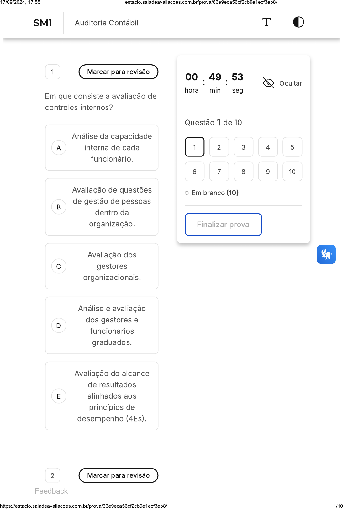 <p>A</p><p>B</p><p>C</p><p>D</p><p>E</p><p>1 Marcar para revisão</p><p>Em que consiste a avaliação de</p><p>controles internos?</p><p>Análise da capacidade</p><p>interna de cada</p><p>funcionário.</p><p>Avaliação de questões</p><p>de gestão de pessoas</p><p>dentro da</p><p>organização.</p><p>Avaliação dos</p><p>gestores</p><p>organizacionais.</p><p>Análise e avaliação</p><p>dos gestores e</p><p>funcionários</p><p>graduados.</p><p>Avaliação do alcance</p><p>de resultados</p><p>alinhados aos</p><p>princípios de</p><p>desempenho �4Es�.</p><p>2 Marcar para revisão</p><p>00</p><p>hora</p><p>: 49</p><p>min</p><p>: 53</p><p>seg</p><p>Ocultar</p><p>Questão 1 de 10</p><p>Em branco �10�</p><p>Finalizar prova</p><p>1 2 3 4 5</p><p>6 7 8 9 10</p><p>Feedback</p><p>SM1 Auditoria Contábil</p><p>17/09/2024, 17:55 estacio.saladeavaliacoes.com.br/prova/66e9eca56cf2cb9e1ecf3eb8/</p><p>https://estacio.saladeavaliacoes.com.br/prova/66e9eca56cf2cb9e1ecf3eb8/ 1/10</p><p>falco</p><p>Realce</p><p>A</p><p>B</p><p>C</p><p>D</p><p>E</p><p>Complete o texto a seguir:</p><p>Os ____ internos de uma</p><p>organização, sob a ótica ____,</p><p>são processos de trabalho que</p><p>visam proteger ____ de fraudes</p><p>e erros.</p><p>Controles, contábil, o</p><p>patrimônio.</p><p>Registros, financeira,</p><p>a empresa.</p><p>Circuitos, de gestão,</p><p>as pessoas.</p><p>Gestores, de</p><p>efetividade, a</p><p>empresa.</p><p>Colaboradores, de</p><p>gestão, a governança.</p><p>3 Marcar para revisão</p><p>Complete o texto a seguir:</p><p>A auditoria ____ tem foco ____</p><p>da organização, de acordo com</p><p>o alinhamento ____ aos</p><p>princípios de eficiência,</p><p>eficácia, efetividade e</p><p>economicidade �4Es�. Ocorre</p><p>que, em muitas situações, a</p><p>análise das informações</p><p>efetuadas por esta modalidade</p><p>acaba tendo uma intersecção</p><p>17/09/2024, 17:55 estacio.saladeavaliacoes.com.br/prova/66e9eca56cf2cb9e1ecf3eb8/</p><p>https://estacio.saladeavaliacoes.com.br/prova/66e9eca56cf2cb9e1ecf3eb8/ 2/10</p><p>falco</p><p>Realce</p><p>A</p><p>B</p><p>C</p><p>D</p><p>E</p><p>com a auditoria de</p><p>conformidade.</p><p>Contábil, nas receitas,</p><p>do gestor.</p><p>Financeira, no grupo</p><p>de gestores, da</p><p>presidência.</p><p>De conformidade, nas</p><p>demonstrações</p><p>contábeis, financeiro.</p><p>Operacional, no</p><p>desempenho, de seus</p><p>processos</p><p>organizacionais.</p><p>De sistemas, na visão</p><p>sistêmica, holístico.</p><p>4 Marcar para revisão</p><p>A governança é uma forma de</p><p>direcionar, monitorar e</p><p>controlar a gestão de uma</p><p>organização. Preencha o</p><p>seguinte texto:</p><p>A ____ contribui para a ____ de</p><p>interesse da ____.</p><p>17/09/2024, 17:55 estacio.saladeavaliacoes.com.br/prova/66e9eca56cf2cb9e1ecf3eb8/</p><p>https://estacio.saladeavaliacoes.com.br/prova/66e9eca56cf2cb9e1ecf3eb8/ 3/10</p><p>falco</p><p>Realce</p><p>A</p><p>B</p><p>C</p><p>D</p><p>E</p><p>A</p><p>B</p><p>C</p><p>Governança, diretoria,</p><p>eficiência</p><p>Gestão, definição de</p><p>governança, diretoria.</p><p>Estratégia, eficiência,</p><p>governança de</p><p>resultados.</p><p>Governança,</p><p>prestação de</p><p>serviços, sociedade.</p><p>Eficácia, eficiência,</p><p>organização.</p><p>5 Marcar para revisão</p><p>A coleta de dados é uma das</p><p>etapas da auditoria</p><p>operacional. Assinale a</p><p>alternativa que apresenta um</p><p>tipo de informação utilizada</p><p>nessa modalidade de auditoria:</p><p>Demonstrações</p><p>contábeis.</p><p>Balanço patrimonial.</p><p>Resultados</p><p>alcançados.</p><p>17/09/2024, 17:55 estacio.saladeavaliacoes.com.br/prova/66e9eca56cf2cb9e1ecf3eb8/</p><p>https://estacio.saladeavaliacoes.com.br/prova/66e9eca56cf2cb9e1ecf3eb8/ 4/10</p><p>falco</p><p>Realce</p><p>falco</p><p>Realce</p><p>D</p><p>E</p><p>A</p><p>B</p><p>C</p><p>D</p><p>E</p><p>Plano de auditoria</p><p>tributária.</p><p>Plano de auditoria de</p><p>conformidade.</p><p>6 Marcar para revisão</p><p>Assinale a alternativa</p><p>CORRETA, de acordo com os</p><p>conceitos apresentados.</p><p>Eficiência: rapidez na</p><p>execução de</p><p>atividades.</p><p>Eficácia: baixo custo</p><p>de operações</p><p>financeiras.</p><p>Efetividade:</p><p>resultados alinhados</p><p>com a eficiência.</p><p>Eficácia: alcance de</p><p>objetivos.</p><p>Economicidade:</p><p>economia na</p><p>efetividade.</p><p>17/09/2024, 17:55 estacio.saladeavaliacoes.com.br/prova/66e9eca56cf2cb9e1ecf3eb8/</p><p>https://estacio.saladeavaliacoes.com.br/prova/66e9eca56cf2cb9e1ecf3eb8/ 5/10</p><p>falco</p><p>Realce</p><p>A</p><p>B</p><p>C</p><p>7 Marcar para revisão</p><p>A auditoria é uma forma de</p><p>controle de gestão,</p><p>participando do ciclo PDCA.</p><p>Neste contexto, assinale a</p><p>alternativa CORRETA�</p><p>O controle de gestão</p><p>demanda atuação da</p><p>auditoria durante a</p><p>execução das</p><p>atividades para</p><p>contribuir na melhoria</p><p>da prestação de</p><p>serviços.</p><p>Auditoria e gestão são</p><p>atividades que devem</p><p>ser exercidas por um</p><p>mesmo grupo de</p><p>trabalho.</p><p>A auditoria é uma</p><p>forma de</p><p>desdobramento da</p><p>estratégia, por</p><p>contribuir para uma</p><p>maior oferta de</p><p>serviços.</p><p>17/09/2024, 17:55 estacio.saladeavaliacoes.com.br/prova/66e9eca56cf2cb9e1ecf3eb8/</p><p>https://estacio.saladeavaliacoes.com.br/prova/66e9eca56cf2cb9e1ecf3eb8/ 6/10</p><p>D</p><p>E</p><p>A</p><p>B</p><p>C</p><p>D</p><p>E</p><p>As especificações de</p><p>um produto fazem</p><p>parte da auditoria em</p><p>função de sua alta</p><p>especialização.</p><p>A função de auditoria</p><p>deve ser segregada</p><p>da função de gestão.</p><p>8 Marcar para revisão</p><p>A auditoria interna atua de</p><p>forma sistemática e contínua</p><p>nas organizações. Qual</p><p>requisito específico é</p><p>necessário para sua</p><p>operacionalização?</p><