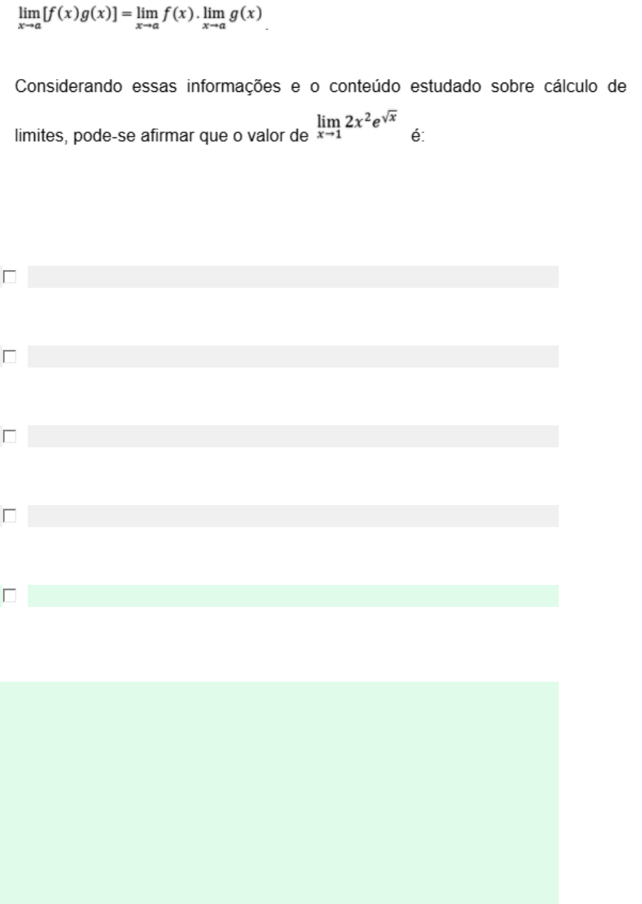 <p>1. As operações envolvendo limites dependem de algumas regras para serem calculadas,</p><p>tais como a regra do limite do produto entre funções:</p><p>Ocultar opções de resposta</p><p>8e</p><p>e e</p><p>4e 4e</p><p>Correta:</p><p>2e 3e</p><p>Resposta correta</p><p>2. Pergunta 2</p><p>0/0,1</p><p>O gráfico de uma função polinomial do segundo grau na forma , é uma curva chamada</p><p>parábola.</p><p>A interseção do eixo de simetria com a parábola é um ponto conhecido como vértice da</p><p>parábola. As coordenadas do vértice são dadas por:</p><p>Dada função da parábola , é correto afirmar que a posição do vértice dessa parábola é:</p><p>Ocultar opções de resposta</p><p>Incorreta:</p><p>Resposta correta:</p><p>3. Pergunta 3</p><p>0,1/0,1</p><p>A função cosseno é uma função trigonométrica expressa simbolicamente por e que</p><p>possui período igual a , domínio igual ao conjunto dos números reais , conjunto</p><p>imagem no intervalo [-1,1] e seu gráfico é representado por uma curva denominada</p><p>cossenoide.</p><p>Considerando essas informações, o conteúdo estudado sobre funções trigonométricas</p><p>e a função , pode-se afirmar que a função g(x) representada no gráfico abaixo é:</p><p>Ocultar opções de resposta</p><p>Correta:</p><p>Resposta correta</p><p>4. Pergunta 4</p><p>0,1/0,1</p><p>Os valores dos limites de três funções distintas, quando x tende a -2 são dados a</p><p>seguir:</p><p>Ocultar opções de resposta</p><p>5.</p><p>Correta:</p><p>-6.</p><p>Resposta correta</p><p>0.</p><p>-5.</p><p>-3.</p><p>5. Pergunta 5</p><p>0,1/0,1</p><p>O teorema do valor intermediário descreve uma propriedade das funções contínuas:</p><p>para qualquer função que seja contínua em um intervalo [a, b], a função vai assumir</p><p>qualquer valor entre e nesse intervalo.</p><p>Considerando uma função contínua, onde e , é correto afirmar que a afirmativa</p><p>garantida pelo teorema do valor intermediário é:</p><p>Ocultar opções de resposta</p><p>Correta:</p><p>, para pelo menos um c entre -4 e 1.</p><p>Resposta correta</p><p>, para pelo menos um c entre -4 e 1.</p><p>, para pelo menos um c entre -4 e 1.</p><p>, para pelo menos um c entre 3 e 5.</p><p>, para pelo menos um c entre 3 e 5.</p><p>6. Pergunta 6</p><p>0,1/0,1</p><p>Uma função pode ser representada de forma algébrica, gráfica ou através de uma</p><p>tabela, na qual os valores da variável x são associados aos respectivos valores f(x) f(x),</p><p>conforme exemplo a seguir:</p><p>A</p><p>partir da tabela dada, é correto afirmar que o valor do limite da função f(x) f(x) quando</p><p>x tende ao infinito é:</p><p>Ocultar opções de resposta</p><p>2</p><p>3</p><p>Correta:</p><p>1</p><p>Resposta correta</p><p>5</p><p>4</p><p>7. Pergunta 7</p><p>0,1/0,1</p><p>Em matemática financeira, existe uma expressão matemática utilizada para o cálculo</p><p>do montante final de uma aplicação após um período e uma taxa determinada data</p><p>por , onde C é o capital inicial, i é a taxa de juros ou rendimento e t é o período</p><p>analisado.</p><p>Suponha que em uma aplicação que rende 10% ao ano foram investidos R$ 1.000.</p><p>Considerando essas informações e os conteúdos estudados, pode-se afirmar que o</p><p>montante total resgatado passados 2 anos de investimento é:</p><p>Ocultar opções de resposta</p><p>R$ 1110.</p><p>R$ 1510.</p><p>R$ 1310.</p><p>Correta:</p><p>R$ 1210.</p><p>Resposta correta</p><p>R$ 1410.</p><p>8. Pergunta 8</p><p>0,1/0,1</p><p>Toda função definida pela forma , com e é denominada função logarítmica de base ª.</p><p>Ao determinar alguns pontos pertencentes à função, é possível determinar um esboço</p><p>do seu gráfico ou analisar um gráfico fornecido.</p><p>Considerando essas informações e o conteúdo estudado sobre função logarítmica,</p><p>pode-se afirmar que o gráfico da função é:</p><p>1</p><p>2</p><p>3</p><p>4</p><p>5</p><p>Ocultar opções de resposta</p><p>3</p><p>Correta:</p><p>1</p><p>Resposta correta</p><p>5</p><p>4</p><p>2</p><p>9. Pergunta 9</p><p>0,1/0,1</p><p>É possível obter a equação da reta que representa uma função polinomial de primeiro</p><p>grau da forma y = ax + b quando conhecemos dois pontos pertencentes a essa reta.</p><p>Sabendo que uma reta passa pelos pontos (2,8) e (3,11), pode-se afirmar que o valor</p><p>do coeficiente angular a e o coeficiente linear b da equação dessa reta são,</p><p>respectivamente:</p><p>Ocultar opções de resposta</p><p>a=-3 a=-3 e b=2 b=2</p><p>a=-3 a=-3 e b=-2 b=-2</p><p>Correta:</p><p>a=3 a=3 e b=2 b=2</p><p>Resposta correta</p><p>a=3 a=3 e b=-2 b=-2</p><p>a=2 a=2 e b=3 b=3</p><p>10. Pergunta 10</p><p>0,1/0,1</p><p>As funções trigonométricas são definidas pela divisão entre dois lados de um triangulo</p><p>retângulo e têm como variável independente um ângulo. As funções trigonométricas</p><p>são denominadas por função seno, cosseno, tangente, cotangente, secante e cossecante.</p><p>A função seno é definida simbolicamente por</p><p>Considerando essas informações e o conteúdo estudado sobre funções</p><p>trigonométricas, analise as afirmativas a seguir.</p><p>I. O domínio da função seno consiste em todos os números reais</p><p>II. A função seno possui conjunto imagem .</p><p>III. A curva da função seno é chamada de cossenóide.</p><p>IV. A função seno possui período de .</p><p>Está correto apenas o que se afirma em:</p><p>Ocultar opções de resposta</p><p>Correta:</p><p>I, II e IV.</p><p>Resposta correta</p><p>III e IV.</p><p>II, III e IV.</p><p>II e III.</p><p>I e IV.</p>