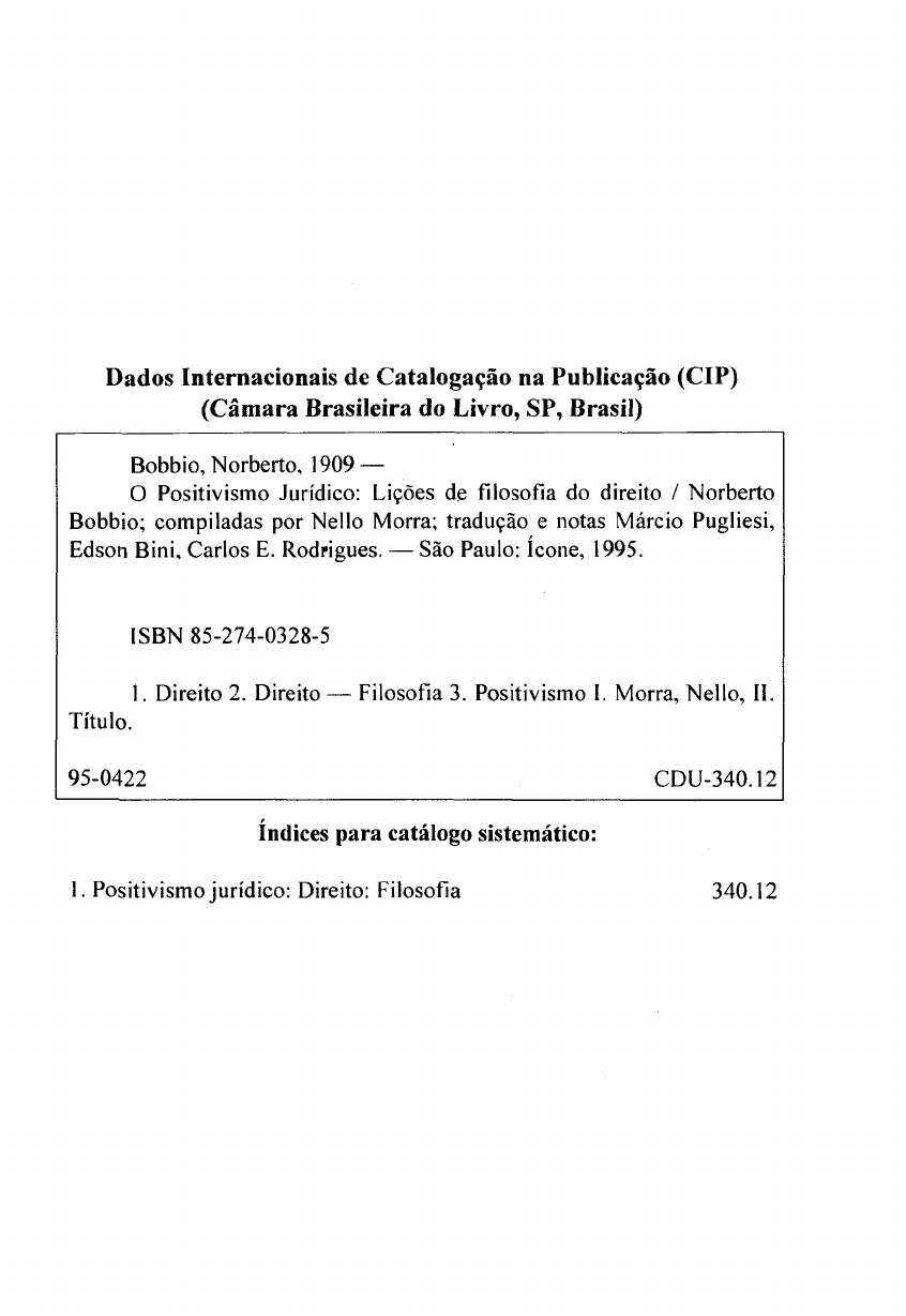 <p>Dados Internacionais de Catalogação na Publicação (CIP)</p><p>(Câmara Brasileira do Livro, SP, Brasil)</p><p>Bobbio, Norberto, 1909 —</p><p>O Positivismo Jurídico: Lições de filosofia do direito / Norberto</p><p>Bobbio; compiladas por Nello Morra; tradução e notas Márcio Pugliesi,</p><p>Edson Bini, Carlos E. Rodrigues. — São Paulo: ícone, 1995.</p><p>ISBN 85-274-0328-5</p><p>1. Direito 2. Direito — Filosofia 3. Positivismo I. Morra, Nello, II.</p><p>Título.</p><p>95-0422 CDU-340.12</p><p>índices para catálogo sistemático:</p><p>1. Positivismo jurídico: Direito: Filosofia 340.12</p><p>NORBERTO BOBBIO</p><p>O POSITIVISMO JURÍDICO</p><p>LIÇÕES DE FILOSOFIA DO DIREITO</p><p>compiladas pelo Dr. NELLO MORRA</p><p>Tradução e notas</p><p>Márcio Pugliesi, da Faculdade de Direito da Universidade</p><p>de São Paulo.</p><p>Edson Bini, da Faculdade de Filosofia da Universidade de São Paulo.</p><p>Carlos E. Rodrigues, da Faculdade de Direito da Pontifícia</p><p>Universidade Católica de São Paulo.</p><p>Aconee d i t o r a</p><p>G. Giapichelli Editore S.R.I.</p><p>Torino - Itália.</p><p>Direitos Reservados para língua portuguesa</p><p>ícone Editora Ltda, 1999.</p><p>Coleção Elementos de Direito</p><p>Coordenação Técnica</p><p>Carlos E. Rodrigues</p><p>Márcio Pugliesi</p><p>Produção e Capa</p><p>Anízio de Oliveira</p><p>Diagramação</p><p>Rosicler Freitas Teodoro</p><p>Revisão</p><p>Rosa Maria Cury Cardoso</p><p>Proibida a reprodução total ou parcial desta obra, de qualquer forma</p><p>ou meio eletrônico, mecânico, inclusive através de processos</p><p>xerográficos, sem permissão expressa do editor</p><p>(Lei na 5.988,14/12/1973).</p><p>Todos os direitos reservados pela</p><p>ÍCONE EDITORA LTDA.</p><p>Rua das Palmeiras, 213 — Sta. Cecília</p><p>CEP 01226-010 — São Paulo — SP</p><p>Tels./Fax.: (011)3666-3095</p><p>ÍNDICE</p><p>Prefácio à nova edição...........................................................................11</p><p>Parte I</p><p>AS ORIGENS HISTÓRICAS DO POSITIVISMO JURÍDICO</p><p>INTRODUÇÃO</p><p>1. Direito natural e direito positivo no pensamento clássico.............15</p><p>2. Direito natural e direito positivo no pensamento m edieval.......... 19</p><p>3. Direito natural e direito positivo no pensamento dos</p><p>jusnaturalistas dos séculos XVII e XVIII.................................... 20</p><p>4. Critérios de distinção entre direito natural e direito positivo.....22</p><p>Capítulo I — OS PRESSUPOSTOS HISTÓRICOS</p><p>5. Relações entre direito natural e direito positivo..........................25</p><p>6. O contexto histórico do positivismo jurídico.</p><p>A posição do juiz quanto à formação do direito</p><p>antes e depois do surgimento do Estado moderno........................ 26</p><p>7. Os eventos históricos do direito romano........................................30</p><p>8. “Common law” e “statute law” na Inglaterra:</p><p>sir Edward Coke e Thomas Hobbes............................................... 32</p><p>9. A monopolização do direito por parte do legislador na</p><p>concepção absolutista e na liberal. Montesquieu e Beccaria......37</p><p>10. A sobrevivência do direito natural nas concepções</p><p>jusfilosóficas do racionalismo no século XVIII.</p><p>As “lacunas do direito” .................................................................. 42</p><p>5</p><p>Capítulo II — AS ORIGENS DO POSITIVISMO</p><p>JURÍDICO NA ALEMANHA</p><p>11. A “Escola histórica do direito” como predecessora</p><p>do positivismo jurídico. Gustavo Hugo........................................45</p><p>12. As características do historicismo.</p><p>De Maistre, Burke, M õser.............................................................47</p><p>13. A escola histórica do direito. C. F. Savigny................................. 51</p><p>14. O movimento pela codificação do direito. Thibaut..................... 53</p><p>15. A polêmica entre Thibaut e Savigny sobre a codificação</p><p>do direito na Alemanha................................................................. 57</p><p>Capítulo III — O CÓDIGO DE NAPOLEÃO E AS ORIGENS</p><p>DO POSITIVISMO JURÍDICO NA FRANÇA</p><p>16. O significado histórico do Código de Napoleão.</p><p>A codificação Justiniana e a napoleônica.................................... 63</p><p>17. As concepções filosófico-jurídicas do iluminismo</p><p>inspiradoras da codificação francesa.</p><p>As declarações programáticas das Assembléias</p><p>revolucionárias............................................................................... 64</p><p>18. Os projetos de codificação de inspiração jusnaturalista:</p><p>Cambacérès.....................................................................................67</p><p>19. A elaboração e a aprovação do projeto definitivo: Portalis .... 71</p><p>20. As relações entre o juiz e a lei segundo o art. 42 do Código Civil.</p><p>O discurso preliminar de Portalis................................................. 73</p><p>21. A escola da exegese: as causas históricas do seu advento...........78</p><p>22. A escola da exegese: seus maiores expoentes e suas</p><p>características fundamentais......................................................... 83</p><p>Capítulo IV — AS ORIGENS DO POSITIVISMO JURÍDICO</p><p>NA INGLATERRA: BENTHAM E AUSTIN</p><p>23. Bentham: traços biográficos. A inspiração iluminista de</p><p>sua ética utilitarista.........................................................................91</p><p>6</p><p>24. Bentham: a crítica à common law e a teoria da codificação.... 96</p><p>25. Austin: a tentativa de mediação entre a escola histórica</p><p>alemã e o utilitarismo inglês.................................................... 101</p><p>26. Austin: sua concepção do direito positivo.............................. 105</p><p>27. Austin: a distinção entre direit