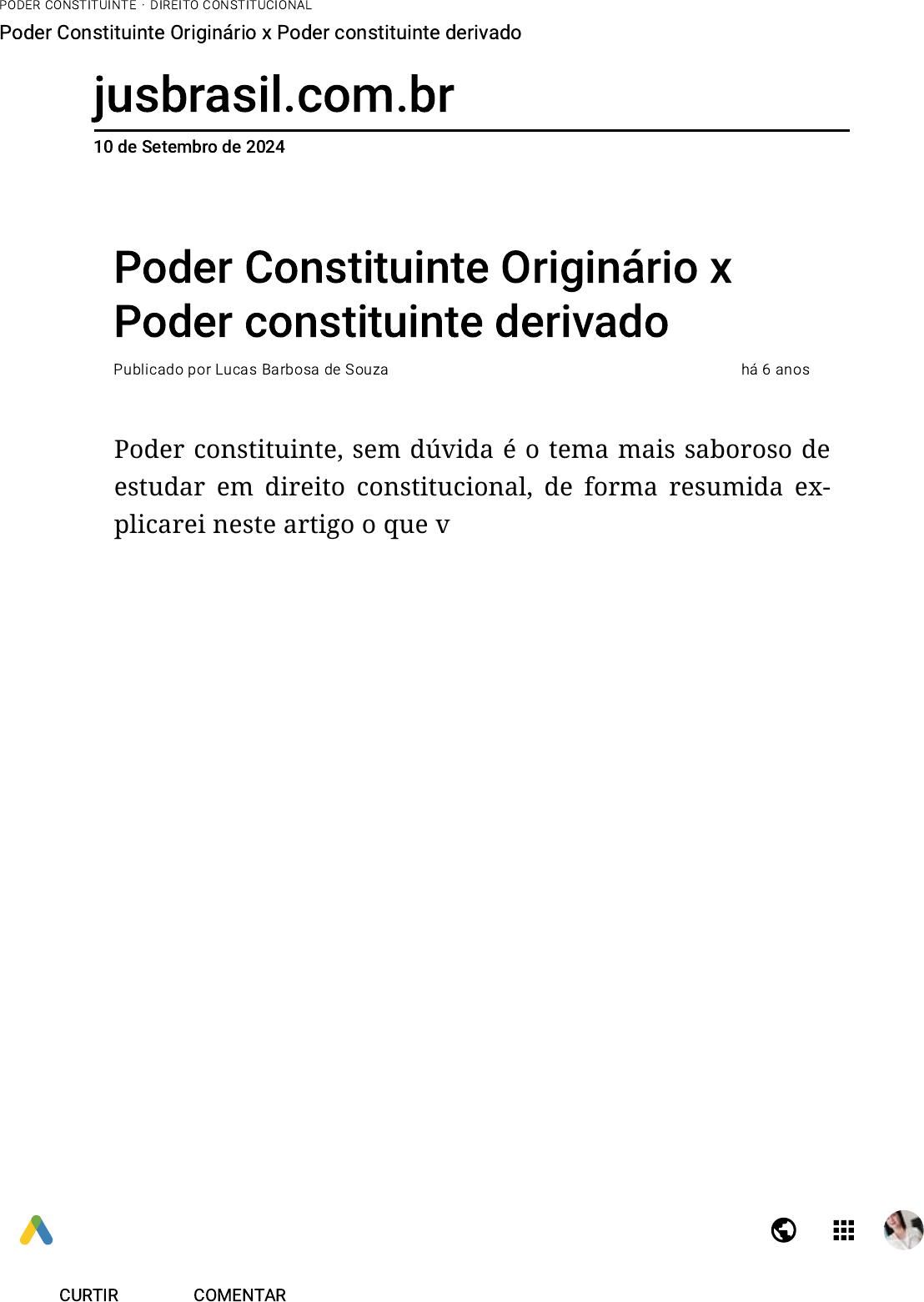 <p>jusbrasil.com.br</p><p>10 de Setembro de 2024</p><p>Poder Constituinte Originário x</p><p>Poder constituinte derivado</p><p>Publicado por Lucas Barbosa de Souza há 6 anos</p><p>Poder constituinte, sem dúvida é o tema mais saboroso de</p><p>estudar em direito constitucional, de forma resumida ex-</p><p>plicarei neste artigo o que vem a ser poder constituinte ori-</p><p>ginário e poder constituinte decorrente.</p><p>Poder constituinte, é um poder de origem popular, onde</p><p>povo através de seus representantes, cria-se a lei maior da-</p><p>quele estado ou seja a constituição.Não esquecendo que o</p><p>titular do poder constituinte é o povo.</p><p>Poder constituinte originário, vai inaugurar a primeira</p><p>constituição daquele estado ou uma nova constituição,</p><p>nossa primeira lei maior fora em 1824.O poder constituinte</p><p>originário é:Soberano, Autônomo, Inicial, Ilimitado e</p><p>Incondicionado.</p><p>Por outro bordo, o poder constituinte derivado é :Condici-</p><p>onado, limitado, sofrendo assim limitações.</p><p>O poder constituinte derivado tem três subdivisões: Poder</p><p>constituinte derivado Reformador, Poder constituinte</p><p>derivado revisor e Poder constituinte derivado</p><p>decorrente.</p><p>PODER CONSTITUINTE · DIREITO CONSTITUCIONAL</p><p>Poder Constituinte Originário x Poder constituinte derivado</p><p> CURTIR COMENTAR </p><p>https://lucas86souza.jusbrasil.com.br/</p><p>https://www.jusbrasil.com.br/legislacao/1503907193/constituicao-federal-constituicao-da-republica-federativa-do-brasil-1988</p><p>https://www.jusbrasil.com.br/legislacao/1503907193/constituicao-federal-constituicao-da-republica-federativa-do-brasil-1988</p><p>https://www.jusbrasil.com.br/legislacao/1503907193/constituicao-federal-constituicao-da-republica-federativa-do-brasil-1988</p><p>https://www.jusbrasil.com.br/</p><p>Poder constituinte derivado reformador é caracterizado</p><p>pela possibilidade de alterar o texto constitucional, mas</p><p>como supracitado sofre limitações para sua alteração, con-</p><p>forme o artigo 60 da CRFB. Um exemplo de limitação para</p><p>modificação da constituição são as cláusulas pétreas ou</p><p>seja, é impossível proposta de emenda constitucional ten-</p><p>dente a retira-la ou diminuir sua eficácia.</p><p>Poder constituinte derivado revisor, é responsável pela re-</p><p>visão da constituição após sua promulgação com previsão</p><p>no Art. 3º "A revisão constitucional será realizada após</p><p>cinco anos, contados da promulgação da Constituição, pelo</p><p>voto da maioria absoluta dos membros do Congresso Naci-</p><p>onal, em sessão unicameral.". Não se pode olvidar que o</p><p>quórum de votação do poder constituinte reformador é</p><p>mais complexo que o poder revisor enquanto o primeiro a</p><p>votação é de três quintos dos votos dos respectivos mem-</p><p>bros, o segundo é pelo voto da maioria absoluta dos mem-</p><p>bros do Congresso Nacional.</p><p>Já o poder constituinte derivado decorrente, é o poder in-</p><p>vestidos aos Estados Membros para elaborar sua própria</p><p>constituição, sendo assim possível a estes estabelecer sua</p><p>auto-organização, auto- administração, mas observando o</p><p>mandamento da CRFB.</p><p>Disponível em: https://www.jusbrasil.com.br/artigos/poder-constituinte-originario-x-poder-</p><p>constituinte-derivado/606153089</p><p>Informações relacionadas</p><p>Lincoln Paulino</p><p>Artigos • há 4 anos</p><p>PODER CONSTITUINTE · DIREITO CONSTITUCIONAL</p><p>Poder Constituinte Originário x Poder constituinte derivado</p><p>https://www.jusbrasil.com.br/legislacao/1503907193/constituicao-federal-constituicao-da-republica-federativa-do-brasil-1988</p><p>https://www.jusbrasil.com.br/topicos/10633322/artigo-60-da-constituicao-federal-de-1988</p><p>https://www.jusbrasil.com.br/legislacao/1503907193/constituicao-federal-constituicao-da-republica-federativa-do-brasil-1988</p><p>https://www.jusbrasil.com.br/legislacao/1503907193/constituicao-federal-constituicao-da-republica-federativa-do-brasil-1988</p><p>https://www.jusbrasil.com.br/legislacao/1503907193/constituicao-federal-constituicao-da-republica-federativa-do-brasil-1988</p><p>https://www.jusbrasil.com.br/topicos/10641719/artigo-3-da-constituicao-federal-de-1988</p><p>https://www.jusbrasil.com.br/legislacao/1503907193/constituicao-federal-constituicao-da-republica-federativa-do-brasil-1988</p><p>https://www.jusbrasil.com.br/legislacao/1503907193/constituicao-federal-constituicao-da-republica-federativa-do-brasil-1988</p><p>https://www.jusbrasil.com.br/legislacao/1503907193/constituicao-federal-constituicao-da-republica-federativa-do-brasil-1988</p><p>https://lincolnpaulino99.jusbrasil.com.br/</p><p>https://lincolnpaulino99.jusbrasil.com.br/</p><p>https://www.jusbrasil.com.br/</p>