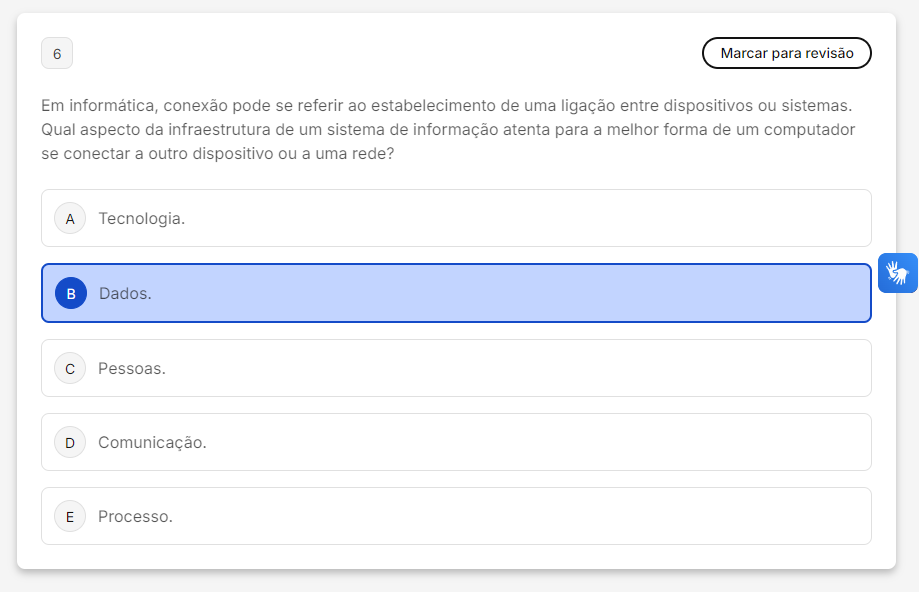 <p>6 Marcar para revisão Em informática, conexão pode se referir ao estabelecimento de uma ligação entre dispositivos ou sistemas. Qual aspecto da infraestrutura de um sistema de informação atenta para a melhor forma de um computador se conectar a outro dispositivo ou a uma rede? A Tecnologia. B C D Comunicação. E Processo.</p>