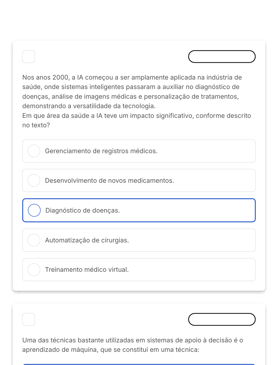 <p>08/10/24, 18:15</p><p>Page 1 of 8https://estacio.saladeavaliacoes.com.br/prova/67059d2cc686dd8eb0ab4469/</p><p>A</p><p>B</p><p>C</p><p>D</p><p>E</p><p>1 Marcar para revisão</p><p>Nos anos 2000, a IA começou a ser amplamente aplicada na indústria de</p><p>saúde, onde sistemas inteligentes passaram a auxiliar no diagnóstico de</p><p>doenças, análise de imagens médicas e personalização de tratamentos,</p><p>demonstrando a versatilidade da tecnologia.</p><p>Em que área da saúde a IA teve um impacto significativo, conforme descrito</p><p>no texto?</p><p>Gerenciamento de registros médicos.</p><p>Desenvolvimento de novos medicamentos.</p><p>Diagnóstico de doenças.</p><p>Automatização de cirurgias.</p><p>Treinamento médico virtual.</p><p>2 Marcar para revisão</p><p>Uma das técnicas bastante utilizadas em sistemas de apoio à decisão é o</p><p>aprendizado de máquina, que se constitui em uma técnica:</p><p>08/10/24, 18:15</p><p>Page 2 of 8https://estacio.saladeavaliacoes.com.br/prova/67059d2cc686dd8eb0ab4469/</p><p>A</p><p>B</p><p>C</p><p>D</p><p>E</p><p>A</p><p>B</p><p>C</p><p>D</p><p>Para a exploração e análise de dados, visando descobrir padrões e</p><p>regras, a princípio ocultos, importantes à aplicação.</p><p>Para se realizar a criptografia inteligente de dados, objetivando a</p><p>proteção da informação.</p><p>Que visa sua distribuição e replicação em um cluster de servidores,</p><p>visando aprimorar a disponibilidade de dados.</p><p>De compactação de dados, normalmente bastante eficiente,</p><p>permitindo grande desempenho no armazenamento de dados.</p><p>De transmissão e recepção de dados, permitindo a comunicação</p><p>entre servidores, em tempo real.</p><p>3 Marcar para revisão</p><p>O aprendizado de máquina comporta vários métodos de aprendizagem de</p><p>acordo com o sinal. Identifique a opção que exemplifica esses métodos:</p><p>Método de aprendizado inteligente e não inteligente</p><p>Método de aprendizado estruturado e não estruturado</p><p>Método de aprendizado supervisionado e não supervisionado</p><p>Método de aprendizado por classificação e regressão</p><p>08/10/24, 18:15</p><p>Page 3 of 8https://estacio.saladeavaliacoes.com.br/prova/67059d2cc686dd8eb0ab4469/</p><p>E</p><p>A</p><p>B</p><p>C</p><p>D</p><p>E</p><p>Método de aprendizado por associação e memorização</p><p>4 Marcar para revisão</p><p>Em uma rede neural artificial, esse componente é caracterizado como uma</p><p>coleção de números predeterminados contidos no programa, que são</p><p>multiplicados pelo valor digitado no nó oculto, e em seguida um único</p><p>número é criado adicionando entradas ponderadas. Assinale a alternativa</p><p>que apresenta para qual componente de uma rede neural artificial essa</p><p>definição é relevante.</p><p>Camada de saída (Output layer)</p><p>Camada oculta (Hidden layer)</p><p>Activation function (Função de ativação)</p><p>Camada de pesos (Weight layer)</p><p>Viés (Bias)</p><p>5 Marcar para revisão</p><p>Esse tipo de rede de deep learning são geralmente utilizadas para</p><p>reconhecimento de imagem e vídeo, detecção de objetos, reconhecimento</p><p>08/10/24, 18:15</p><p>Page 4 of 8https://estacio.saladeavaliacoes.com.br/prova/67059d2cc686dd8eb0ab4469/</p><p>A</p><p>B</p><p>C</p><p>D</p><p>E</p><p>A</p><p>B</p><p>reconhecimento de imagem e vídeo, detecção de objetos, reconhecimento</p><p>de caracteres, jogos (xadrez e Go) e reconhecimento de padrões e/ou visão</p><p>computacional. Qual das opções abaixo atende a essa definição?</p><p>Recurrent Neural Networks (RNN).</p><p>Generative Adversarial Network (GANs).</p><p>Autoencoders.</p><p>Redes Multilayer Perceptron.</p><p>Convolutional Neural Networks (CNN).</p><p>6 Marcar para revisão</p><p>Nessa arquitetura de rede neural artificial, apenas os neurônios vencedores</p><p>são propagados (ativados) no final de cada ciclo, determinados por quão</p><p>semelhantes são os requisitos de entrada e os neurônios. Possui</p><p>realimentação, ou seja, a saída de um neurônio é utilizada como entrada para</p><p>o próprio neurônio e/ou para outros neurônios das camadas anteriores.Essa</p><p>arquitetura é composta de duas camadas, a camada de entrada também é</p><p>chamada de ¿fonte¿ e a camada de saída também é chamada de "grau". Qual</p><p>opção abaixo corresponde, corretamente, a essa definição?</p><p>Rede ativa</p><p>Backpropagation</p><p>08/10/24, 18:15</p><p>Page 5 of 8https://estacio.saladeavaliacoes.com.br/prova/67059d2cc686dd8eb0ab4469/</p><p>C</p><p>D</p><p>E</p><p>A</p><p>B</p><p>C</p><p>D</p><p>E</p><p>Rede Competitiva</p><p>Feed Forward (Redes diretas)</p><p>Feed Backward Networks (Redes Recorrentes)</p><p>7 Marcar para revisão</p><p>Em uma rede convolutional neural network (CNN), essa camada é</p><p>responsável por conectar cada nó na camada de saída diretamente a um nó</p><p>na camada anterior. Essa camada realiza a tarefa de classificação com base</p><p>nas características extraídas das camadas anteriores e seus diferentes</p><p>filtros. Como é chamada essa camada em uma rede convolutional neural</p><p>network?</p><p>Camada totalmente conectada (Fully-Connected Layer).</p><p>Camada de saída (Output Layer).</p><p>Camada convolucional (Convolutional layer).</p><p>Camada de pooling (Pooling layer).</p><p>Activation layer (Camada de ativação).</p><p>08/10/24, 18:15</p><p>Page 6 of 8https://estacio.saladeavaliacoes.com.br/prova/67059d2cc686dd8eb0ab4469/</p><p>A</p><p>B</p><p>C</p><p>D</p><p>E</p><p>8 Marcar para revisão</p><p>No dia a dia de qualquer projeto de desenvolvimento é necessário</p><p>preocupar-se com a qualidade e posterior manutenção dos códigos. Isso</p><p>também ocorre em aplicações de visão computacional. Por isso mesmo, é</p><p>tão importante o uso de frameworks. Nesse sentido, selecione a opção</p><p>correta que apresente uma vantagem de usar frameworks para desenvolver<
