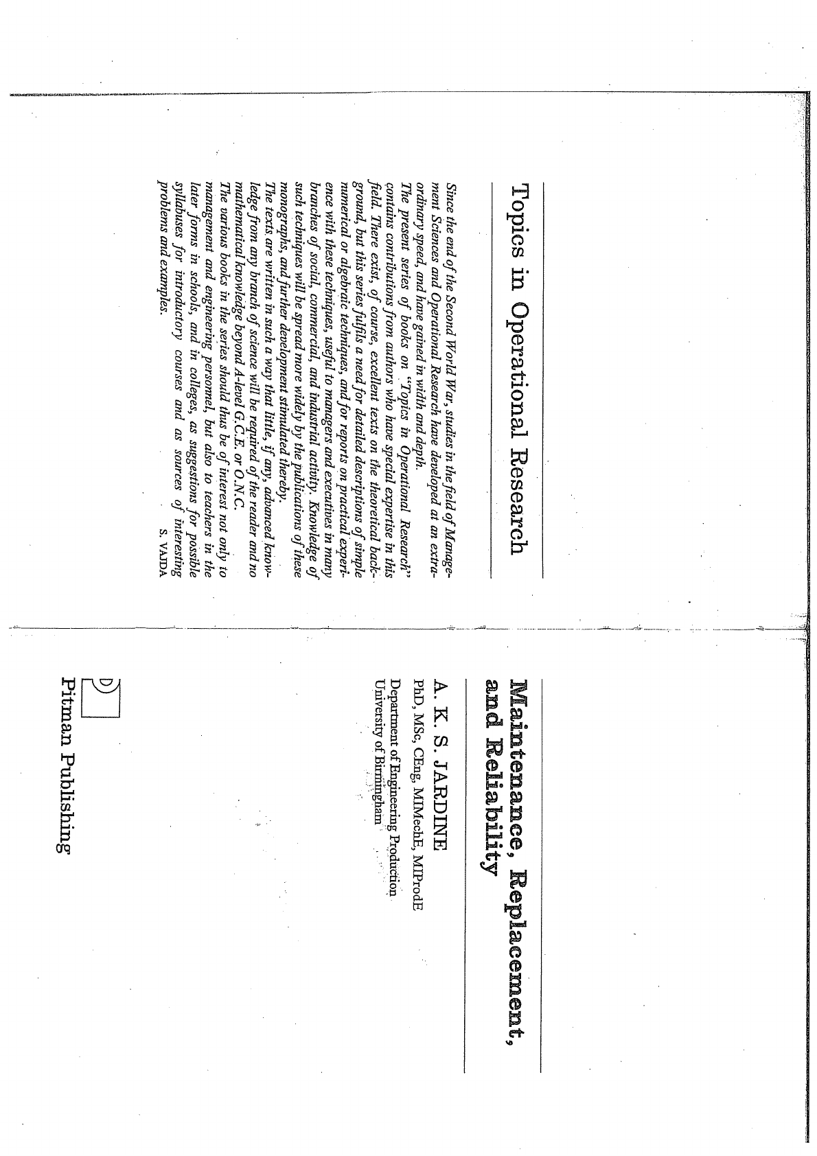 <p>Topics in Operational Research Maintenance, Replacement, and Reliability Since the end of the Second World War, studies in the field of Manage- ment Sciences and Operational Research have developed at an extra- A. K. S. JARDINE ordinary speed, and have gained in width and depth. PhD, MSc, CEng, MIMechE, MIProdE The present series of books on "Topics in Operational Research" contains contributions from authors who have special expertise in this Department of Engineering Production field. There exist, of course, excellent texts on the theoretical back- University of Birmingham ground, but this series fulfils a need for detailed descriptions of simple numerical or algebraic techniques, and for reports on practical experi- ence with these techniques, useful to managers and executives in many branches of social, commercial, and industrial activity. Knowledge of such techniques will be spread more widely by the publications of these monographs, and further development stimulated thereby. The texts are written in such a way that little, if any, advanced know- ledge from any branch of science will be required of the reader and no mathematical knowledge beyond A-level G.C.E. or O.N.C. The various books in the series should thus be of interest not only to management and engineering personnel, but also to teachers in the later forms in schools, and in colleges, as suggestions for possible syllabuses for introductory courses and as sources of interesting problems and examples. S. VAJDA D Pitman Publishing</p><p>First published 1973 SIR ISAAC PITMAN AND SONS LTD. Pitman House, Parker Street, Kingsway, London, WC2B 5PB P.O. Box 46038, Portal Street, Nairobi, Kenya SIR ISAAC PITMAN (AUST.) PTY. LTD. Pitman House, 158 Bouverie Street, Carlton, Victoria 3053, Australia PITMAN PUBLISHING CORPORATION 6 East 43rd Street, New York, N.Y. 10017, U.S.A. SIR ISAAC PITMAN (CANADA) LTD. 495 Wellington St West, Toronto 135, Canada Preface THE COPP CLARK PUBLISHING COMPANY 517 Wellington St West, Toronto 135, Canada C Jardine 1973 ISBN: 0 273 UNIVERSITY TELFORD The purpose of this book is to introduce ways in which the concept of optimization, through the construction and solution of mathematical models, can be brought to bear on the resolution of decision-making 6202 problems associated with the maintenance, replacement and reliability 5 JAR of equipment. 2011 The book is self-contained given that the reader has a knowledge of mathematics of about A-level standard. In order not to complicate unnecessarily the mathematics used in the book, and to highlight the principles associated with optimization in decision-making, the various problems posed and analysed have been kept as simple as possible. By doing so, and then making comments when appropriate about limitations of the problem or the model constructed of the problem, it is hoped that the reader will be in a position where he can, with confidence, construct and solve mathematical models of his own particular problems. Chapter 1 introduces the rationale behind the formulation and solution of mathematical models of problems to improve maintenance decision making. Chapters 2 and 3 cover the basic concepts which the reader should be familiar with before he proceeds to the main chapters of the Text set in 10/11pt. Monotype Times Roman, printed by letterpress, book. Readers having a knowledge of probability, statistics and and bound in Great Britain at The Pitman Press, Bath discounting techniques may wish to omit these chapters, or simply have G3(T335/75) a cursory glance through them. In Chapter 2 aspects of statistics</p><p>vi Preface relevant to dealing with the probabilistic problems covered in the book are presented, and some of the more common failure distribu- tions of equipment are identified. The present value concept which is used when evaluating alternative capital replacement decisions and the economic consequences of other long term maintenance decisions is covered in Chapter 3. Chapters 4 to 9 cover the main decision areas associated with the maintenance, replacement and reliability of equipment. Within each chapter various problems are specified. The statement of the problem is given, a mathematical model is constructed and the conflicting features of the problem are resolved in order to obtain an optimum. Frequent use is made of illustrations to aid the reader's sion of the construction of the model. A numerical example is given Acknowledgements which illustrates the solution of the model and, when it is thought of possible benefit to the reader to assist his understanding of the solu- tion, a sample calculation is presented. A "further comments" section is given after each numerical example where any limitations of the problem posed and model constructed are given, along with possible extensions which may be necessary to analyse other similar problems. Many points which are important from a practical viewpoint are also included, for example difficulties of data collection and implementation. The material in the book is an outgrowth of given to I am indebted to Steven Vajda of the University of Birmingham for students on postgraduate courses of production engineering, opera- his many helpful comments on the original draft of the book. tional research, naval architecture, and quality and reliability engin- To Jim Gordon of Birmingham I offer my thanks for writing the eering, and post-experience courses for engineers of various disciplines simulation program used in Chapter 7 (Section 7.5). My thanks also and others, such as management scientists, interested in maintenance go to Ken Richardson of Monash University, Melbourne, for deriving decision making. Selected topics have been given to under- the downtime formula used in Chapter 8 (Section 8.7) and to my graduate students of civil, mechanical, production, electrical and colleagues at Strathclyde and Birmingham Universities who com- electronic engineering. The way in which the book has been writte
