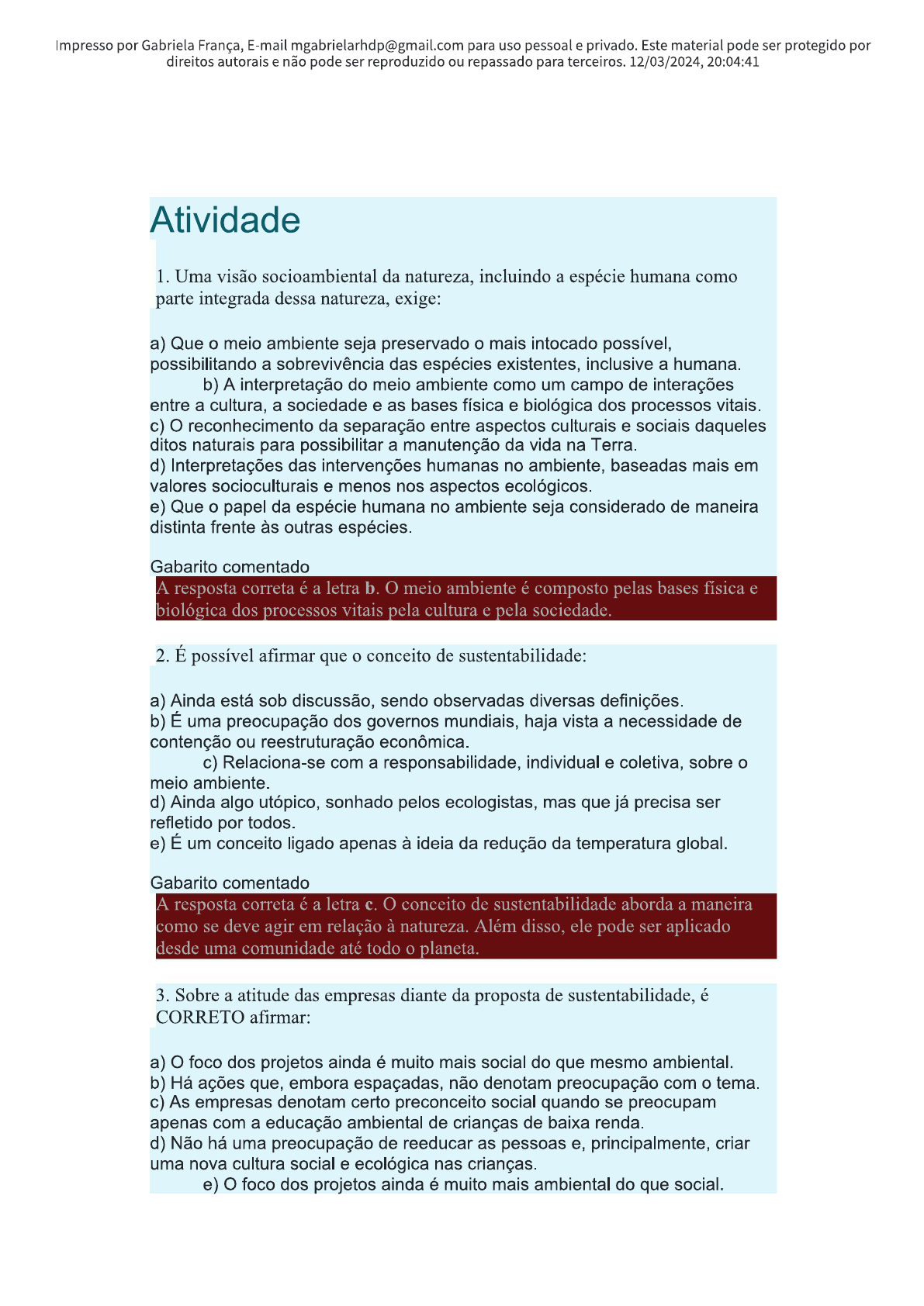 <p>Impresso por Gabriela França, E-mail para uso pessoal e privado. Este material pode ser protegido por direitos autorais e não pode ser reproduzido ou repassado para terceiros. 12/03/2024, 20:04:41 Atividade 1. Uma visão socioambiental da natureza, incluindo a espécie humana como parte integrada dessa natureza, exige: a) Que o meio ambiente seja preservado o mais intocado possível, possibilitando a sobrevivência das espécies existentes, inclusive a humana. b) A interpretação do meio ambiente como um campo de interações entre a cultura, a sociedade e as bases física e biológica dos processos vitais. c) O reconhecimento da separação entre aspectos culturais e sociais daqueles ditos naturais para possibilitar a manutenção da vida na Terra. d) Interpretações das intervenções humanas no ambiente, baseadas mais em valores socioculturais e menos nos aspectos ecológicos. e) Que o papel da espécie humana no ambiente seja considerado de maneira distinta frente às outras espécies. Gabarito comentado A resposta correta é a letra b. O meio ambiente é composto pelas bases física e biológica dos processos vitais pela cultura e pela sociedade. 2. É possível afirmar que o conceito de sustentabilidade: a) Ainda está sob discussão, sendo observadas diversas definições. b) É uma preocupação dos governos mundiais, haja vista a necessidade de contenção ou reestruturação econômica. c) Relaciona-se com a responsabilidade, individual e coletiva, sobre o meio ambiente. d) Ainda algo utópico, sonhado pelos ecologistas, mas que já precisa ser refletido por todos. e) É um conceito ligado apenas à ideia da redução da temperatura global. Gabarito comentado A resposta correta é a letra O conceito de sustentabilidade aborda a maneira como se deve agir em relação à natureza. Além disso, ele pode ser aplicado desde uma comunidade até todo planeta. 3. Sobre a atitude das empresas diante da proposta de sustentabilidade, é CORRETO afirmar: a) O foco dos projetos ainda é muito mais social do que mesmo ambiental. b) Há ações que, embora espaçadas, não denotam preocupação com o tema. c) As empresas denotam certo preconceito social quando se preocupam apenas com a educação ambiental de crianças de baixa renda. d) Não há uma preocupação de reeducar as pessoas e, principalmente, criar uma nova cultura social e ecológica nas e) O foco dos projetos ainda é muito mais ambiental do que social.</p><p>Impresso por Gabriela França, E-mail para uso pessoal e privado. Este material pode ser protegido por direitos autorais e não pode ser reproduzido ou repassado para terceiros. 12/03/2024, 20:04:41 Gabarito comentado A resposta correta é a letra e. Quando se fala em sustentabilidade aspecto ambiental é sempre mais explorado do que os aspectos sociais. 4. O homem construiu sua história por meio do constante processo de ocupação e transformação do espaço natural. Na verdade, o que variou, nos diversos momentos da experiência humana, foi a intensidade dessa exploração. Uma das consequências que pode ser atribuída à crescente intensificação da exploração de recursos naturais, facilitada pelo desenvolvimento tecnológico ao longo da história, é: a) A diminuição do comércio entre países e regiões, que se tornaram autossuficientes na produção de bens e serviços. b) A ocorrência de desastres ambientais de grandes proporções, como no caso de derramamento de óleo por navios petroleiros. c) A melhora generalizada das condições de vida da população mundial, a partir da eliminação das desigualdades econômicas na atualidade. d) O desmatamento, que eliminou grandes extensões de diversos biomas improdutivos, cujas áreas passaram a ser ocupadas por centros industriais modernos. e) O aumento demográfico mundial, sobretudo nos países mais desenvolvidos, que apresentam altas taxas de crescimento vegetativo. Gabarito comentado A resposta correta é a letra b. A exploração de recursos naturais aumentou a ocorrência de desastres ambientais de grandes proporções, como no caso de derramamento de óleo por navios petroleiros. 5. No presente, observa-se crescente atenção aos efeitos da atividade humana, em diferentes áreas, sobre o meio ambiente. É constante, nos fóruns internacionais e nas instâncias nacionais, a referência à sustentabilidade como princípio orientador de ações e propostas que deles emanam. A sustentabilidade explica-se pela: a) Incapacidade de se manter uma atividade econômica ao longo do tempo sem causar danos ao meio ambiente. b) Incompatibilidade entre crescimento econômico acelerado e preservação de recursos naturais e de fontes não renováveis de energia. c) Interação de todas as dimensões do bem-estar humano com o crescimento econômico, sem a preocupação com a conservação dos recursos naturais que estivera presente desde a Antiguidade. d) Proteção da biodiversidade em face das ameaças de destruição que sofrem as florestas tropicais devido ao avanço de atividades como a mineração, a monocultura, o tráfico de madeira e de espécies selvagens. e) Necessidade de se satisfazer as demandas atuais colocadas pelo desenvolvimento sem comprometer a capacidade de as gerações futuras</p><p>Impresso por Gabriela França, E-mail para uso pessoal e privado. Este material pode ser protegido por direitos autorais e não pode ser reproduzido ou repassado para terceiros. 12/03/2024, 20:04:41 atenderem suas próprias necessidades nos campos econômico, social e ambiental. Gabarito comentado A resposta correta é a letra e. A definição de sustentabilidade é encontrar uma forma de desenvolvimento que atenda às necessidades do presente sem comprometer a capacidade das próximas gerações de suprir as próprias necessidades. Atividade 1. "Satisfaz as necessidades presentes sem comprometer a capacidade das gerações futuras de suprir suas próprias necessidades." Essa definição está relacionada: a) Ao 