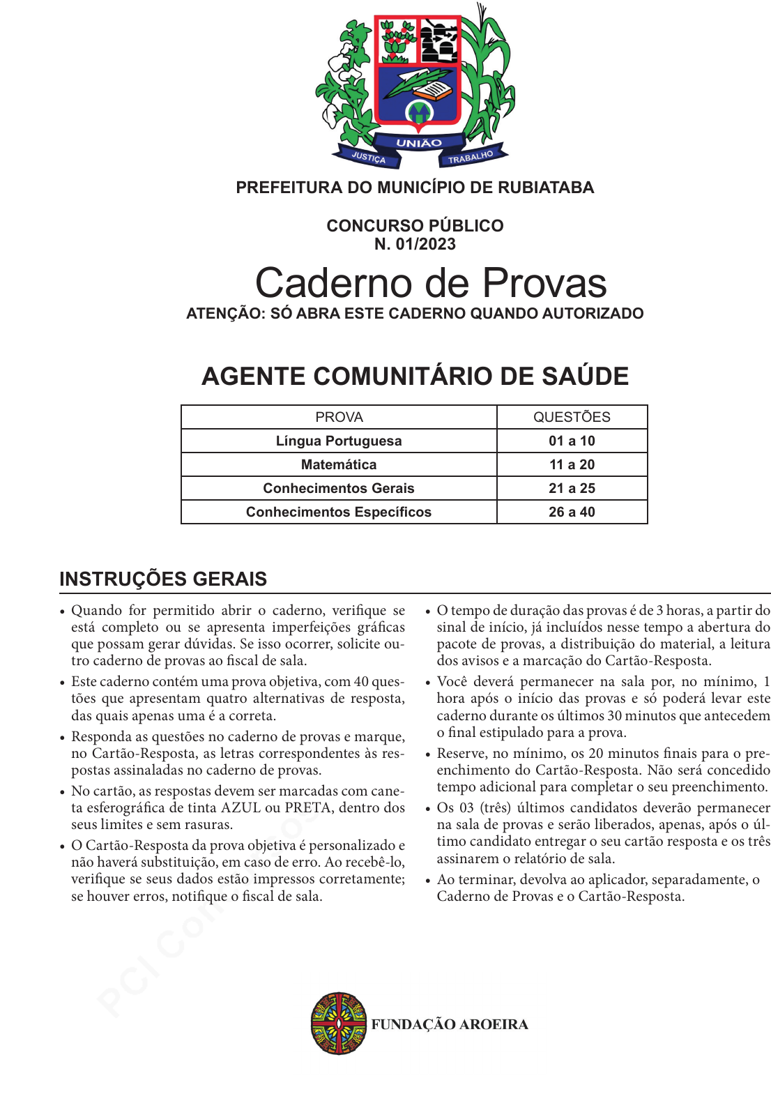 <p>pcimarkpci MDAwMDowMDAwOjAwMDA6MDAwMDowMDAwOmZmZmY6YjFjODo3ZTg5:VHVlLCAwOCBPY3QgMjAyNCAyMDo1MDowNCAtMDMwMA==</p><p>www.pciconcursos.com.br</p><p>AGENTE COMUNITÁRIO DE SAÚDE</p><p>INSTRUÇÕES GERAIS</p><p>PROVA QUESTÕES</p><p>Língua Portuguesa 01 a 10</p><p>Matemática 11 a 20</p><p>Conhecimentos Gerais 21 a 25</p><p>Conhecimentos Específi cos 26 a 40</p><p>Caderno de Provas</p><p>ATENÇÃO: SÓ ABRA ESTE CADERNO QUANDO AUTORIZADO</p><p>PREFEITURA DO MUNICÍPIO DE RUBIATABA</p><p>CONCURSO PÚBLICO</p><p>N. 01/2023</p><p>• Quando for permitido abrir o caderno, verifi que se</p><p>está completo ou se apresenta imperfeições gráfi cas</p><p>que possam gerar dúvidas. Se isso ocorrer, solicite ou-</p><p>tro caderno de provas ao fi scal de sala.</p><p>• Este caderno contém uma prova objetiva, com 40 ques-</p><p>tões que apresentam quatro alternativas de resposta,</p><p>das quais apenas uma é a correta.</p><p>• Responda as questões no caderno de provas e marque,</p><p>no Cartão-Resposta, as letras correspondentes às res-</p><p>postas assinaladas no caderno de provas.</p><p>• No cartão, as respostas devem ser marcadas com cane-</p><p>ta esferográfi ca de tinta AZUL ou PRETA, dentro dos</p><p>seus limites e sem rasuras.</p><p>• O Cartão-Resposta da prova objetiva é personalizado e</p><p>não haverá substituição, em caso de erro. Ao recebê-lo,</p><p>verifi que se seus dados estão impressos corretamente;</p><p>se houver erros, notifi que o fi scal de sala.</p><p>• O tempo de duração das provas é de 3 horas, a partir do</p><p>sinal de início, já incluídos nesse tempo a abertura do</p><p>pacote de provas, a distribuição do material, a leitura</p><p>dos avisos e a marcação do Cartão-Resposta.</p><p>• Você deverá permanecer na sala por, no mínimo, 1</p><p>hora após o início das provas e só poderá levar este</p><p>caderno durante os últimos 30 minutos que antecedem</p><p>o fi nal estipulado para a prova.</p><p>• Reserve, no mínimo, os 20 minutos fi nais para o pre-</p><p>enchimento do Cartão-Resposta. Não será concedido</p><p>tempo adicional para completar o seu preenchimento.</p><p>• Os 03 (três) últimos candidatos deverão permanecer</p><p>na sala de provas e serão liberados, apenas, após o úl-</p><p>timo candidato entregar o seu cartão resposta e os três</p><p>assinarem o relatório de sala.</p><p>• Ao terminar, devolva ao aplicador, separadamente, o</p><p>Caderno de Provas e o Cartão-Resposta.</p><p>pcimarkpci MDAwMDowMDAwOjAwMDA6MDAwMDowMDAwOmZmZmY6YjFjODo3ZTg5:VHVlLCAwOCBPY3QgMjAyNCAyMDo1MDowNCAtMDMwMA==</p><p>www.pciconcursos.com.br</p><p>2 25/02/2024CONCURSO PÚBLICO</p><p>LÍNGUA PORTUGUESA</p><p>TEXTO I</p><p>USUFRUTO</p><p>*Substantivo masculino.</p><p>1 Rubrica : termo jurídico.</p><p>Direito conferido a alguém [...] de gozar ou fruir</p><p>de um bem cuja propriedade pertence a outrem, de reti-</p><p>rar-lhe os frutos e as utilidades que produz. [...]</p><p>Instituto Antônio Houaiss. Dicionário eletrônico Houaiss da língua</p><p>portuguesa. Rio de Janeiro: Objetiva,2003. (Fragmento).</p><p>QUESTÃO 01</p><p>Considere o texto “Usufruto” e marque a função</p><p>de linguagem predominante nele:</p><p>A ( ) metalinguística.</p><p>B ( ) apelativa.</p><p>C ( ) fática.</p><p>D ( ) poética.</p><p>QUESTÃO 02</p><p>Considere o trecho: “Direito conferido a alguém”.</p><p>Na palavra “alguém” temos:</p><p>A ( ) dois dígrafos.</p><p>B ( ) um encontro consonantal e um dígrafo.</p><p>C ( ) dois encontros consonantais.</p><p>D ( ) um encontro consonantal e dois dígrafos.</p><p>TEXTO II</p><p>O GLOBO</p><p>O GLOBO – O senhor crê que a literatura tem al-</p><p>guma capacidade de provocar mudanças no mundo ? [...]</p><p>SARAMAGO – A resposta está na pergunta. Pre-</p><p>tendo tocar os leitores, estimular discussões. Mas isto</p><p>não significa que a literatura tenha poder para mudar</p><p>o mundo. Já não é pouco que seja capaz de exercer in-</p><p>fluência sobre algumas pessoas. O mundo é demasiado</p><p>grande, somos mais de sete bilhões os que habitamos</p><p>neste planeta, e o poder real está nas mãos das grandes</p><p>multinacionais que evidentemente não nasceram para</p><p>ser agentes da nossa felicidade.</p><p>O Globo. Rio de Janeiro, 20 mar. 2004. Disponível em:</p><p>http://oglobo.com/jornal/Suplementos/ProsaeVerso/141256336.asp.</p><p>Acesso em:15 jan.2024. (Fragmento).</p><p>QUESTÃO 03</p><p>Analise o texto acima. Pela resposta de Saramago,</p><p>infere-se que a literatura:</p><p>A ( ) tem o poder de modificar a realidade.</p><p>B ( ) não influencia em nada a vida das pessoas.</p><p>C ( ) é capaz de responder a perguntas que inquietam</p><p>os seres humanos.</p><p>D ( ) é apenas um passatempo para os que gostam.</p><p>QUESTÃO 04</p><p>Considere o trecho: “O mundo é demasiado gran-</p><p>de”. O vocábulo “demasiado” pode ser substituído, nesse</p><p>contexto, sem prejuízo de significado por:</p><p>A ( ) supérfluo.</p><p>B ( ) determinado.</p><p>C ( ) redundante.</p><p>D ( ) exagerado.</p><p>QUESTÃO 05</p><p>Considere o trecho: “...multinacionais que eviden-</p><p>temente não nasceram para ser agentes da nossa felici-</p><p>dade”. Marque a alternativa que apresenta o processo de</p><p>formação das palavras “evidentemente” e “felicidade”</p><p>respectivamente:</p><p>A ( ) derivação sufixal, derivação sufixal.</p><p>B ( ) derivação sufixal, derivação prefixal.</p><p>C ( ) derivação prefixal, derivação sufixal.</p><p>D ( ) derivação prefixal , derivação prefixal.</p><p>pcimarkpci MDAwMDowMDAwOjAwMDA6MDAwMDowMDAwOmZmZmY6YjFjODo3ZTg5:VHVlLCAwOCBPY3QgMjAyNCAyMDo1MDowNCAtMDMwMA==</p><p>www.pciconcursos.com.br</p><p>325/02/2024 CONCURSO PÚBLICO</p><p>TEXTO III</p><p>INIMIGOS</p><p>O apelido de Maria Teresa, para o Norberto, era</p><p>“Quequinha”. Depois do casamento, sempre que queria</p><p>contar para os outros uma de sua mulher, o N