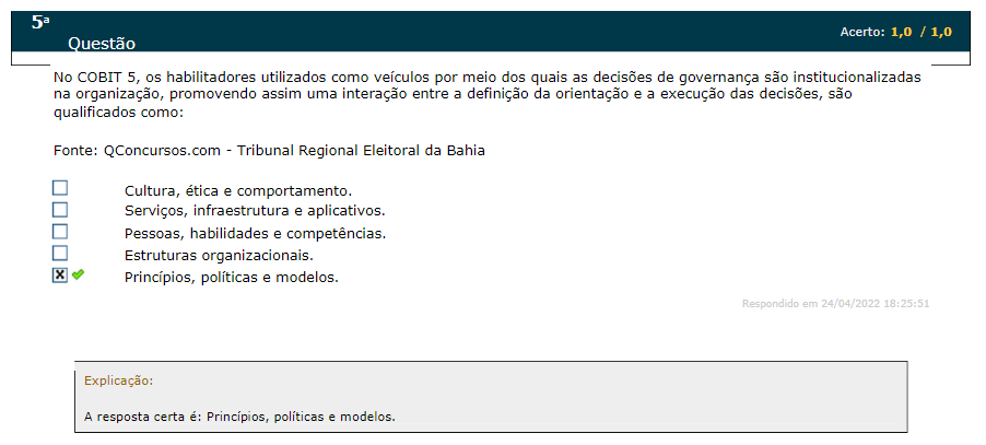 <p>Acerto: 1,0 / 1,0 Questão No COBIT 5, os habilitadores utilizados como veículos por meio dos quais as decisões de governança são institucionalizadas na organização, promovendo assim uma interação entre a definição da orientação e a execução das decisões, são qualificados como: Fonte: QConcursos.com - Tribunal Regional Eleitoral da Bahia Cultura, ética e comportamento. Serviços, infraestrutura e aplicativos. Pessoas, habilidades e competências. Estruturas organizacionais. Princípios, políticas e modelos. Respondido em 24/04/2022 18:25:51 Explicação: A resposta certa é: Princípios, políticas e modelos.</p>