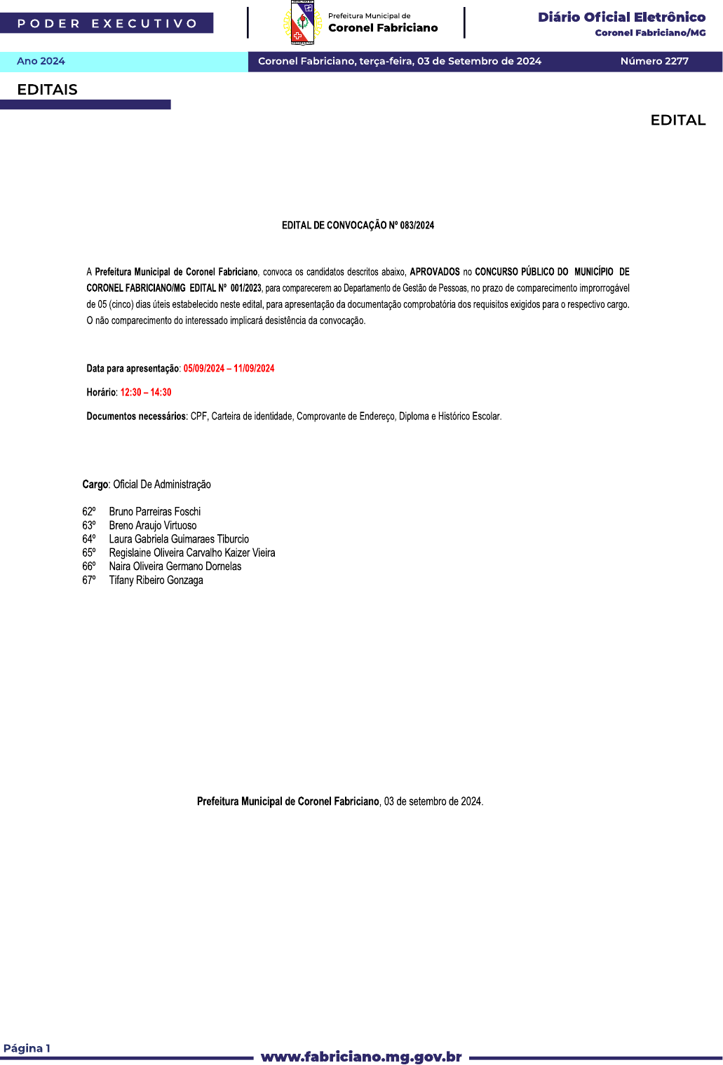 <p>Prefeitura Municipal de Diário Oficial Eletrônico PODER EXECUTIVO Coronel Fabriciano Coronel Fabriciano/MG Ano 2024 Coronel Fabriciano, terça-feira, 03 de Setembro de 2024 Número 2277 EDITAIS EDITAL EDITAL DE CONVOCAÇÃO 083/2024 A Prefeitura Municipal de Coronel Fabriciano, convoca os candidatos descritos abaixo, APROVADOS no CONCURSO PÚBLICO DO MUNICÍPIO DE CORONEL FABRICIANO/MG EDITAL para comparecerem ao Departamento de Gestão de Pessoas, no prazo de comparecimento improrrogável de 05 (cinco) dias úteis estabelecido neste edital, para apresentação da documentação comprobatória dos requisitos exigidos para 0 respectivo cargo. não comparecimento do interessado implicará desistência da convocação. Data para apresentação: 05/09/2024 - 11/09/2024 Horário: 12:30 14:30 Documentos necessários: Carteira de identidade, Comprovante de Endereço, Diploma e Histórico Escolar. Cargo: Oficial De Administração 62° Bruno Parreiras Foschi 63° Breno Araujo Virtuoso 64° Laura Gabriela Guimaraes Tiburcio 65° Regislaine Oliveira Carvalho Kaizer Vieira 66° Naira Oliveira Germano Dornelas Tifany Ribeiro Gonzaga Prefeitura Municipal de Coronel Fabriciano, 03 de setembro de 2024. Página 1</p>