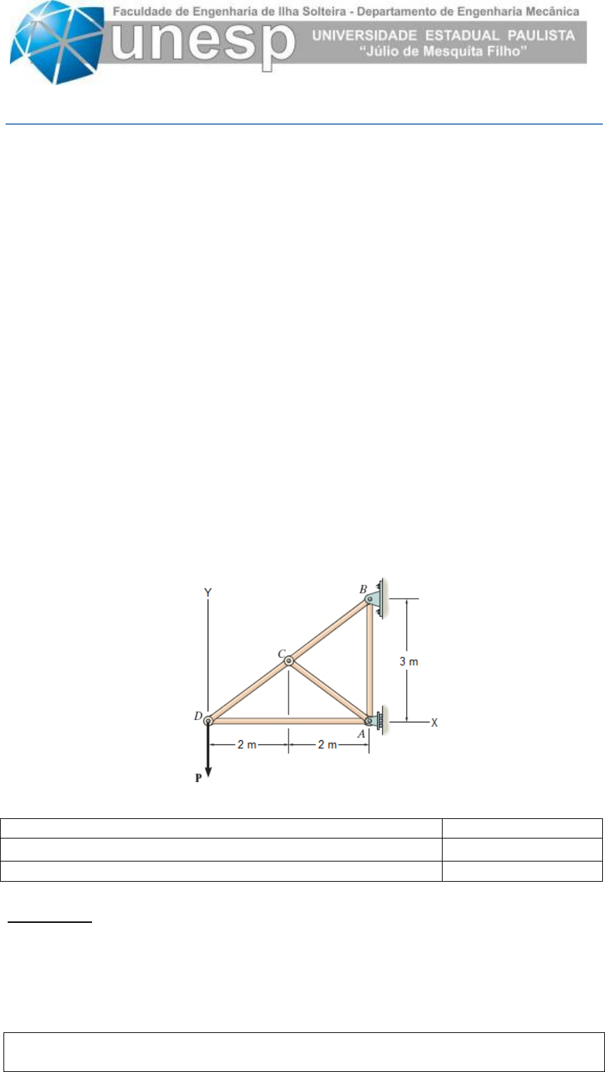 <p>Método dos Elementos Finitos – Mecânica dos Sólidos</p><p>Professor: Dr. Amarildo Tabone Paschoalini</p><p>EXERCÍCIO PARA ENTREGA - 01</p><p>Nome: ______________________________________ CPF:______________________</p><p>Considere a estrutura do tipo Treliça 2D mostrada na figura abaixo. Utilizando o</p><p>Método de Elementos Finitos calcule os deslocamentos dos pontos A, C e D, as reações</p><p>nos apoios A e B e as tensões axiais de tração ou compressão nas barras. A numeração</p><p>dos nós e elementos pode ser aleatória escolhida pelo aluno.</p><p>O Memorial de Cálculo deve ser feito à mão mostrando passo a passo todas as</p><p>equações, vetores e matrizes. Todos os cálculos e resultados feitos à mão devem ser</p><p>escaneados e deverá ser enviado um único arquivo em PDF com todas as páginas,</p><p>contanto as seguintes etapas:</p><p>• As matrizes de rigidez 4x4 no sistema de referência local de cada elemento;</p><p>• As matrizes de transformação 4x4 para cada elemento;</p><p>• As matrizes de rigidez 4x4 no sistema de referência global de cada elemento;</p><p>• A matriz de rigidez da estrutura no sistema de referência global;</p><p>• O vetor deslocamento resultante {u};</p><p>• O vetor carregamento resultante {f} com indicação das reações nos apoios;</p><p>• O vetor de tensões axiais {σ};</p><p>• Desenho simples da estrutura em escala com e sem deslocamentos.</p><p>Dados:</p><p>Módulo de Elasticidade 2,1 x 1011 [Pa]</p><p>Área da Seção A,BC x 10-3 [m2]</p><p>Força P P = 25,0 [kN]</p><p>Observação: Alguns dados variam de acordo com o CPF do aluno. Por exemplo, para o</p><p>CPF 123.456.789-00 (ABC.DEF.GHI-JJ): A=1, B=2, C=3, D=4, E=5, F=6, G=7, H=8,</p><p>I=9 e J=0, nesse caso a Área da Seção “A,BC x 10-3 [m2]” seria igual a</p><p>“1,23 x 10-3 [m2]”. Assim não se preocupem se os valores calculados não tiverem</p><p>sentido físico.</p><p>https://v3.camscanner.com/user/download</p><p>https://v3.camscanner.com/user/download</p><p>https://v3.camscanner.com/user/download</p><p>https://v3.camscanner.com/user/download</p><p>https://v3.camscanner.com/user/download</p><p>https://v3.camscanner.com/user/download</p>