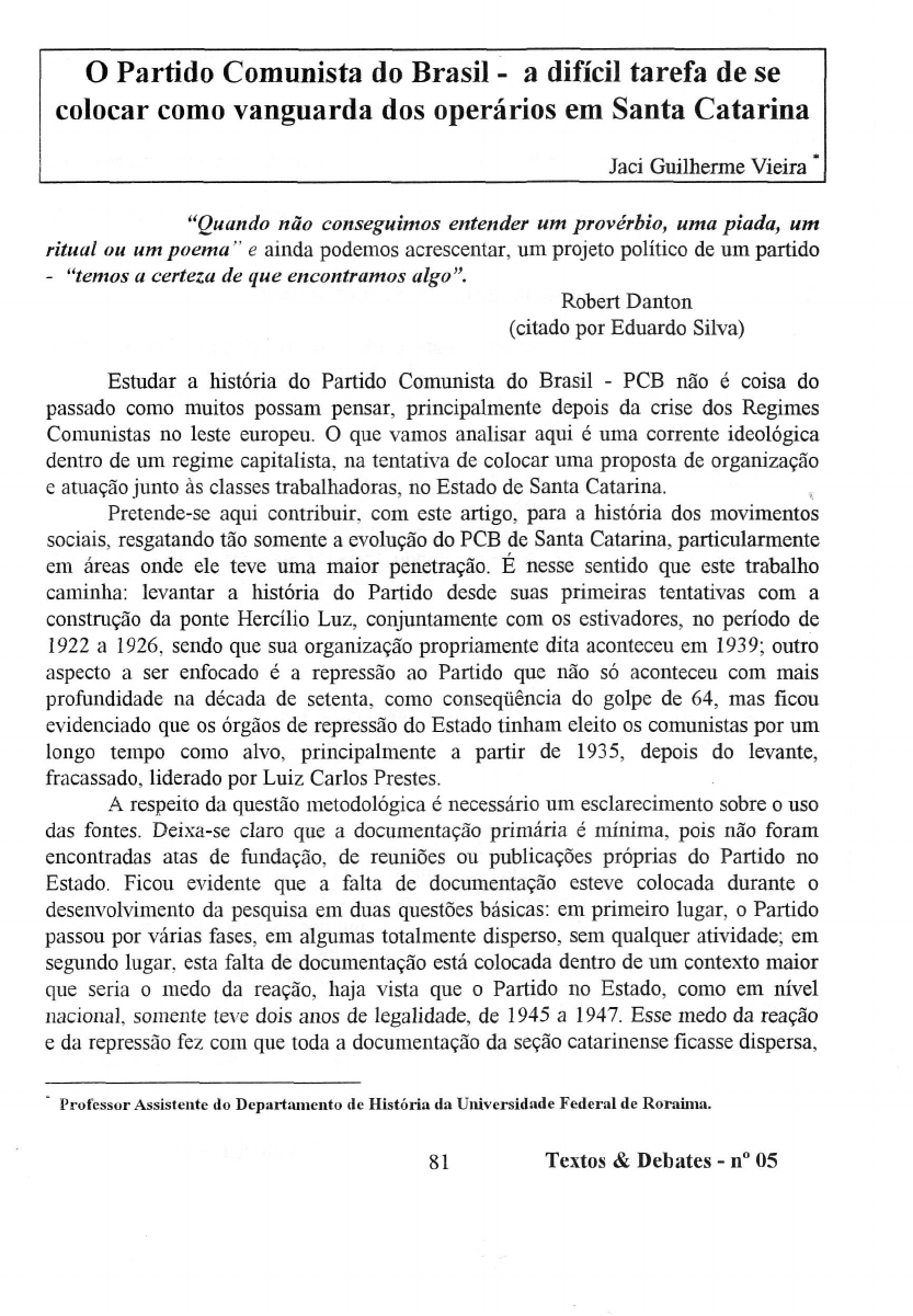<p>"Quando não conseguimos entender um provérbio, uma piada, um</p><p>ritual ou um poema' e ainda podemos acrescentar, um projeto político de um partido</p><p>- "temos a certeza de que encontramos algo".</p><p>Robert Danton</p><p>(citado por Eduardo Silva)</p><p>Estudar a história do Partido Comunista do Brasil - PCB não é coisa do</p><p>passado como muitos possam pensar, principalmente depois da crise dos Regimes</p><p>Comunistas no leste europeu. O que vamos analisar aqui é uma corrente ideológica</p><p>dentro de um regime capitalista, na tentativa de colocar uma proposta de organização</p><p>e atuação junto às classes trabalhadoras, no Estado de Santa Catarina.</p><p>Pretende-se aqui contribuir, com este artigo, para a história dos movimentos</p><p>sociais, resgatando tão somente a evolução do PCB de Santa Catarina, particularmente</p><p>em áreas onde ele teve uma maior penetração. É nesse sentido que este trabalho</p><p>caminha: levantar a história do Partido desde suas primeiras tentativas com a</p><p>construção da ponte Hercílio Luz, conjuntamente com os estivadores, no período de</p><p>1922 a 1926, sendo que sua organização propriamente dita aconteceu em 1939; outro</p><p>aspecto a ser enfocado é a repressão ao Partido que não só aconteceu com mais</p><p>profundidade na década de setenta, como consequência do golpe de 64, mas ficou</p><p>evidenciado que os órgãos de repressão do Estado tinham eleito os comunistas por um</p><p>longo tempo como alvo, principalmente a partir de 1935, depois do levante,</p><p>fracassado, liderado por Luiz Carlos Prestes.</p><p>A respeito da questão metodológica é necessário um esclarecimento sobre o uso</p><p>das fontes. Deixa-se claro que a documentação primária é mínima, pois não foram</p><p>encontradas atas de fundação, de reuniões ou publicações próprias do Partido no</p><p>Estado. Ficou evidente que a falta de documentação esteve colocada durante o</p><p>desenvolvimento da pesquisa em duas questões básicas: em primeiro lugar, o Partido</p><p>passou por várias fases, em algumas totalmente disperso, sem qualquer atividade; em</p><p>segundo lugar, esta falta de documentação está colocada dentro de um contexto maior</p><p>que seria o medo da reação, haja vista que o Partido no Estado, como em nível</p><p>nacional, somente teve dois anos de legalidade, de 1945 a 1947. Esse medo da reação</p><p>e da repressão fez com que toda a documentação da seção catarinense ficasse dispersa,</p><p>Professor Assistente do Departamento de História da Universidade Federal de Roraima.</p><p>81 Textos & Debates - n° 05</p><p>O Partido Comunista do Brasil - a difícil tarefa de se</p><p>colocar como vanguarda dos operários em Santa Catarina</p><p>Jaci Guilherme Vieira *</p><p>estando bem evidenciado no período aqui estudado. Para suprir a falta da</p><p>documentação escrita, recorreu-se à Técnica da história oral.</p><p>Por outro lado, este artigo busca dar algumas respostas a uma dezena de</p><p>questionamentos sobre a atuação do Partido em Santa Catarina, entre os quais</p><p>destacam-se: qual a origem do PCB do Estado? onde o Partido Comunista obteve uma</p><p>maior penetração? quais as formas que os militantes comunistas usavam para melhor</p><p>organizar a classe trabalhadora? e qual o comportamento desse Partido no período de</p><p>legalidade-1945 a 1947?</p><p>Origem do Partido Comunista do Brasil em Santa Catarina</p><p>Muito embora alguns autores, como Carlos Alberto Silveira Lenzi (1983),</p><p>afirmem que o Partido Comunista do Brasil - PCB em Santa Catarina tenha sido</p><p>fundado conjuntamente com a Aliança Nacional Libertadora (ANL), em 12 de março</p><p>de 1935, percebe-se que tal afirmação não tem base sólida e carece de um estudo mais</p><p>aprofundado. Em seu trabalho, o autor não apresenta qualquer documento para dar</p><p>comprovação ao que afirma, isto é, um relato de um militante, uma nota de jornal ou</p><p>nem mesmo uma bibliografia específica. (Lenzi - 1983)</p><p>Ao contrário do que Lenzi afirma, o PCB em Santa Catarina se constituiu como</p><p>tal em 1939 e, por sua vez, só conseguindo registrar seus estatutos no Tribunal</p><p>Regional Eleitoral - TRE em 1941, segundo um dos seus fundadores, Manoel Alves</p><p>Ribeiro, mais conhecido como "Seu Mimo". Ele relata que um grupo em Santa</p><p>Catarina, mais precisamente em Florianópolis, teve uma breve participação na</p><p>formação e divulgação das ideias da Aliança Nacional Libertadora, no ano de 1935,</p><p>não em caráter de partido, pois o mesmo só organizou-se a partir de 1939.</p><p>Ao fazermos um breve estudo dessa agremiação política em âmbito estadual,</p><p>percebeu-se que a mesma não nasce como se fosse inspiração de alguns operários ou</p><p>mesmo alguns intelectuais da sociedade catarinense. Ao contrário do que se afirma na</p><p>historiografia corrente, a ideia inicial de se fundar o PCB em Santa Catarina data das</p><p>primeiras duas décadas do século XX, mais precisamente no início da construção da</p><p>ponte Hercílio Luz em Florianópolis. Na construção desta ponte reuniram-se operários</p><p>de vários municípios do Estado, de outros Estados e até mesmo de outras</p><p>nacionalidades que, conjuntamente com os operários da estiva, fizeram os primeiros</p><p>contatos para a fundação do ''Socorro Vermelho", um dos embriões do PCB em Santa</p><p>Catarina, que teve como objetivo arrecadar fundos em forma de colaboração</p><p>espontânea para mandar à União Soviética. Essa colaboração era enviada através da</p><p>Marinha Mercante do Brasil, o que pode vir a comprovar a hipótese de que os</p><p>primeiros contatos com os grupos comunistas em Santa Catarina foram feitos através</p><p>dos portos marítimos, e isso não só em Florianópolis, como também nos municípios de</p><p>São Francisco do Sul e Itajaí.</p><p>82 Textos & Debates - n° 05</