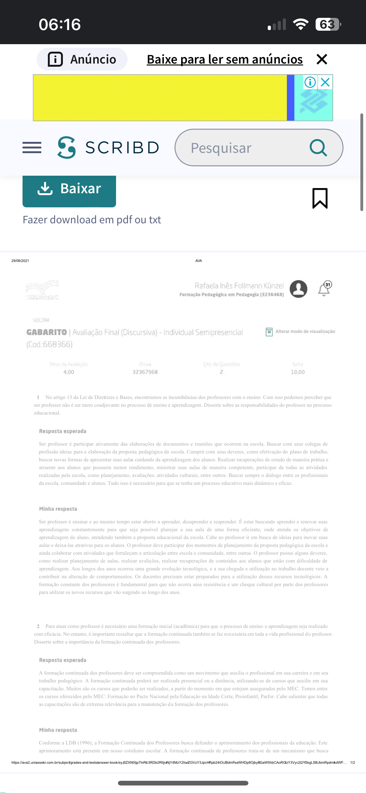 <p>06:16 63 i Anúncio Baixe para ler sem anúncios i X SCRIBD Pesquisar Baixar Fazer download em pdf ou txt 29/08/2021 AVA Rafaela Follmann Künzel 31 Formação em Pedagogia (3236468) VOLTAR GABARITO Avaliação Final (Discursiva) Individual Semipresencial Alterar modo de visualização Peso da Prova de Nota 4,00 32367968 2 10,00 1 No artigo 13 da Lei de Diretrizes e encontramos as incumbências dos professores com o Com isso podemos perceber que ser professor não é ser mero coadjuvante no processo de ensino e Disserte sobre as responsabilidades do professor no processo Resposta esperada Ser professor é participar ativamente das elaborações de documentos e reuniões que ocorrem na escola. Buscar com seus colegas de profissão ideias para a elaboração da proposta da Cumprir com seus como efetivação do plano de buscar novas formas de apresentar suas aulas cuidando da aprendizagem dos Realizar recuperações de estudo de maneira e atraente aos alunos que possuem menor rendimento, ministrar suas aulas de maneira competente, participar de todas as atividades realizadas pela escola, como planejamento, atividades culturais, entre Buscar sempre o diálogo entre os profissionais da escola, comunidade e Tudo isso é necessário para que se tenha um processo educativo mais dinâmico e Minha resposta Ser professor é ensinar e ao mesmo tempo estar aberto a desaprender e reaprender É estar buscando aprender e renovar suas aprendizagens constantemente para que seja possível planejar a sua aula de uma forma onde atenda os objetivos de aprendizagem do aluno, atendendo também a proposta educacional da Cabe ao professor em busca de ideias para inovar suas aulas e deixa-las atrativas para os alunos. professor deve participar dos momentos de planejamento da proposta pedagógica da escola e ainda colaborar com atividades que fortaleçam a articulação entre escola e entre professor possui alguns deveres, como realizar planejamento de aulas, realizar realizar recuperações de conteúdos aos alunos que estão com dificuldade de aprendizagem. Aos longos dos anos ocorreu uma grande evolução e a sua chegada e utilização no trabalho docente veio a contribuir na alteração de Os docentes precisam estar preparados para a utilização desses recursos tecnológicos. A formação constante dos professores é fundamental para que não ocorra uma resistência e um choque cultural por parte dos professores para utilizar os novos recursos que vão surgindo ao longo dos anos. 2 Para atuar como professor é necessário uma formação inicial (acadêmica) para que o processo de ensino e aprendizagem seja realizado com No entanto, é importante ressaltar que a formação continuada também se faz necessária em toda a vida profissional do professor Disserte sobre a importância da formação continuada dos Resposta esperada A formação continuada dos professores deve ser compreendida como um movimento que auxilia o profissional em sua carreira e em seu trabalho A formação continuada poderá ser realizada presencial ou a distância, utilizando-se de cursos que auxilie em sua capacitação. Muitos são os cursos que poderão ser a partir do momento em que estejam assegurados pelo Temos entre os cursos oferecidos pelo MEC: Formação no Pacto Nacional pela Educação na Idade Cabe salientar que todas as capacitações são de extrema relevância para a manutenção da formação dos professores Minha resposta Conforme a LDB a Formação Continuada dos Professores busca defender o aprimoramento dos profissionais da educação. Este aprimoramento presente em nosso cotidiano A formação continuada de professores trata-se de um mecanismo que busca 1/2</p>