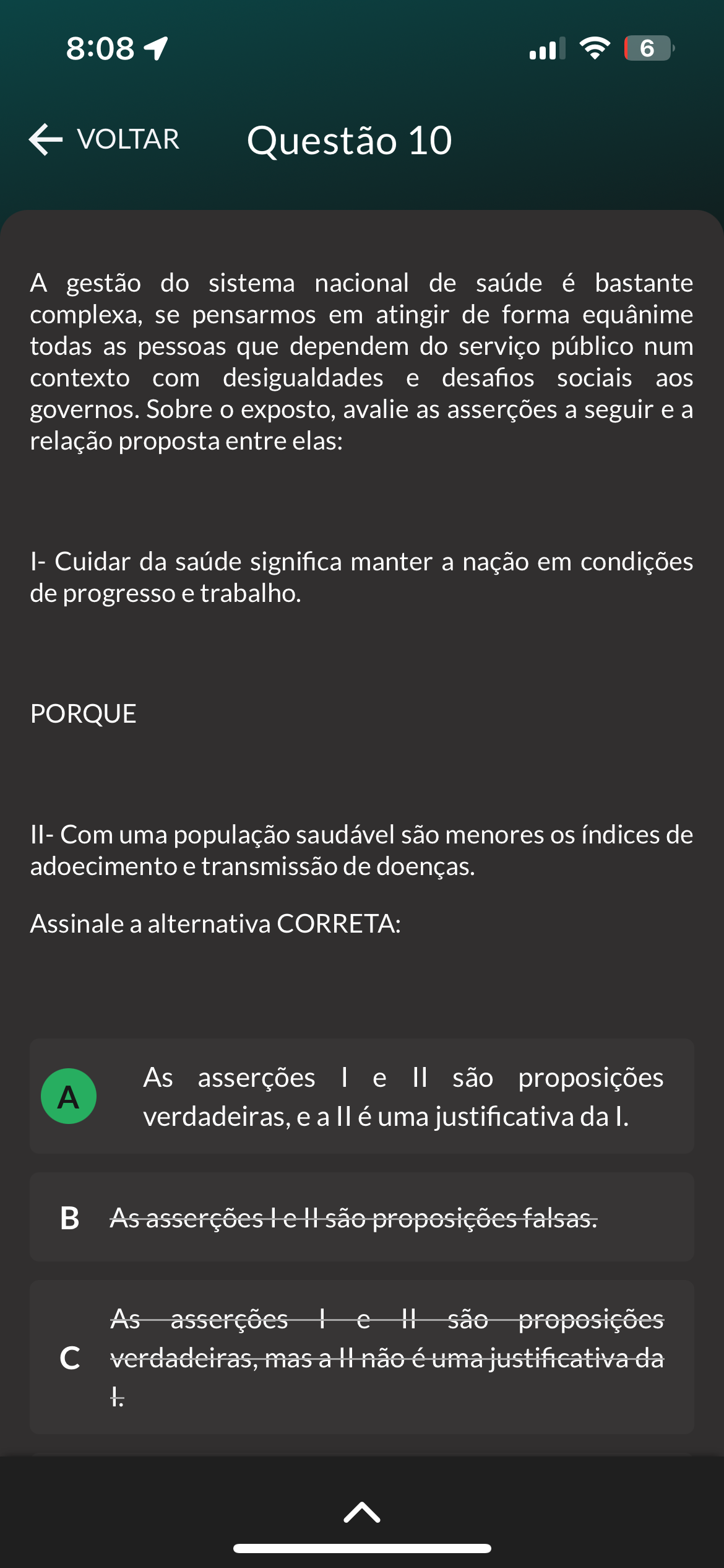 <p>8:08 6 VOLTAR Questão 10 A gestão do sistema nacional de saúde é bastante complexa, se pensarmos em atingir de forma equânime todas as pessoas que dependem do serviço público num contexto com desigualdades e desafios sociais aos governos. Sobre exposto, avalie as asserções a seguir e a relação proposta entre elas: I- Cuidar da saúde significa manter a nação em condições de progresso e trabalho. PORQUE II- Com uma população saudável são menores os índices de adoecimento e transmissão de doenças. Assinale a alternativa CORRETA: As asserções I e II são proposições A verdadeiras, e a II é uma justificativa da I. B As le proposições falsas. As asserções proposições verdadeiras, mas a não é uma justificativa da</p>