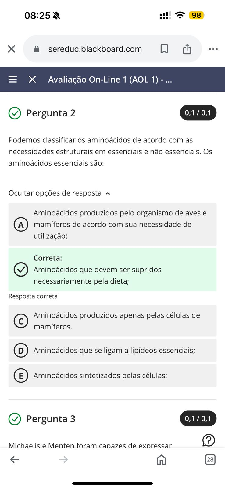 <p>08:25 98 X sereduc.blackboard.com X Avaliação On-Line 1 (AOL 1) - ... Pergunta 2 0,1/0,1 Podemos classificar os aminoácidos de acordo com as necessidades estruturais em essenciais e não essenciais. Os aminoácidos essenciais são: Ocultar opções de resposta Aminoácidos produzidos pelo organismo de aves e A mamíferos de acordo com sua necessidade de utilização; Correta: Aminoácidos que devem ser supridos necessariamente pela dieta; Resposta correta Aminoácidos produzidos apenas pelas células de mamíferos. D Aminoácidos que se ligam a lipídeos essenciais; E Aminoácidos sintetizados pelas células; Pergunta 3 0,1/0,1 ? Michaelis e Menten foram capazes de expressar 28</p>