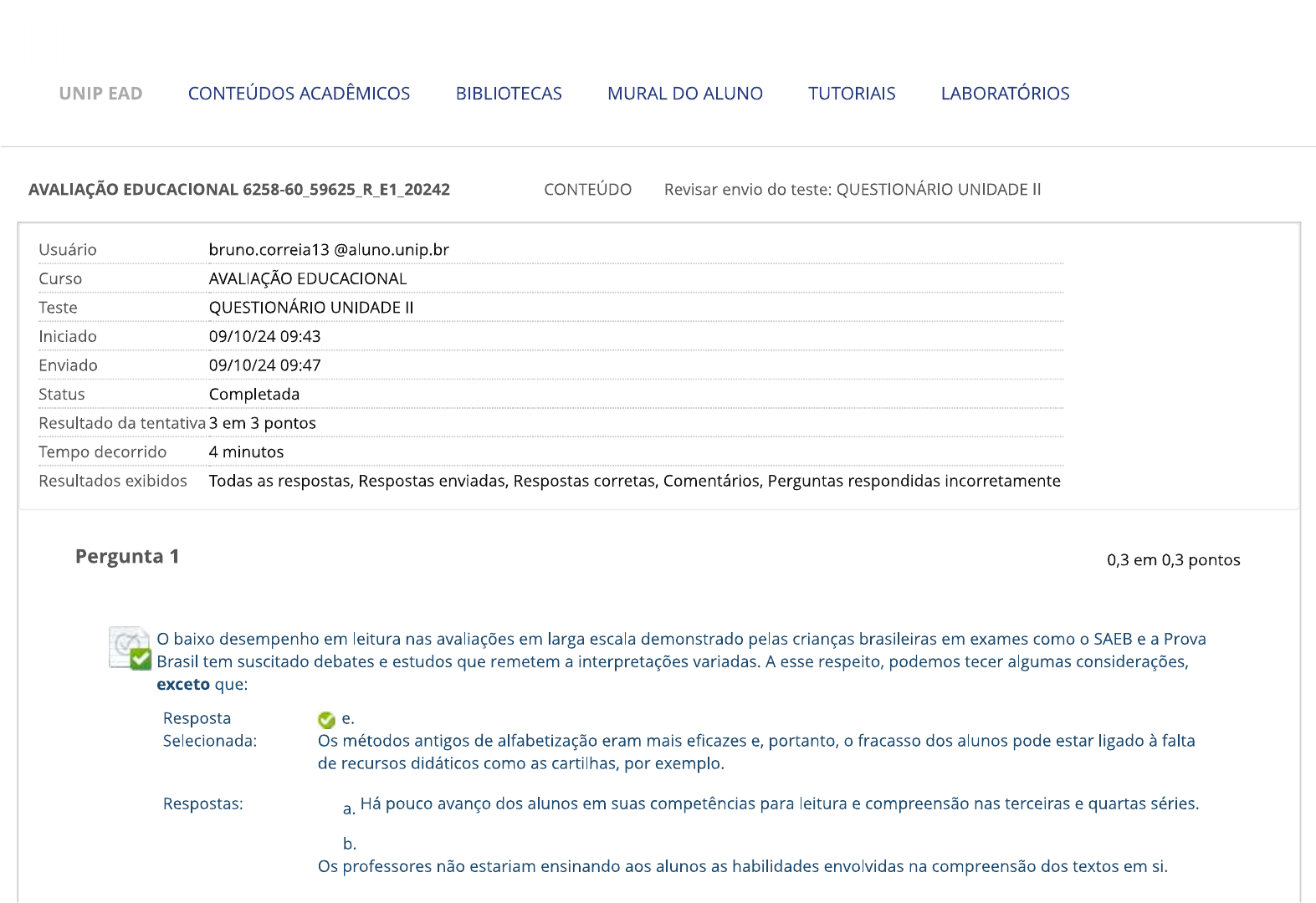 <p>UNIP EAD CONTEÚDOS ACADÊMICOS BIBLIOTECAS MURAL DO ALUNO TUTORIAIS LABORATÓRIOS AVALIAÇÃO EDUCACIONAL 6258-60_59625_R_E1_20242 CONTEÚDO Revisar envio do teste: QUESTIONÁRIO UNIDADE Usuário bruno.correia13@aluno.unip.br Curso AVALIAÇÃO EDUCACIONAL Teste QUESTIONÁRIO UNIDADE Iniciado 09/10/24 09:43 Enviado 09/10/24 09:47 Status Completada Resultado da tentativa 3 em 3 pontos Tempo decorrido 4 minutos Resultados exibidos Todas as respostas, Respostas enviadas, Respostas corretas, Comentários, Perguntas respondidas incorretamente Pergunta 1 0,3 em 0,3 pontos baixo desempenho em leitura nas avaliações em larga escala demonstrado pelas crianças brasileiras em exames como o SAEB e a Prova Brasil tem suscitado debates e estudos que remetem a interpretações variadas. A esse respeito, podemos tecer algumas considerações, exceto que: Resposta e. Selecionada: Os métodos antigos de alfabetização eram mais eficazes e, portanto, o fracasso dos alunos pode estar ligado à falta de recursos didáticos como as cartilhas, por exemplo. Respostas: a. Há pouco avanço dos alunos em suas competências para leitura e compreensão nas terceiras e quartas séries. b. Os professores não estariam ensinando aos alunos as habilidades envolvidas na compreensão dos textos em</p><p>C. fracasso da maioria dos alunos mostra que precisamos ampliar as discussões entre os educadores sobre o que é alfabetizar e como fazê-lo. d. Há uma ineficácia ou inexistência de mecanismos que ensinem respeitando a diversidade de ritmos dos alunos. e. Os métodos antigos de alfabetização eram mais eficazes e, portanto, o fracasso dos alunos pode estar ligado à falta de recursos didáticos como as cartilhas, por exemplo. Comentário da Alternativa: E resposta: Comentário: os estudos não têm demonstrado que os métodos antigos eram mais eficazes para desenvolver no aluno as habilidades de leitura e compreensão, mas fazem críticas a eles, pois eram baseados na memorização. Portanto a afirmativa na alternativa "e" está incorreta. Pergunta 2 0,3 em 0,3 pontos Quanto à Provinha Brasil, podemos afirmar que: I. A Provinha Brasil tem características de avaliação diagnóstica, na medida em que permite auxiliar os professores a identificar o desempenho dos alunos em processo de alfabetização. II. Na aplicação da prova, o próprio professor pode, além de aplicar, corrigir as questões, processar os resultados e interpretar os dados. III. Um dos objetivos da Provinha Brasil é indicar distorções e permitir o investimento em medidas que garantam melhor aprendizado e melhorar a qualidade do ensino. Assinale a alternativa correta: Resposta Selecionada: e. Todas as alternativas. Respostas: a. Somente a I.</p><p>b. Somente a afirmação II. C. Somente a afirmação III. d. Somente as afirmações e II e. Todas as alternativas. Comentário da Alternativa: E resposta: Comentário: todas as alternativas estão corretas, pois a Provinha Brasil pode ser um diagnóstico para os professores, mostrando os conhecimentos prévios dos alunos e permite a interpretação dos resultados e indica as medidas que serão necessárias para a melhoria do trabalho. Portanto, a alternativa correta é a Pergunta 3 0,3 em 0,3 pontos Analise o texto a seguir: "Chama a atenção que o MEC tenha optado pelo IDEB como referência de qualidade. Por que não construímos uma mediação baseada no custo aluno/qualidade, na qual se levaria em conta uma série de variáveis que são necessárias ao funcionamento adequado de uma escola de qualidade? Por que não definimos o que entendemos por uma escola que tenha condições de ensinar e não criamos um indicador mais amplo e sensível às desigualdades sociais?" (FREITAS, 2007. p. 981). Isso significa que: Resposta b. Selecionada: O IDEB foi criado com objetivo de detectar escolas cujos alunos apresentem baixa performance, mas não propõe indicadores que diminuam as desigualdades sociais. Respostas: a. O IDEB não é um parâmetro para o investimento em escolas e sistemas públicos de educação. b. O IDEB foi criado com o objetivo de detectar escolas cujos alunos apresentem baixa performance, mas não propõe indicadores que diminuam as desigualdades sociais.</p><p>C. O IDEB mostra que houve um grande avanço na qualidade do ensino na escola pública. d. O IDEB foi criado para definir a qualidade de uma escola mais sensível às desigualdades sociais e. O IDEB pode ser criticado por ser um parâmetro que tem como objetivo avaliar a função social da escola. Comentário da Alternativa: B resposta: Comentário: o IDEB deveria levar em conta varáveis que interferem nos resultados das avaliações dos alunos. Deveria apresentar soluções como mais investimentos nas escolas com maiores problemas sociais. Portanto, a alternativa "b" está respondendo a questão colocada pelo autor. Pergunta 4 0,3 em 0,3 pontos Sandra Zákia de Sousa faz críticas ao ENEM, ao afirmar que: "De modo explícito, fica demonstrada a visão individualista com que é tratado processo educacional, sendo atribuída, ao aluno, individualmente, a responsabilidade pelas eventuais competências ou incompetências evidenciadas pelo exame." (PERONI, p. 293) Diante do texto, a educadora revela que: Pelo seu caráter individualista, o ENEM não faz um diagnóstico dos graves problemas evidenciados no país. II- Para a autora, ao individualizar os resultados deixa de avaliar os fatores internos e externos que influenciam a educação. III- Ao atribuir ao potencial do aluno o seu sucesso, ou fracasso não relaciona os resultados à qualidade da educação ofertada pelo próprio Estado. IV- Ao fazer a leitura dos resultados obtidos, percebemos que os únicos fatores que devem ser analisados referem-se ao potencial dos alunos. Resposta Selecionada: d. Apenas as sentenças I, e III estão certas. Respostas: a. Apenas a sentença está certa. b. Apenas a sentença está certa. C. Apenas as sentenças I, II e IV estão certas. 