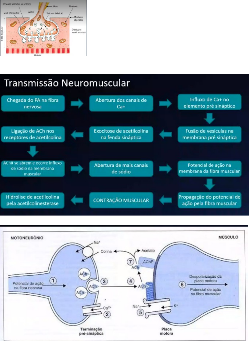 <p>20/04/2021 AULA PRATICA DE FISIOLOGIA</p><p>TRANSMISSÃO NEUROMUSCULAR</p><p>Junção neuromuscular é composta por um elemento pre-sinaptico</p><p>Como acontece a transmissão neuromuscular?</p><p>FARMACOS NA TRANSMISSÃO NEUROMUSCULAR</p><p>Existem farmacos que reforçam a transmissão neuromuscular, e outros que bloqueiam.</p><p>Não ocorre a liberação da acetilcolina; entao não transmite o sinal.</p><p>GRAFICO: A- CURARE C- TOXINA BUTOLINICA B-PLACA MOTORA NORMAL</p><p>Observatr que a e c não atingem o potencial de ação</p><p>FARMACOS QUE REFORÇAM A TRANSMISSÃO NEUROMUSCULAR</p><p>São agonistas colinergicos e podem agir de forma direta ou indireta;</p><p>se aplicarmos anticolinesterasico num paciente infectado com toxina butolinica, a gnt não vai obter nenhuma resposta pq a toxina butolinica impede a liberação da acetilcolina e sem ela ele não vai ter nenhuma resposta, pq ele só vai bloquear a enzima,</p><p>NICOTINICO. RECPTORES DE ACETILCOLINA</p><p>ISSO ACONTECE PQ JÁ HÁ UMA GRANDE QUANTIDADE DE SODIO DO LADO DE FORA DA MEMBRANA E O POTENCIAL ELETRICO MT NEGATIVO DENTO DA CELULA ATRAEM OS IONS SODIO. O INFLUXO DE SODIO VAI SUPERAR O EFLUXO DE POTASSIO.</p><p>CALCIO</p><p>OS DE AÇAO DIRETA ATUAM DIRETAMENTE SOBRE OS RECEPTORES DE ACETILCOLINA, MIMETIZANDO A ACETILCOLINA. OS DE AÇAO INDIRETA NÃO ATUM DIRETAMENTE SOBRE OS RECEPTORES DE ACETILCOLINA.</p><p>ELES PODEM TER COMO LOCAL DE AÇÃO OS RECEPTORES COLINERGICOS NICOTINICOS, COMO É O CASO DO CURARE. OU ELE PODEM ATUAR DE ALGUMA FORMA SOBRE A TRANSMISSÃO NEUROMUSCULAR, POR EXEMPLO, INTERFERINDO NA LIBERAÇÃO DE ACETILCOLINA Q É A TOXINA BUTOLINICA</p><p>ELES FICAM IMOVEIS!</p><p>DERMATOPOS, TIPOS DE DOR E HERPES</p><p>Os dematopos são areas cutaneas inervadas por fibras sensitivas de uma única raiz nervosa;</p><p>MECANISMOS DE SUPRESSÃO DA DOR</p><p>Sistema opiaceo e opioides:</p><p>Dopamina causa euforia, prazer, causando dependencia. Pode causar a depencia, pois diminui o numero de receptores e para obter o mesmo efeito de liberação de dopamina a pessoa tem q usar cada vez doses maiores.</p><p>Vicio em opiaceo</p><p>Acupuntura utilizada para tratamento de DTMs</p><p>Usada tambem como analgesico em implantes dentarios. Ponto IG4</p><p>NAS DUAS MÃOS</p><p>image6.png</p><p>image7.png</p><p>image8.png</p><p>image9.png</p><p>image10.png</p><p>image11.png</p><p>image12.png</p><p>image13.png</p><p>image14.png</p><p>image15.png</p><p>image16.png</p><p>image17.png</p><p>image18.png</p><p>image19.png</p><p>image20.png</p><p>image21.png</p><p>image22.png</p><p>image23.png</p><p>image24.png</p><p>image25.png</p><p>image26.png</p><p>image27.png</p><p>image28.png</p><p>image29.png</p><p>image30.png</p><p>image31.png</p><p>image32.png</p><p>image33.png</p><p>image34.png</p><p>image1.png</p><p>image2.png</p><p>image3.png</p><p>image4.png</p><p>image5.png</p>