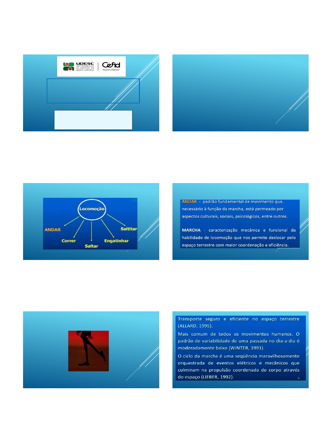 <p>24/05/2024</p><p>1</p><p>ASPECTOS CINESIOLÓGICOS</p><p>E</p><p>BIOMECÂNICOS DA MARCHA</p><p>Profª.Drª: Marta Cristina Rodrigues da Silva</p><p>Contato: martacrys1605@gmail.com</p><p>Florianópolis, 2024</p><p>Quais são as fases da caminhada? Quais eventos determinam</p><p>essas fases?</p><p>O que são os parâmetros espaço temporais da caminhada? Quais</p><p>variáveis biomecânicas da locomoção são habitualmente</p><p>analisadas?</p><p>Quais as principais diferenças entre as características da</p><p>caminhada e da corrida?</p><p>ANDAR X MARCHA</p><p>MARCHA HUMANA</p><p>1 2</p><p>3 4</p><p>5 6</p><p>24/05/2024</p><p>2</p><p>CINESIOLGIA DA MARCHA:</p><p>Principalmente</p><p>no plano</p><p>sagital</p><p>NA BIOMECÂNICA:</p><p>NO ESPORTE, NA FISIOTERAPIA....</p><p>IMPORTANTE..</p><p>causa</p><p>Redução</p><p>de flexão Efeito</p><p>A descrição da marcha humana</p><p>envolve medição e interpretação</p><p>de variáveis</p><p>Pelve</p><p>retroverti</p><p>da</p><p>Joelho</p><p>mais</p><p>fletido</p><p>EFEITOS:</p><p>Duração das fases, cadencia ,</p><p>comprimento do passo, cinemática</p><p>(deslocamento angulares e velocidades,</p><p>deslocamento do CG (harmonia do</p><p>movimentos coordenados dos MI , CG tem</p><p>movimento sinoidal, sem muita amplitude,</p><p>flutuação harmonica..e impactos externos</p><p>FR, grande efeito força no solo que reage e</p><p>quantifica as ações articulares e</p><p>musculares. Como se distribui na pressão</p><p>plantar e região</p><p>A caminhada pode ser dividida nas fases de apoio e de balanço.</p><p>Os eventos que determinam o início e fim de cada umas dessas</p><p>fases são a entrada do pé no solo e a saída do pé do chão.</p><p>As variáveis espaço temporais da caminhada são as variáveis</p><p>que descrevem de forma simples as características de</p><p>comprimento ou largura dos passos e passadas, além da duração</p><p>de cada fase da Caminhada.</p><p>7 8</p><p>9 10</p><p>11 12</p><p>24/05/2024</p><p>3</p><p>Hamill, Knutzen (2012</p><p>Ciclo da Marcha:</p><p>Sutherland, Kaufman e Moitoza em Rose & Gamble (1998)</p><p>Fase de Apoio</p><p>• 60% do passo</p><p>• Períodos de sustentação dos membros:</p><p>inicial e terminal (tarefa de maior exigência do ciclo da marcha)</p><p>• Três padrões funcionais:</p><p>– absorção de choque</p><p>– estabilidade inicial do membro</p><p>– preservação da progressão</p><p>13 14</p><p>15 16</p><p>17 18</p><p>24/05/2024</p><p>4</p><p>DUPLO APOIO INICIAL:</p><p>PADRÃO DE RESPOSTA À CARGA DO MEMBRO APOIO SIMPLES</p><p>Elevação do outro pé para o balanço.</p><p>– inicia o intervalo de apoio simples para o</p><p>membro de apoio.</p><p>Duas fases estão envolvidas no apoio simples:</p><p>– Apoio médio : que se inicia quando o outro</p><p>pé é elevado e continua até que o peso do</p><p>corpo seja alinhado sobre o antepé</p><p>Apoio terminal:</p><p>completa o apoio simples, durante toda</p><p>essa fase o peso do corpo irá se deslocar</p><p>para frente adiante do antepé</p><p>FASE DE OSCILAÇÃO</p><p>•40% do ciclo da marcha</p><p>•Período de avanço do membro •Começa</p><p>na fase final do apoio (pré- balanço) e</p><p>continua-se através de três fases do</p><p>balanço:</p><p>– Balanço Inicial</p><p>– Balanço Médio</p><p>– Balanço Terminal</p><p>19 20</p><p>21 22</p><p>23 24</p><p>24/05/2024</p><p>5</p><p>Fontes:</p><p>Gage, J. A. (1990).</p><p>Krebs, O. E.. et ai.</p><p>(1998). Zajac, F. E.</p><p>(2002).</p><p>FIGURA 6.42 Músculos do membro</p><p>inferior envolvidos na deambulação,</p><p>demonstrando o nível de atividade muscular</p><p>(baixa, moderada, alta)</p><p>e o tipo de ação muscular - concêntrica</p><p>(CON) e excêntrica (EXC) - com a finalidade</p><p>associada (FA).</p><p>Hamill, Knutzen (2012)</p><p>QUADRIL</p><p>Promove o movimento tridimensional</p><p>• Movimento: deslocamento do</p><p>fêmur (rolamento do membro na</p><p>posição ereta)</p><p>• Músculos:</p><p>• Abdutores - não permitem que a pelve caia</p><p>quando induzida pelo alinhamento medial do peso</p><p>corporal</p><p>• Flexores - avançam o membro</p><p>• Extensores - desacelera o membro para prepará-lo</p><p>para o apoio e restringir o momento anterior na</p><p>pelve</p><p>JOELHO</p><p>É a peça essencial. Função de estabilizar o</p><p>quadríceps</p><p>(controle extensor da perna)</p><p>• Possui o maior arco de movimento durante</p><p>amarcha -- 60º para que haja a liberação</p><p>adequada dos dedos no solo.</p><p>• Obs: Não consegue</p><p>trabalhar isoladamente</p><p>25 26</p><p>27 28</p><p>29 30</p><p>24/05/2024</p><p>6</p><p>TORNOZELO E PÉ</p><p>Tornozelo: se move em quatro arcos de movimento</p><p>distintos durante cada passada.</p><p>Movimentos:</p><p>• Restrição da dorsiflexão durante os apoios médio</p><p>e terminal</p><p>• Progressão/estabilidade durante o apoio simples</p><p>Articulações:</p><p>• Articulação subtalar absorção de choques, estabiliza</p><p>o pé no apoio terminal, reduz a tensão rotatória do</p><p>tornozelo</p><p>• Articulações metatarsofalangeanas dedos se</p><p>alongam e aumentam a progressão</p><p>Funções da Marcha</p><p>•É o padrão locomotor básico: “ andar para frente”;</p><p>Promove:</p><p>•Estabilidade e apoio; •Absorção de choques;</p><p>•E prove a conservação de energia;</p><p>A força primária: queda do peso do corpo + ação gravitacional (depende da</p><p>liberdade de queda da base do suporte do membro)</p><p>• O calcanhar, o tornozelo e o antepé (rolamentos) fazem o corpo avançar</p><p>• Joelho mantém o membro estendido</p><p>Força Secundária: O balanço para frente do membro contralateral.</p><p>Estabilidade do Apoio</p><p>• Proporciona equilíbrio funcional entre o corpo e a atividade muscular de cada</p><p>articulação</p><p>• Estabilidade passiva : centro de gravidade superior alinhado com o centro da</p><p>articulação de su