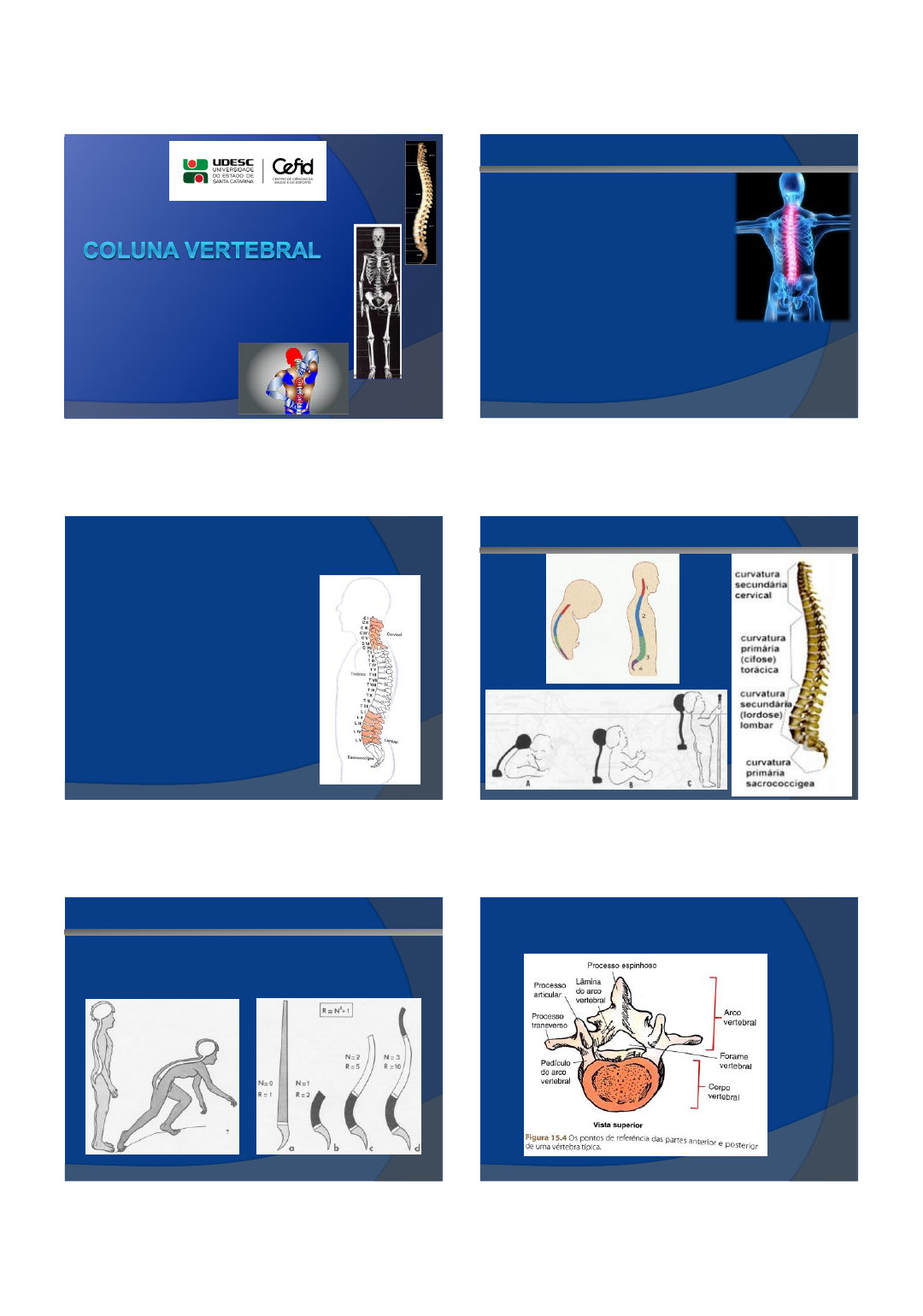 <p>Profª.Drª: Marta Cristina Rodrigues da Silva</p><p>Contato: martacrys1605@gmail.com</p><p>Florianópolis, 2024</p><p> Funções:</p><p> sustentação de carga</p><p> proteção da medula espinhal</p><p> Mobilidade</p><p> Absorção e transmissão de choques</p><p> equilíbrio postural</p><p> Localização:</p><p> esqueleto axial</p><p>Coluna Vertebral</p><p>Curvaturas da coluna</p><p>7 cervicais (lordose cervical)</p><p>12 torácicas (cifose dorsal)</p><p>5 lombares (lordose lombar)</p><p>5 sacrais (fundidas)</p><p>Curvatura lateral – usualmente torácica</p><p>– direção da curva tem relação com o</p><p>membro superior dominante</p><p>Curvaturas</p><p>Equilíbrio na Postura Bípede Resistência à Carga</p><p>Funções das Curvaturas</p><p>Vertebras</p><p>1 2</p><p>3 4</p><p>5 6</p><p>Vértebras em diferentes segmentos da coluna</p><p>Articulações</p><p> Atlantooccipital (flex/ext)–primeira articulação do</p><p>esqueleto axial</p><p> Atlantoaxial – entre atlas (C1) e áxis (C2)</p><p>Atlantooccipital : formada pelos condilos occipitais do crânio</p><p>assentados sobre a fossa articular da primeira vertebra.</p><p>Atlantoaxial: grande parte dos mov. da coluna cervical acontece devido esta articulação, que é</p><p>classificada como trocóide ou do tipo pivô.</p><p>O restante das articulações</p><p>vertebrais se classifica como</p><p>artrodial ou do tipo deslizante</p><p>Estrutura do Disco Intervertebral</p><p>- Uso de músculos pequenos</p><p>- Estilo de vida, que nos coloca em flexão lombar</p><p>- Perda da lordose lombar “síndrome das costas achatadas”</p><p>Ligamentos</p><p> Ligamentos</p><p> longitudinal anterior e posterior</p><p> flavum/flavo/amarelo</p><p> inter-espinhoso</p><p> Inter-espinhosos e</p><p>inter-transversários</p><p>7 8</p><p>9 10</p><p>11 12</p><p>Movimentos Mobilidade</p><p>Coluna vertebral: Possibilidades de movimentação</p><p>(Frankel e Nordin, 1989)</p><p>Plano Sagital (Flexão e</p><p>Extensão):</p><p>Os segmentos lombar e</p><p>cervical são os</p><p>que têm o maior</p><p>potencial de mobilidade,</p><p>enquanto o segmento</p><p>torácico é o menos</p><p>móvel (proteção aos</p><p>órgãos vitais), MAS...</p><p>Plano Frontal (Inclinações laterais):</p><p>É o plano em que há a menor</p><p>mobilidade da coluna vertebral.</p><p>(* Relação com forames</p><p>intervertebrais e nervos...)</p><p>13 14</p><p>15 16</p><p>17 18</p><p>Plano Transverso (Rotações):</p><p>A região com maior mobilidade é a</p><p>cervical e a menos móvel é a lombar.</p><p>Segundo Kapandji (2008), a coluna</p><p>lombar tem de duas a quatro vezes</p><p>menos mobilidade neste tipo de</p><p>movimento que a coluna torácica.</p><p>Fisiologia do disco intervertebral</p><p> Vértebra + Disco I.Vertebral Anéis Fibrosos (alternadamente direcionados)</p><p>A desidratação discal é um processo degenerativo que acontece à medida que a</p><p>pessoa envelhece, isso porque as células presentes nos discos responsáveis pela</p><p>absorção de água começam a morrer, o que diminui a concentração de água nos</p><p>discos e faz com que fiquem mais rígidos e menos flexíveis.</p><p>A limitação da coluna em girar</p><p>Ciclo da carga (desidratação) e descarga (hidratação) do</p><p>disco intervertebral</p><p>Compressão(Carga) Tração(Descarga)</p><p>Fuga do líquido/Achatamento Retorno do líquido/Volta ao normal</p><p>Pressões suportadas pelos discos intervertebrais segundo</p><p>a posição assumida.</p><p>Deslocamento do Núcleo Pulposo ao se levantar</p><p>incorretamente uma carga</p><p>19 20</p><p>21 22</p><p>23 24</p><p>Carga X Descarga na coluna Alternativas para exercícios que “carregam” muito a coluna</p><p>Revisão do conceito de Torque/Momento de Força</p><p>-Carga acima do ponto de apoio (coluna) é</p><p>de 400 N.</p><p>-Na fig. 10 (pessoa de pé) a soma das</p><p>pressões sobre a coluna é de 800 N</p><p>-Na fig. 11 (pessoa sentada sem apoio) a</p><p>soma das pressões eleva-se a 1600 N</p><p>400N400N 400N</p><p>1200N</p><p>Nem sempre flexionar joelhos resolve</p><p>o problema....</p><p>Implicações das limitações de movimento da coluna</p><p>vertebral em trabalho de ginástica laboral</p><p>Deve ser analisado criticamente todo</p><p>exercício de alongamento ou</p><p>musculação que trabalhar com:</p><p>-Elevada amplitude de inclinação lateral,</p><p>especialmente se efetuada a partir de</p><p>posição com o tronco verticalizado e à</p><p>favor da gravidade.</p><p>-Flexão do tronco a favor da gravidade,</p><p>sem apoio.</p><p>-Hiperextensão da coluna lombar.</p><p>Em relação à coluna cervical, algumas</p><p>considerações:</p><p>- Existe um elevado número de</p><p>exercícios de alongamento e</p><p>fortalecimento para a musculatura da</p><p>coluna cervical, utilizados</p><p>cotidianamente em sessões de G.L.</p><p>-Apesar de a análise dos gráficos de</p><p>25 26</p><p>27 28</p><p>29 30</p><p>Musculatura atuante na coluna</p><p> Flexores</p><p>2 conjuntos de músculos:</p><p>- um atuando diretamente:</p><p>Grupo abdominal (reto anterior, oblíquo externo e interno) e</p><p>psoas maior (psoas);</p><p>- e outro indiretamente:</p><p>Reto femoral, ílio (ilíaco), tensor da fáscia lata e sartório</p><p>Músculos que movem a cabeça - Flexão</p><p> Esternocleidomastóideo Flexão Cervical</p><p>Longo da cabeça Longo do pescoço</p><p>31 32</p><p>33 34</p><p>35 36</p><p>Inclinação ou Flexão Lateral</p><p>ECOM</p><p>Longo do pescoço</p><p>Escalenos</p><p>Esplênio</p><p>Músculos esplênios</p><p>Rotação da Cabeça</p><p>ECOM</p><p>Longo da cabeça</p><p>Esplênio</p><p>Extensão da Cabeça</p><p>Esplênio Trapézio</p><p>Elevador</p><p>Escápula</p><p>37 38</p><p>39 40</p><p>41 42</p><p> Superficiais</p><p> TRAPÉZIO</p><p> GRANDE DORSAL</p><p> Intermediário</p><p> SERRÁTIL</p><p>POSTERIOR</p><p>Músculos extrínsecos do dorso - extensores</p><p> Lâmina superficial</p><p> ESPLÊNIOS</p><p> Lâmina int