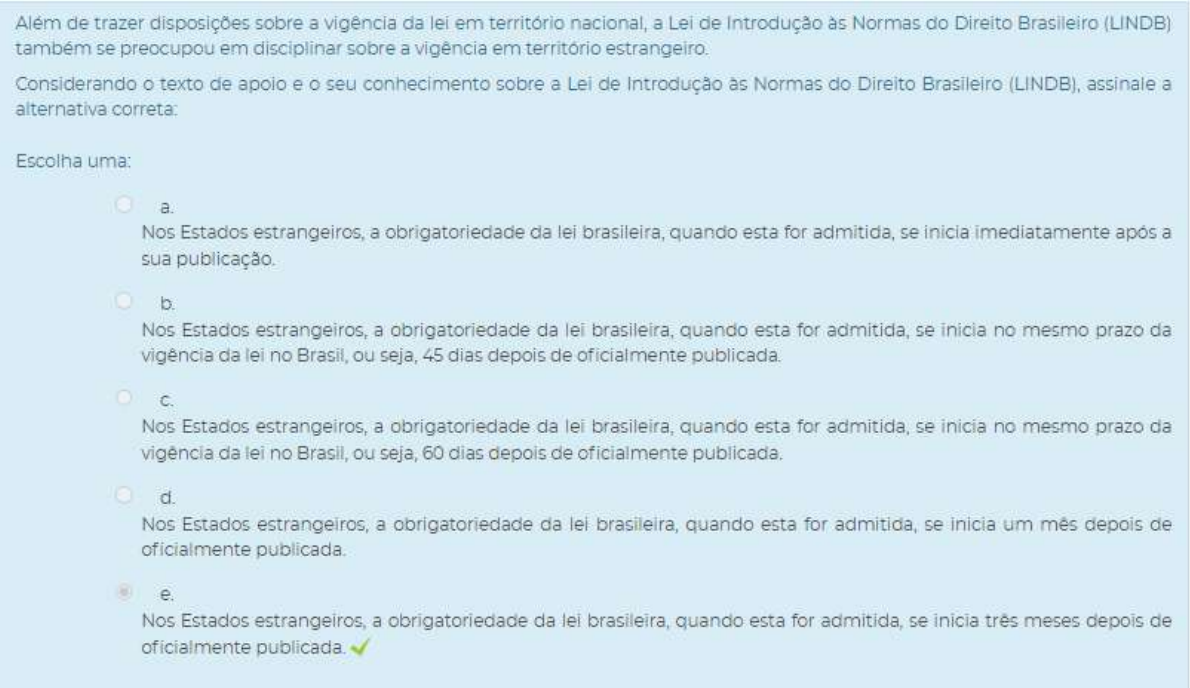 <p>Além de trazer disposições sobre a vigência da lei em território nacional, a Lei de Introdução às Normas do Direito Brasileiro (LINDB) também se preocupou em disciplinar sobre a vigência em território estrangeiro. Considerando o texto de apoio e o seu conhecimento sobre a Lei de Introdução as Normas do Direito Brasileiro (LINDB), assinale a alternativa correta: Escolha uma: a. Nos Estados estrangeiros, a obrigatoriedade da lei brasileira, quando esta for admitida, se inicia imediatamente após a sua b. Nos Estados estrangeiros, a obrigatoriedade da lei brasileira, quando esta for admitida, se inicia no mesmo prazo da vigência da lei no Brasil, ou seja, 45 dias depois de oficialmente publicada Nos Estados estrangeiros, a obrigatoriedade da lei brasileira, quando esta for admitida, se inicia no mesmo prazo da vigência da lei no Brasil, ou seja, 60 dias depois de oficialmente d. Nos Estados estrangeiros, a obrigatoriedade da lei brasileira, quando esta for admitida, se inicia um mês depois de oficialmente publicada. Nos Estados estrangeiros, a obrigatoriedade da lei brasileira, quando esta for admitida, se inicia três meses depois de oficialmente publicada.</p>