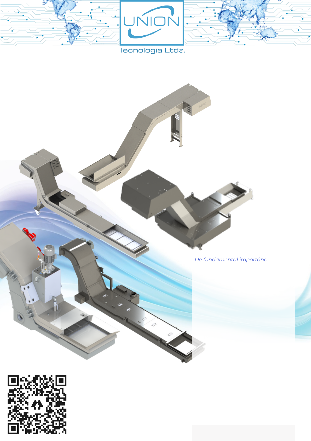 <p>De fundamental importância para</p><p>máquinas que geram cavaco,</p><p>facilitando a operação e manuseio</p><p>de cavacos e sucata em geral</p><p>Fornecemos modelos de</p><p>transportadores tipo:</p><p>- Esteira Articulada</p><p>- Esteira de Arraste</p><p>- Esteira Magnética</p><p>- Transportadores para retalhos de</p><p>chapas e sucatas</p><p>- Transportadores de Roletes para</p><p>transporte de peças</p><p>A Union Tecnologia oferece serviço</p><p>de montagem, manutenção e</p><p>reparo de transportadores</p><p>www.uniontecnologia.ind.br</p><p>transportadores de cavacos</p><p>Cavacos longos,</p><p>Espiralados, tipo fita</p><p>Metálicos</p><p>Cavacos longos,</p><p>Espiralados, tipo fita</p><p>Cavacos</p><p>espiralados curtos</p><p>Cavacos</p><p>quebrados curtos</p><p>Não Metálicos</p><p>transportadores</p><p>I - TIPO DOS CAVACOS A TRANSPORTAR</p><p>É fundamental definir o tipo, tamanho e quantidade</p><p>do cavaco a ser transportado:</p><p>C O N T A T O</p><p>VENDAS@UNION-TECNOLOGIA.COM</p><p>+55 11 93050 5038</p><p>+55 11 93403 0183</p><p>+55 11 2916 5856@UNION_TECNOLOGIA</p><p>@UNION_TECNOLOGIA</p><p>UNION TECNOLOGIA LTDA.</p><p>Cavacos de alumínio,</p><p>Quebrados</p><p>Cavacos de Latão,</p><p>Quebrados</p><p>Outros Materiais</p><p>Não-metálicos</p><p>TABELA DE APLICAÇÃO</p><p>Transportadores Magnéticos</p><p>Transportador com filtro integrado</p><p>Transportador com filtro integrado</p><p>Transportador Esteira de Arraste</p><p>Transportador Esteira de Arraste</p><p>Transportador Esteira Articulada</p><p>transportadores</p><p>TIPO DOS CAVACOS A TRANSPORTAR</p><p>C O N T A T O</p><p>VENDAS@UNION-TECNOLOGIA.COM</p><p>+55 11 93050 5038</p><p>+55 11 93403 0183</p><p>+55 11 2916 5856@UNION_TECNOLOGIA</p><p>@UNION_TECNOLOGIA</p><p>UNION TECNOLOGIA LTDA.</p><p>Aço/Longo Aço/Curto Ferroso/Curto Ferroso/Fundido Alumínio/Espiral Alumínio/Curto Latão Não Metálicos</p><p>Tambor</p><p>+ Bag</p><p>Tambor</p><p>+ Bag</p><p>Tambor</p><p>+ Bag</p><p>Tambor</p><p>+ Bag</p><p>Tambor</p><p>+ Bag</p><p>Tambor</p><p>+ Bag</p><p>Tambor</p><p>+ Bag</p><p>Tambor</p><p>+ Bag</p><p>Disco Disco Disco Disco Disco</p><p>Tambor Tambor Tambor Tambor Tambor</p><p>Transportador Esteira Articulada</p><p>Modelo #TEART-SD</p><p>Cavacos médios e pequenos</p><p>Modelo #TEART-WLD</p><p>Esteira especial (p.63, 100 e</p><p>150 mm)</p><p>Cavacos médios e grandes</p><p>Modelo Standard #TEARR</p><p>Cavacos secos até 60mm</p><p>Modelo especial #TEARR-FEA</p><p>"Filtro estático autolimpante"</p><p>Cavacos úmidos de 2 a 60mm</p><p>Modelo #DFR (Disco de filtragem</p><p>rotativo)</p><p>Para cavacos pequenos/ partículas</p><p>finas</p><p>Modelo #TFR (Tambor de filtragem</p><p>rotativo)</p><p>Para cavacos pequenos/ partículas</p><p>finas</p><p>Transportadores DUO (dupla esteira)</p><p>Modelo #TDE (Esteira principal +</p><p>auxiliar)</p><p>Para todos tipos de cavacos</p><p>Modelo #TMAG (Esteira Magnética)</p><p>Para cavacos metálicos,</p><p>magnetizáveis</p><p>Transportadores com dupla filtragem</p><p>Modelo #TFD</p><p>(Filtração de 2 etapas)</p><p>Para máquinas com refrigeração</p><p>Interna</p><p>ESPECIFICAÇÃO DO EQUIPAMENTO: #_ _ _ - _ _ _ - _ _ - _ _ - _ _A B C D E</p><p>GRUPO A: Modelo do equipamento</p><p>GRUPO B: Tanque (TK) + Volume (em m3)</p><p>GRUPO C: Acessórios do tanque: Rodízios (R), Chave nível (Cn), Skimmer (Sk), Cesto (Ce)</p><p>GRUPO D: Bombas (BO)</p><p>GRUPO E: Painel Elétrico (PA)</p><p>ESTEIRA ARTICULADA</p><p>Esteiras padronizadas com passo 38mm, 63mm, 100mm, 150mm e 200mm. Podem ser</p><p>aplicados em máquinas operatrizes individuais, ou em projetos maiores podem ser</p><p>interligados para uso como central para descarte de resíduos. Podendo transportar</p><p>cavacos espiralados, tipo fita, emaranhados, curtos, e com a possibilidade da integração</p><p>de trituradores para fragmentação e otimização do descarte. Disponíveis para aplicações</p><p>a seco ou com refrigeração. Quando</p><p>transportadores</p><p>II - TIPOS E CONFIGURAÇÕES</p><p>Fornecemos os seguintes modelos de</p><p>transportadores:</p><p>Transportadores Union tipo esteira articulada,</p><p>adequados para cavacos provenientes de</p><p>processos de usinagem, estamparia, forjaria,</p><p>fundição, etc. Além do transporte de cavacos ou</p><p>sucata em geral, este tipo de esteira também é</p><p>adequada para transporte de peças.</p><p>aplicados com refrigeração possuem sistemas</p><p>compactos e integrados de filtragem para qualificar o</p><p>fluido de refrigeração e proteger os componentes tais</p><p>como bombas , válvulas, bicos, junta rotativa, etc...</p><p>Reduzindo assim o trabalho de manutenção para limpeza</p><p>de tanques e sistemas de refrigeração.</p><p>Sistemas de proteção contra travamento e painéis de</p><p>comando elétrico interligados a máquina, de acordo com</p><p>a interface do comando numérico são desenvolvidos por</p><p>nossos especialistas em automação e permitem o</p><p>trabalho seguro e sincronizado com a operação da</p><p>máquina.</p><p>ESTEIRA de arraste</p><p>Transportadores Union tipo esteira de arraste,</p><p>adequados para cavacos curtos</p><p>(quebrados/fragmentados). Esteiras com</p><p>passo 38mm, 63mm e especificadas para uso</p><p>individual em máquinas operatrizes, ou</p><p>projetos interligados para uso como central</p><p>para descarte de resíduos.</p><p>Quando aplicados com</p><p>refrigeração possuem sistemas</p><p>integrados e compactos (tipo</p><p>tambor rotativo/ou tela wedge</p><p>wire screen) para filtragem do</p><p>fluido de refrigeração.</p><p>Sistemas autolimpantes, que</p><p>permitem funcionamento</p><p>totalmente automático, com</p><p>descarte dos resíduos filtrados</p><p>sendo direcionados diretamente</p><p>para a caçamba de resíduos.</p><p>transportadores</p><p>TIPOS E CONFIGURAÇÕES</p><p>Equipamentos complementares como tanques, bombas, chaves de nível,</p><p>skimmers, caçambas, painel elétrico de coma