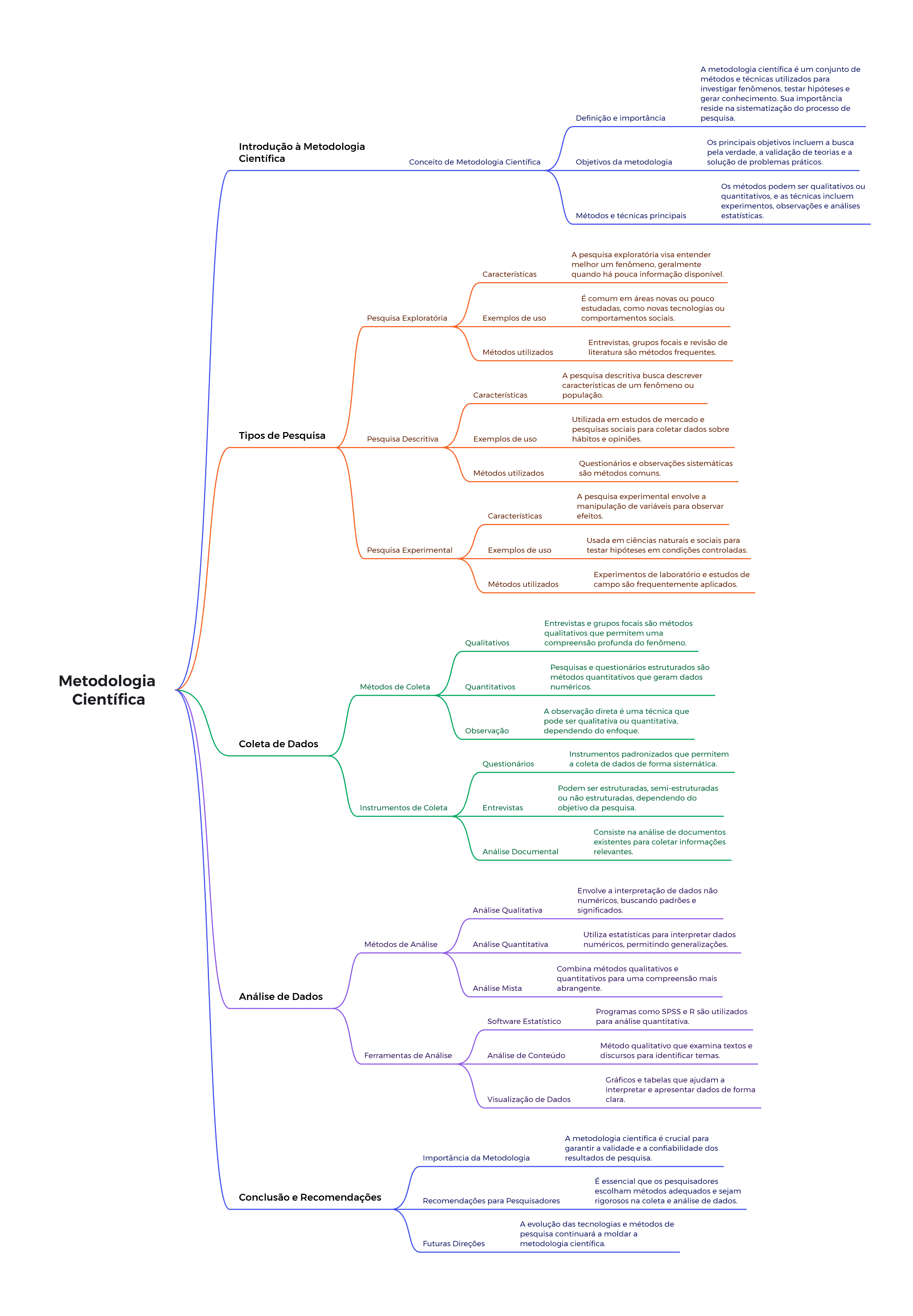 <p>Metodologia</p><p>Científica</p><p>Introdução à Metodologia</p><p>Científica Conceito de Metodologia Científica</p><p>Definição e importância</p><p>A metodologia científica é um conjunto de</p><p>métodos e técnicas utilizados para</p><p>investigar fenômenos, testar hipóteses e</p><p>gerar conhecimento. Sua importância</p><p>reside na sistematização do processo de</p><p>pesquisa.</p><p>Objetivos da metodologia</p><p>Os principais objetivos incluem a busca</p><p>pela verdade, a validação de teorias e a</p><p>solução de problemas práticos.</p><p>Métodos e técnicas principais</p><p>Os métodos podem ser qualitativos ou</p><p>quantitativos, e as técnicas incluem</p><p>experimentos, observações e análises</p><p>estatísticas.</p><p>Tipos de Pesquisa</p><p>Pesquisa Exploratória</p><p>Características</p><p>A pesquisa exploratória visa entender</p><p>melhor um fenômeno, geralmente</p><p>quando há pouca informação disponível.</p><p>Exemplos de uso</p><p>É comum em áreas novas ou pouco</p><p>estudadas, como novas tecnologias ou</p><p>comportamentos sociais.</p><p>Métodos utilizados</p><p>Entrevistas, grupos focais e revisão de</p><p>literatura são métodos frequentes.</p><p>Pesquisa Descritiva</p><p>Características</p><p>A pesquisa descritiva busca descrever</p><p>características de um fenômeno ou</p><p>população.</p><p>Exemplos de uso</p><p>Utilizada em estudos de mercado e</p><p>pesquisas sociais para coletar dados sobre</p><p>hábitos e opiniões.</p><p>Métodos utilizados</p><p>Questionários e observações sistemáticas</p><p>são métodos comuns.</p><p>Pesquisa Experimental</p><p>Características</p><p>A pesquisa experimental envolve a</p><p>manipulação de variáveis para observar</p><p>efeitos.</p><p>Exemplos de uso</p><p>Usada em ciências naturais e sociais para</p><p>testar hipóteses em condições controladas.</p><p>Métodos utilizados</p><p>Experimentos de laboratório e estudos de</p><p>campo são frequentemente aplicados.</p><p>Coleta de Dados</p><p>Métodos de Coleta</p><p>Qualitativos</p><p>Entrevistas e grupos focais são métodos</p><p>qualitativos que permitem uma</p><p>compreensão profunda do fenômeno.</p><p>Quantitativos</p><p>Pesquisas e questionários estruturados são</p><p>métodos quantitativos que geram dados</p><p>numéricos.</p><p>Observação</p><p>A observação direta é uma técnica que</p><p>pode ser qualitativa ou quantitativa,</p><p>dependendo do enfoque.</p><p>Instrumentos de Coleta</p><p>Questionários</p><p>Instrumentos padronizados que permitem</p><p>a coleta de dados de forma sistemática.</p><p>Entrevistas</p><p>Podem ser estruturadas, semi-estruturadas</p><p>ou não estruturadas, dependendo do</p><p>objetivo da pesquisa.</p><p>Análise Documental</p><p>Consiste na análise de documentos</p><p>existentes para coletar informações</p><p>relevantes.</p><p>Análise de Dados</p><p>Métodos de Análise</p><p>Análise Qualitativa</p><p>Envolve a interpretação de dados não</p><p>numéricos, buscando padrões e</p><p>significados.</p><p>Análise Quantitativa</p><p>Utiliza estatísticas para interpretar dados</p><p>numéricos, permitindo generalizações.</p><p>Análise Mista</p><p>Combina métodos qualitativos e</p><p>quantitativos para uma compreensão mais</p><p>abrangente.</p><p>Ferramentas de Análise</p><p>Software Estatístico</p><p>Programas como SPSS e R são utilizados</p><p>para análise quantitativa.</p><p>Análise de Conteúdo</p><p>Método qualitativo que examina textos e</p><p>discursos para identificar temas.</p><p>Visualização de Dados</p><p>Gráficos e tabelas que ajudam a</p><p>interpretar e apresentar dados de forma</p><p>clara.</p><p>Conclusão e Recomendações</p><p>Importância da Metodologia</p><p>A metodologia científica é crucial para</p><p>garantir a validade e a confiabilidade dos</p><p>resultados de pesquisa.</p><p>Recomendações para Pesquisadores</p><p>É essencial que os pesquisadores</p><p>escolham métodos adequados e sejam</p><p>rigorosos na coleta e análise de dados.</p><p>Futuras Direções</p><p>A evolução das tecnologias e métodos de</p><p>pesquisa continuará a moldar a</p><p>metodologia científica.</p>
