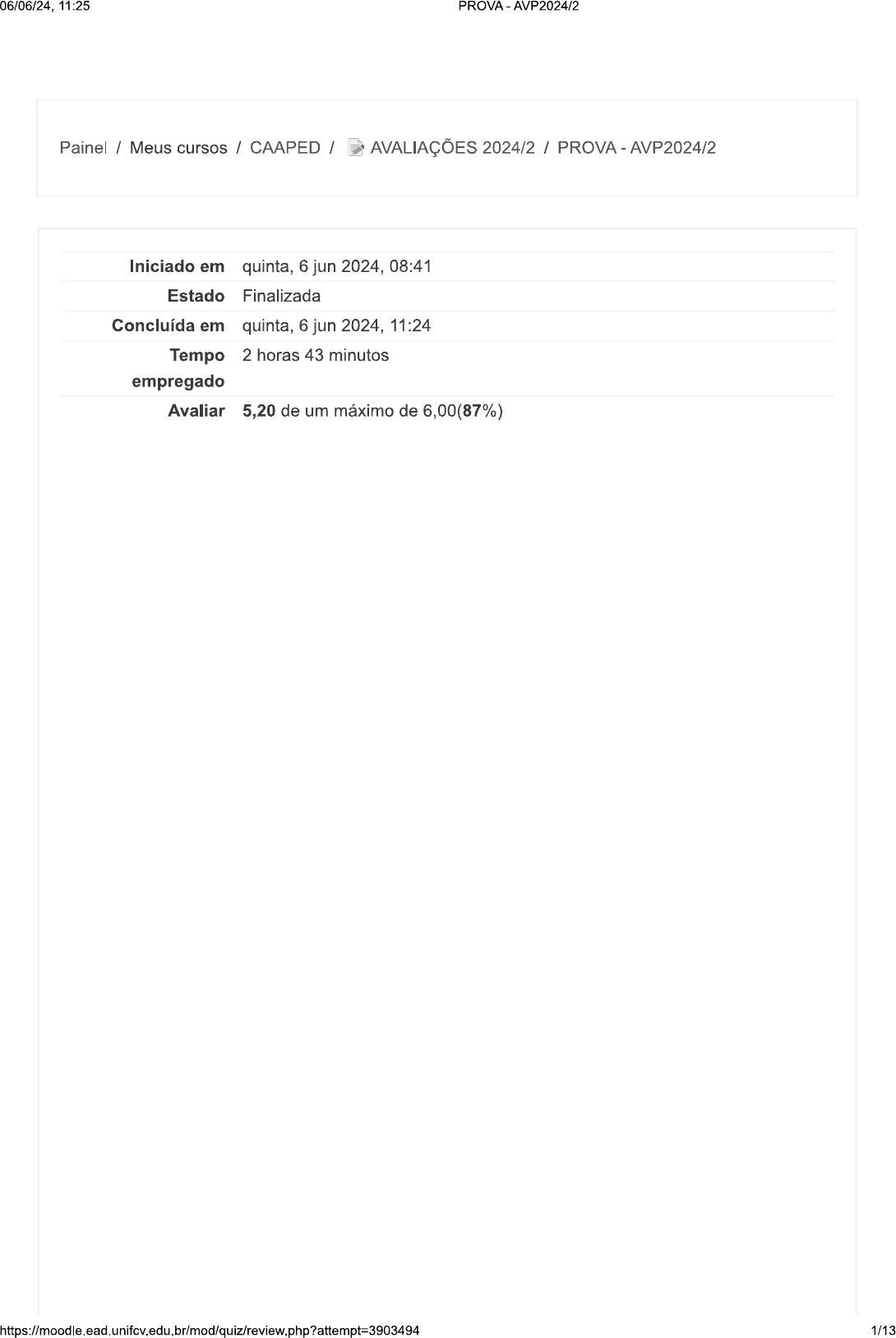 <p>06/06/24, 11:25 PROVA AVP2024/2 Painel / Meus cursos / CAAPED / AVALIAÇÕES 2024/2 / PROVA AVP2024/2 Iniciado em quinta, 6 jun 2024, 08:41 Estado Finalizada Concluída em quinta, 6 jun 2024, 11:24 Tempo 2 horas 43 minutos empregado Avaliar 5,20 de um máximo de 6,00(87%) https://moodle.ead.unifcv.edu.br/mod/quiz/review.php?attempt=3903494 1/13</p><p>06/06/24, 11:25 PROVA AVP2024/2 Questão 1 Correto Atingiu 0,40 de 0,40 Sabe-se que são diversas as definições sobre o currículo, e por diversos autores. Com esse entendimento, seguindo as definições apresentadas no material da disciplina, analise as afirmativas abaixo com relação ao Currículo como Conteúdo: - Entender o currículo como conteúdo é uma das formas mais usuais e historicamente mais relevantes que encontramos. - Significa assumi-lo como algo que está estabelecido, imutável, indicando os marcos a partir dos quais se desenvolverá a atividade educativa de uma escola. III - entendimento do que seja o seu conteúdo tem uma variação muito grande. IV - Também significa o conhecimento, o conteúdo de uma disciplina específica ou, ainda, o conteúdo da cultura socialmente construída V - Nessa vertente que entende o currículo como conteúdo encontra-se a forma de compreendê-lo como uma sequência de unidades de conteúdos e também a de o ver como um conjunto de resultados de aprendizagem. É correto o que se afirma em: Escolha uma opção: a. I, II, III e V, somente. b. II, III, IV e V, somente. C. I, II, IV e V, somente. d. I. III, IV e V, somente e. I, II, III e IV, somente. https://moodle.ead.unifcv.edu.br/mod/quiz/review.php?attempt=3903494 2/13</p><p>06/06/24, 11:25 PROVA AVP2024/2 Questão 2 Correto Atingiu 0,40 de 0,40 Compreende-se que a avaliação formativa é realizada ao longo do processo, é contínua, e dá parâmetros ao professor para verificar se os objetivos foram alcançados, podendo interferir no que está comprometendo a aprendizagem. Sobre esse modelo de avaliação, analise as afirmativas abaixo: - Visa verificar a existência, ou ausência, de habilidades e conhecimentos pré-estabelecidos, esta é uma ação que inicia o processo avaliativo e verifica se os alunos dominam os pré- requisitos necessários para novas aprendizagens. - Por meio da avaliação formativa é possível constatar se os objetivos estabelecidos foram atingidos pelos alunos, como também levantar dados para que o professor possa realizar um trabalho de recuperação e aperfeiçoar seus procedimentos. III - A avaliação formativa tem a função de fornecer um feedback informativo à medida que o aluno evolui, ou apresenta dificuldades nas etapas de estudo dos componentes considerados importantes na unidade de aprendizagem. IV objetivo da avaliação formativa é determinar o grau em que o aprendiz dominou uma determinada tarefa de aprendizagem e detectar a parcela da tarefa que não foi dominada. V - - Os testes de natureza formativa são aplicados com maior frequência e durante o processo de ensino. É correto o que se afirma em: Escolha uma opção: a. II, III, IV e V, somente b. I, II, III e V, somente. C. I, II, III e IV, somente. d. I, II, IV e V, somente. e. I, III, IV e V, somente. https://moodle.ead.unifcv.edu.br/mod/quiz/review.php?attempt=3903494 3/13</p><p>06/06/24, 11:25 PROVA AVP2024/2 Questão 3 Incorreto Atingiu 0,00 de 0,40 O ser humano aprende as formas de ação que fazem parte do ambiente em que vive, e esses padrões que regulam a interação entre as pessoas são pelas práticas culturais. Dessa forma, além de ser marcado pela ação, pela interação, pela aprendizagem e por etapas que começam na infância, o desenvolvimento humano pode estar relacionado a que? Diante do exposto, marque a alternativa correta: Escolha uma opção: a. Evolução humana. b. Evolução intelectual. C. Evolução biológica. d. Evolução da educação. e. Evolução socialx https://moodle.ead.unifcv.edu.br/mod/quiz/review.php?attempt=3903494 4/13</p><p>06/06/24, 11:25 PROVA AVP2024/2 Questão 4 Correto Atingiu 0,40 de 0,40 Para a avaliação dos estudantes foi implementado o Exame Nacional de Desempenho de Estudantes (Enade), um exame obrigatório que é aplicado periodicamente, em ciclos de três anos, aos alunos de todos os cursos de graduação. Sobre essa avaliação, analise as afirmativas abaixo: - ENADE avalia e acompanha o processo de aprendizagem e o desempenho acadêmico dos estudantes em relação aos conteúdos programáticos previstos nas diretrizes curriculares do respectivo curso de graduação. - É utilizado como forma de ingresso em algumas universidades, eliminando, em muitas ocasiões, a necessidade de prestar vestibular. III - Enade também avalia suas habilidades para ajustar-se às exigências decorrentes da evolução do conhecimento e competências para compreender temas exteriores ao âmbito específico da profissão escolhida, ligados à realidade brasileira e mundial e a outras áreas do conhecimento. IV Além dos testes de conhecimento, os alunos devem responder a um questionário para levantar a percepção dos alunos sobre o teste e outro sobre o perfil socioeconômico educacional do aluno. V Avaliação sistêmica, pois é base para a formulação de políticas públicas. É correto o que se afirma em: Escolha uma opção: a. I, e III, somente. b. I, III e IV, somente C. I, e IV, somente. d. II, III e V, somente. e. II, IV e V, somente. https://moodle.ead.unifcv.edu.br/mod/quiz/review.php?attempt=3903494 5/13</p><p>06/06/24, 11:25 PROVA AVP2024/2 Questão 5 Correto Atingiu 0,40 de 0,40 A legislação buscou nortear quais seriam as principais normas que serviriam de parâmetro para os professores em relação à estrutura e o funcionamento de qual nível da educação? Diante do exposto, marque a alternativa correta: Escolha uma opção: a. Educação Básica b. Ensino Médio. C. Ensino Superior. d. Educação Profissionalizante. e. Educação Indígena. Questão 6 Correto Atingiu 0