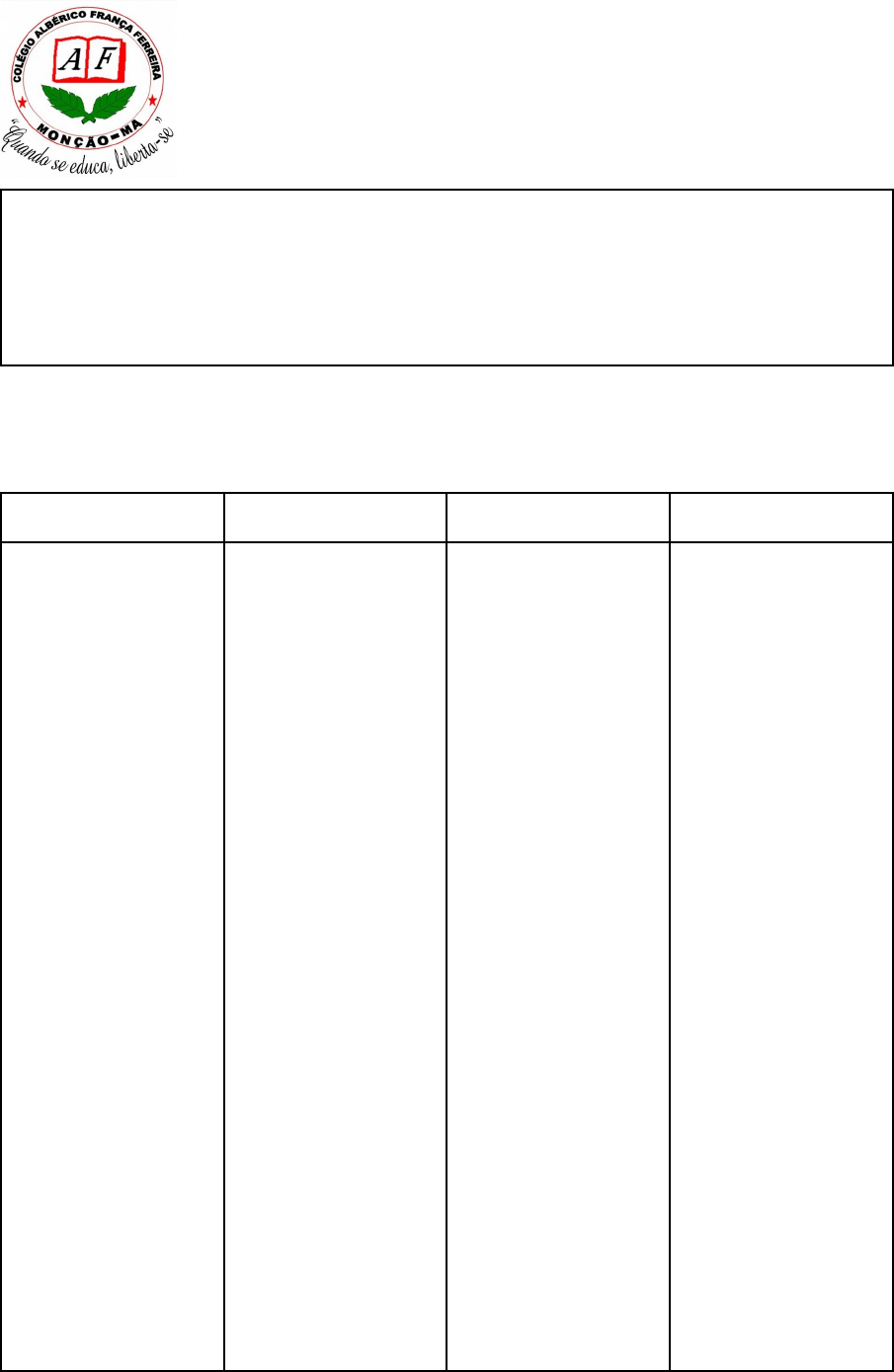 <p>PLANO DE AULA ANUAL</p><p>COLÉGIO ALBERICO F. FERREIRA</p><p>Ano: 2024.</p><p>PROFESSOR: Orlando Montello.</p><p>DISCIPLINA: Ensino Religioso.</p><p>OBJETIVO GERAL: Despertar e cultivar a religiosidade do/a estudante levando-o/a à compreensão da importância do fenômeno religioso em sua própria vida e na história humana.</p><p>OBJETIVOS</p><p>CONTEÚDOS</p><p>ATIVIDADES</p><p>AVALIAÇÃO</p><p>1-Conhecer e respeitar as manifestações religiosas existentes em sala de aula.</p><p>-Estabelecer o diálogo entre ao alunado para crescer individualmente e em grupo;</p><p>-Descobrir os valores e atitudes que caracterizam a própria convivência com o grupo e com a natureza.</p><p>- Estruturar seu mundo pessoal, seu Eu interior e sua relação com o Transcendente;</p><p>2- Conhecer e valorizar o conjunto de normas das tradições religiosas, através das narrativas sagradas de cada tradição religiosa.</p><p>- Compreender o respeito e a importância dos valores da diversidade fundamentais na construção da cidadania;</p><p>-Refletir sobre os direitos humanos como valores universais que dão sentido à vida;</p><p>-Adquirir atitudes de respeito com o outro e com a natureza.</p><p>3-Desenvolver habilidades a respeito do significado da história de um povo e de cada pessoa, à luz da dimensão transcendente.</p><p>-Destacar pontos relevantes, do significado da história de um povo, que conduzem a valorização da pessoa humana através do diálogo e do respeito à cultura, símbolos e ritos, eliminando as diversas formas de preconceitos;</p><p>-Perceber que o povo brasileiro é formado por convivência de etnias nativas ou vindas de outros continentes;</p><p>-Despertar interesse em dialogar com as diferentes culturas religiosas;</p><p>4- A prender a conviver com as diferenças, com a finalidade de reconhecimento do outro, respeitando as diversas manifestações religiosas existente no contexto escolar;</p><p>-Refletir sobre o sentido da vida, enquanto um cidadão do universo;</p><p>-Conhecer e respeitar as diversas manifestações religiosas locais, através do significado dos seus símbolos religiosos importantes para todas as religiões, dando destaque às culturas indígenas e Afro-brasileiras, entre outras;</p><p>-Despertar no educando o hábito de valorizar a diversidade cultural religiosa do Brasil e do mundo.</p><p>1 BIMESTRE-</p><p>-Fé Versus força físicas.</p><p>- A biblia conta assim.</p><p>-Todos saberao que há um Deus em Israel.</p><p>- O que diz a física.</p><p>2 BIMESTRE.</p><p>- Cante ao senhor toda a terra.</p><p>-A biblia conta assim… historias e experiencias com Deus.</p><p>- a descoberta da fé.</p><p>-A razao da nossa fé.</p><p>3 BIMESTRE.</p><p>-Momentos de mudanças.</p><p>- os parametros para nossa fé estao na Bíblia.</p><p>- viver a fé em tempos difíceis.</p><p>- Oraçao; sintonia com Deus.</p><p>4 BIMESTRE.</p><p>-O Lugar das riquezas</p><p>-sociedade de consumo.</p><p>-Vida a serviço do Reino de Deus.</p><p>- Aqueles que nos ensinam.</p><p>-Levantamento das Tradições Religiosas existentes na sala de aula e entorno;</p><p>-Manifestação de curiosidade e interesse pela religião do outro;</p><p>-Seleção e organização valorativa de fotos, símbolos em geral, que julguem importantes, descrevendo seus significados;</p><p>-Narração de fatos importantes da vida dos/as estudantes e família;</p><p>-Expressão da sua crença com liberdade, e a do/a outro/a também.</p><p>-Relação de significados entre os diferentes símbolos religiosos;</p><p>-Exposição e apresentação de trabalhos em grupo, de modo que cada grupo apresenta sobre uma Tradição Religiosa diferente da que professa.</p><p>-Discussão em grupos sobre os mitos que se criam ao redor de pessoas (artistas, personagens públicas);</p><p>-Elaboração de um calendário rudimentar das celebrações (datas comemorativas) das diferentes Tradições Religiosas;</p><p>-Montagem de painéis com os diferentes nomes com os quais o Transcendente é chamado nas Tradições Religiosas, classificando-os conforme matriz de origem;</p><p>-Pesquisa, seleção e discussão de mitos criados ao redor de crendices, da culinária, da linguagem;</p><p>-Socialização de histórias da família, com o grupo;</p><p>-Pesquisa de letras de músicas que abordam questões sociais (religiosidade,valores humanos);</p><p>-Reflexão sobre o cuidado e o respeito com o outro; com a natureza;</p><p>-Semelhanças entre as Tradições Religiosas mais significativas para o grupo.</p><p>-Semelhança e diferença da religiosidade das etnias;</p><p>-Pesquisas diversas: Datas comemorativas;</p><p>-Construção de painéis sobre os diversos temas abordados;</p><p>trabalhos individuais;</p><p>Trabalhos em grupos;</p><p>Frequência;</p><p>Assiduidade:</p><p>Responsabilidade;</p><p>Compromisso</p><p>Adoção de atitudes positivas frente a um desagravo ou frustração.</p><p>Respeito às diferenças, às ideias do outro.</p><p>Manifestação de opiniões, sentimentos, ideias.</p><p>Cooperação com os colegas e o professor.</p><p>A boa convivência na sala de aula.</p><p>Rodas de diálogo;</p><p>Desenvolvimento de ações de solidariedade;</p><p>Organização com seus pertences;</p><p>O cuidado com o patrimônio público, etc.</p><p>Atitudes de valorização do outro;</p><p>Confraternização de encerramento.</p><p>4 AULAS.</p><p>image1.jpg</p>