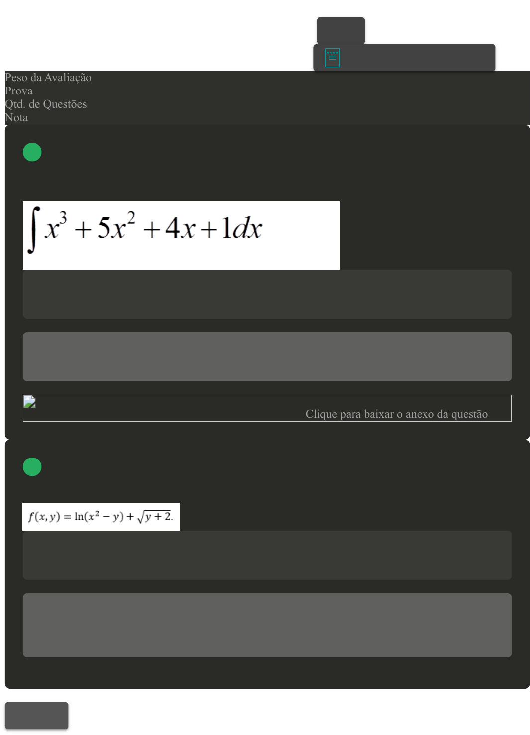 <p>Prova Impressa</p><p>GABARITO | Avaliação Final (Discursiva) - Individual</p><p>(Cod.:668770)</p><p>Peso da Avaliação 4,00</p><p>Prova 30360604</p><p>Qtd. de Questões 2</p><p>Nota 10,00</p><p>Com relação ao conceito de integral, existem várias aplicações que podemos destacar,</p><p>principalmente na área das engenharias. A relação entre as derivadas e integrais tornou-se uma das</p><p>ferramentas mais poderosas para analisar diversos fenômenos. O primeiro passo para se construir o</p><p>conceito de integral é estudar alguns critérios de cálculo. Resolva a integral indefinida a seguir:</p><p>Resposta esperada</p><p>Resposta esperada:</p><p>Minha resposta</p><p>x^4/4+5x^3/3+4x^2/2+x+c x^4/4+5x^3/3+2x^2+x+c</p><p>Formulário - Cálculo Diferencial e Integral (MAD) - PauloClique para baixar o anexo da questão</p><p>Análogo a funções de uma variável, podemos definir que o domínio de uma função de duas</p><p>variáveis f é o conjunto de todos os pontos (x, y) tais que a função f (x, y) pode ser calculada.</p><p>Determine o domínio da função a seguir, apresentando os cálculos para justificar.</p><p>Resposta esperada</p><p>Precisamos determinar os valores de x e y que podemos aplicar a função</p><p>Minha resposta</p><p>X^2-y > 0, ou seja, y</p>