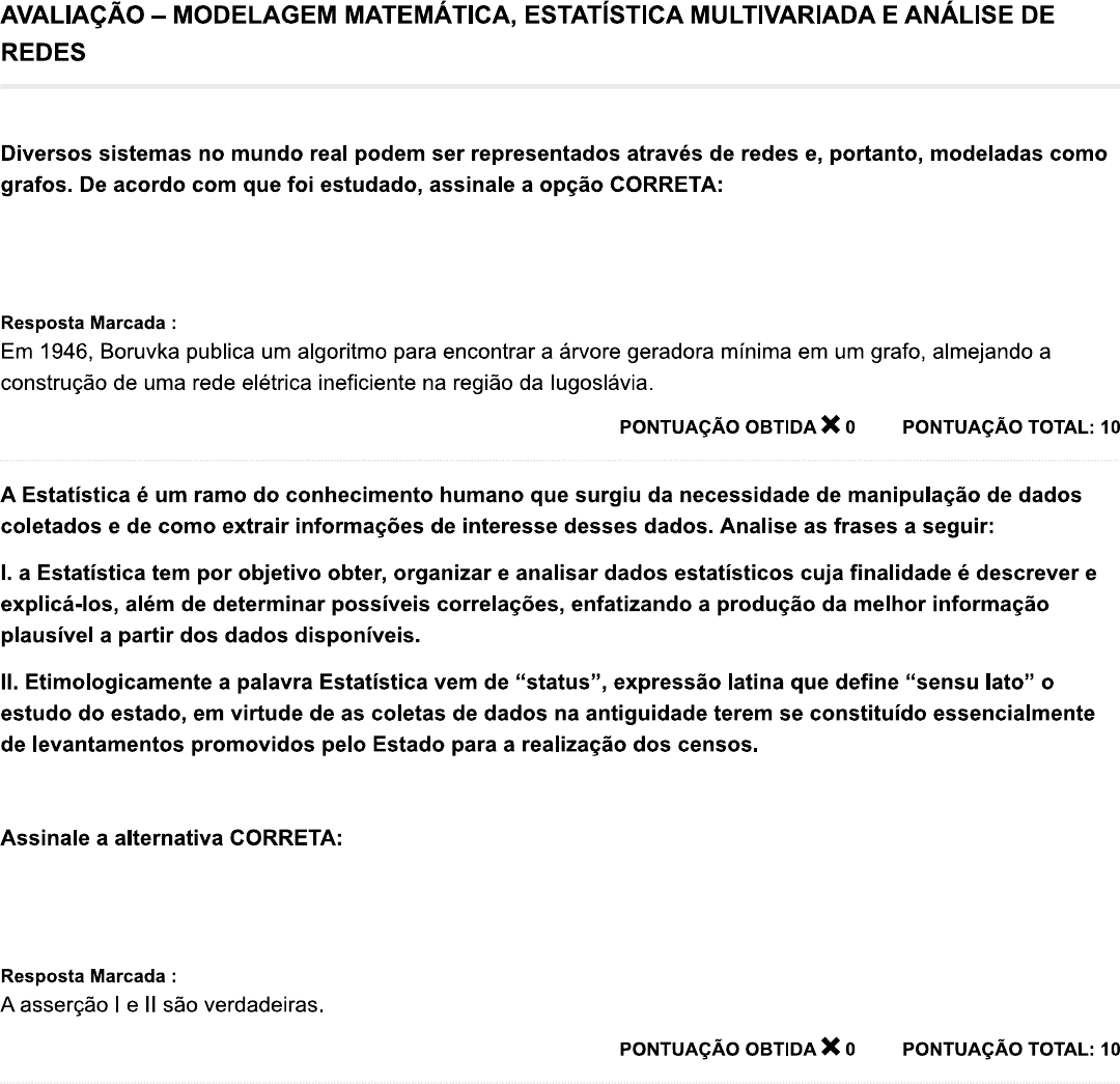 <p>AVALIAÇÃO - MODELAGEM MATEMÁTICA, ESTATÍSTICA MULTIVARIADA E ANÁLISE DE REDES Diversos sistemas no mundo real podem ser representados através de redes e, portanto, modeladas como grafos. De acordo com que foi estudado, assinale a opção CORRETA: Resposta Marcada : Em 1946, Boruvka publica um algoritmo para encontrar a árvore geradora mínima em um grafo, almejando a construção de uma rede elétrica ineficiente na região da lugoslávia. PONTUAÇÃO OBTIDA 0 PONTUAÇÃO TOTAL: 10 A Estatística é um ramo do conhecimento humano que surgiu da necessidade de manipulação de dados coletados e de como extrair informações de interesse desses dados. Analise as frases a seguir: I. a Estatística tem por objetivo obter, organizar e analisar dados estatísticos cuja finalidade é descrever e explicá-los, além de determinar possíveis correlações, enfatizando a produção da melhor informação plausível a partir dos dados disponíveis. II. Etimologicamente a palavra Estatística vem de "status", expressão latina que define "sensu lato" o estudo do estado, em virtude de as coletas de dados na antiguidade terem se constituído essencialmente de levantamentos promovidos pelo Estado para a realização dos censos. Assinale a alternativa CORRETA: Resposta Marcada : A asserção e são verdadeiras. PONTUAÇÃO OBTIDA 0 PONTUAÇÃO TOTAL: 10</p><p>Na esperança de uma educação baseada na utilização de instrumentos comunicativos, analíticos e materiais, que possibilite o exercício pleno da cidadania, D'Ambrosio apresenta um trivium para a nova era que se inicia composto por três vertentes. Considerando o que foi estudado, RELACIONE a primeira coluna com a segunda. I. LITERACIA II. MATERACIA III. TECNORACIA ( ) a capacidade de processar informação escrita e falada, o que inclui leitura, escritura, cálculo, diálogo, ecálogo, mídia, Internet na vida quotidiana [Instrumentos Comunicativos]. ( ) a capacidade de interpretar e analisar sinais e códigos, de propor e utilizar modelos e simulações na vida cotidiana, de elaborar abstrações sobre representações do real [Instrumentos Analíticos]. ( ) a capacidade de usar e combinar instrumentos, simples ou complexos, inclusive o próprio corpo, avaliando suas possibilidades e suas limitações e a sua adequação a necessidades e situações diversas [Instrumentos Materiais] A sequência CORRETA é: Resposta Marcada II, III, PONTUAÇÃO OBTIDA 0 PONTUAÇÃO TOTAL: 10 A estatística tradicional sofreu grande impulso com o desenvolvimento das tecnologias computacionais. Analise as frases a seguir: I. Os métodos de estatística multivariada são utilizados com o propósito de complicar ou dificultar a interpretação do fenômeno que está sendo estudado através da construção de gráficos. II. A estatística multivariada constitui um dos métodos estatísticos que simultaneamente analisam múltiplas medidas sobre cada indivíduo ou objeto sob investigação. Assinale a alternativa CORRETA: Resposta Marcada : A asserção é falsa e a verdadeira PONTUAÇÃO OBTIDA 10 PONTUAÇÃO TOTAL: 10 De acordo com Ragsdale (2004:4), podemos citar como principais características e benefícios da modelagem, EXCETO: Resposta Marcada : É uma forma de abstração e generalização com a finalidade de realizar tendências. PONTUAÇÃO OBTIDA 10 PONTUAÇÃO TOTAL: 10</p><p>Buscando na literatura pertinente sobre pensamento estatístico, nos deparamos com várias argumentações sobre esse assunto, ou melhor, sobre essa competência estatística almejada para os indivíduos pertencentes à sociedade. De acordo com o tema estudado, assinale a alternativa INCORRETA: Resposta Marcada : Em qualquer nível de ensino, seja na educação básica ou na educação superior, os estudantes não devem ser expostos às situações de ensino e aprendizagem que visem o desenvolvimento do pensamento estatístico. PONTUAÇÃO OBTIDA 10 PONTUAÇÃO TOTAL: 10 Desde os tempos mais longínquos, conhecimentos que viriam a ser relacionados atualmente com a Matemática têm sido utilizados para solução de problemas numa tentativa de leitura e compreensão do mundo. Abaixo todas alternativas estão corretas, EXCETO: Resposta Marcada : A etapa de interação é o momento no qual são identificados os fatos envolvidos, classificando as informações como relevantes ou não. PONTUAÇÃO OBTIDA 10 PONTUAÇÃO TOTAL: 10 A Modelagem Matemática enquanto processo, busca soluções capazes de explicar e interpretar o fenômeno em estudo. Considerando o que foi estudado, RELACIONE a primeira coluna com a segunda. I. Interação II. Matematização III. Modelo Matemático ( ) é o momento no qual são identificados os fatos envolvidos, classificando as informações como relevantes ou não. consiste na interpretação da solução e na verificação do modelo construído. ( ) consiste na tomada de conhecimento da situação problema, na busca pelo máximo de informações possíveis acerca dessa situação, visando obter maior clareza em relação aos caminhos a serem tomados para elaboração do modelo. A sequência CORRETA é: Resposta Marcada PONTUAÇÃO OBTIDA 0 PONTUAÇÃO TOTAL: 10</p><p>Comumente ouvimos relatos advindos de docentes de Matemática sobre a(s) dificuldade(s) encontrada(s) pelos estudantes em relação a aspectos que tecem essa disciplina. De acordo com o tema estudado, assinale a alternativa INCORRETA. Resposta Marcada : "A falta de interesse para estudar Matemática pode ser resultante do método de ensino empregado pelo professor, que usa linguagem e simbolismo muito particular, além de alto grau de abstração". PONTUAÇÃO OBTIDA 0 PONTUAÇÃO TOTAL: 10 Analise as frases a seguir: I. o raciocínio estatístico, um dos elementos das três competências estatísticas almejadas por educadores, se configura como a forma como a pessoa raciocina com ideias estatísticas. II. Raciocínio é o exercício da razão através do qual se procura alcançar o ent