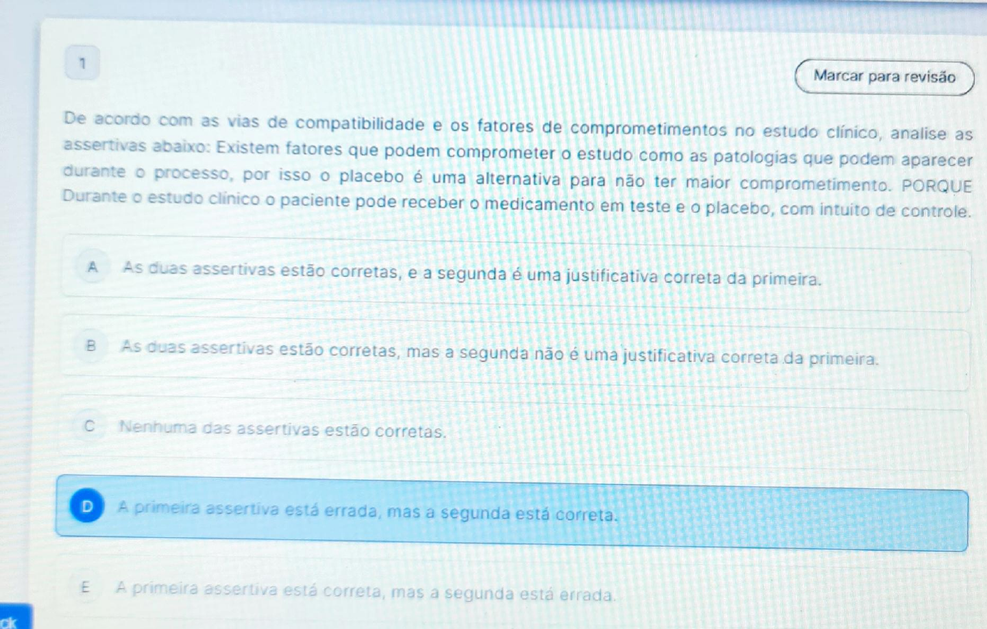 <p>Marcar para revisão</p><p>De acordo com as vias de compatibilidade e os fatores de comprometimentos no estudo clínico, analise as</p><p>assertivas abaxo:Existem fatores que podem comprometer o estudo como as patologias quepodem aparecer</p><p>durante o processo, por isso o placebo é uma alternativa para não ter maior comprometimento. PORQUE</p><p>Durante o estudo clinico opaciente pode receber omedicamento em teste eo placebo, com intuitode controle.</p><p>As duasassertivas est�o corretas,ea segunda éuma justificativacorreta da primeira.</p><p>Asduas assertivas est�o corretas, mas asequnda não éuma justificativa correta da primeira.</p><p>Nenhuma das assertivas estão corretas.</p><p>A primeira assertiva estáerrada, mas a segundaestá Correta.</p><p>E Aprimeira assertiva está correta,mas a segunda estáerrada.</p><p>Marcar para revisão</p><p>Sobre o processo farmacocin�tico ABSORÇÃ0, marque (V)para verdadeiro ou(F) para falso. )Uma dasetapas para a absorção oraldofårmaco consiste em atravessar a membrana do epitélio gastrintestinal,geralmente pela via transcelular ou paracelular,acessando a circulação sistêmica por meio doscapilaressanguineos. ()Para serem bem absorvidos, osfármacos devemser lipossolúveispara se difundirem nosliquidosdo organismo.Alêm disso, devem também apresentar certa lipossolubilidadepara serem capazes deatravessar asmembranas biológicas. ()Fårmacos com ácidos fracos serão mais bem absorvidos em locaisCom pH mais baixo,entretanto basta uma pequena fração não dissociada para queesse fármaco possa serabsorvido demodo eficienteno intestinodevido àgrande superficie deabsorção disponível.()A velocidade ea eficiênciada absorção independem da via deadministração da forma farmacêutica quecontém o fármaco.</p><p>00</p><p>hora</p><p>Questão</p><p>A VFVe F.</p><p>Respond</p><p>B VV,Fef.</p><p>Finaliz=</p><p>cFF.VeF.</p><p>D V.E,FeF</p><p>E VVFeV.</p><p>3 Marcar questão para revisar antes de finalizar Marcar para revisão</p><p>A familiadereceptores ionotrópicos écomposta por proteínas quequando acionadas modulam canais iönicos,</p><p>e dessa forma o influxodeíons permeáveis a esses canais. A respeito disso pode-se dizer que:</p><p>A</p><p>A acetilcolinaao se ligar no seu receptor ionotrópico permite o influXO de Cloreto (CI-) na célula eo</p><p>GABA permite o influxo de Na+</p><p>B</p><p>O influxOdecloreto é aumentado quando o receptor ionotrópico de GABAéativado jáo de sódio é</p><p>diminuido quando háativação do receptor ionotrópico de acetilcolina</p><p>A acetilcolinaativareceptores ionotrópicOs que promovem o influX0de Na+ na célula e oGABA ativa</p><p>receptores ionotrópicosque promovem influxo de Ci- na célula</p><p>Os receptores ionotrópicos de acetilcolina eGABA quando ativados reduzem o influUxO de cloretona</p><p>célula.</p><p>E</p><p>O influxo de cloreto é reduzido quando oreceptor ionotrópico de GABA éativado jåo de sódio é</p><p>aumentado quando há ativação do receptor ionotrópico de acetilcolina</p><p>00</p><p>4</p><p>Marcar para revis�o</p><p>hora</p><p>Os simpaticomiméticosendógenos são substâncias produzidas naturalmente pelo organismo quemimetizos</p><p>efeitos do sistema nervoso simpático, queéresponsåvel pela resposta de"lutaou fuga" do corpo em situtcões</p><p>de estresse ou perigo.Essas substâncias incluem a adrenalina (epinefrina), noradrenalina (norepinefrina)e</p><p>dopamina. Qual éo efeito adverso mais comum dossimpaticomiméticos endógenos?</p><p>Questãc</p><p>6</p><p>A Hipertensão. Respon</p><p>B Bradicardia.</p><p>Finali</p><p>Náuseae vômito.</p><p>D Taquicardia.</p><p>E Hipotensão.</p><p>5 Marcar para revisão</p><p>hora</p><p>Otratamento da hipertensão arterial pode ser realizado pelo uso defármacos anti-hipertensivospertencentes</p><p>adiversas classes farmacológicas. Assinale a alternativa CORRETA queaponte ofármaco eseu mecanismo de</p><p>acão correto:</p><p>Que</p><p>A Clonidina: Bloqueador da canais de cálcio</p><p>6</p><p>Re</p><p>B Losartana: Antagonista de receptores AT1</p><p>C Captopril: Agonista dosreceptores alfa 2</p><p>D Nifedipina:Doador deóxido nítrico</p><p>E Nitroprussiato de sódio: inibidor da enzima conversora daangiotensina</p><p>6</p><p>Marcar para revisão</p><p>(Adaptada- Unirio/ 2010) "A osteoporose é a mais comum de todas as doenças ósseas em adultos,</p><p>especialmente na velhice. Estima-se que 5,5 milhões de brasileiros sofram dessa doença, responsável por 1</p><p>milhão doscasos registrados defraturas, dos quais 50%,na coluna ertebral.</p><p>Até novembro de 2003, osmedicamentos usados no Brasil no combate å osteoporose tinham como objetivVo</p><p>reduzir a atividade dascélulasresponsáveis pela destruiçãodamatrizóssea. A partir desta data,foi colocado à</p><p>disposição dodoente um novo medicamento que age estimulando a reconstituiçãoóssea."(Adaptado: Revista</p><p>Veja, 2003)</p><p>De acordo com oa reportagem acima eosefeitos da osteoporose, O medicamento tem comofunção:</p><p>00.21</p><p>hora min</p><p>Questão</p><p>inibir a produção de calcitonina, hormônio responsávelpela deposiç�o decálcio na matrizóssea</p><p>•Respondi</p><p>aumentar o me�abolismo dos osteoclastos,diminuindo a desmineralização do osso.</p><p>Finaliza</p><p>C diminuiro metabolismo dos osteoblastos responsáveis pela destruição da matriz �ssea</p><p>D</p><p>aumentar o número deosteoblastos,diminuindo a desproporção metabólica entre osteoblastose</p><p>osteociastos</p><p>E estimulara produção do paratormônio, diminuindo aação dos osteoblasto s</p><p>Marcar para revisão</p><p>Sãofårmacos antieméticos da classe antagonistas de receptores NK1:</p><p>Aprepitanto, fosaprepitanto,netupitanto erolapitanto</p><p>Ondansetrona, palonosetrona, aprepitantoe netupitanto.</p><p>Aprepitanto, fosaprepitanto, metoclopramida e palonosetrona.</p><p>D Palonosetraona, ondansetrona,granisetrona edolasetr