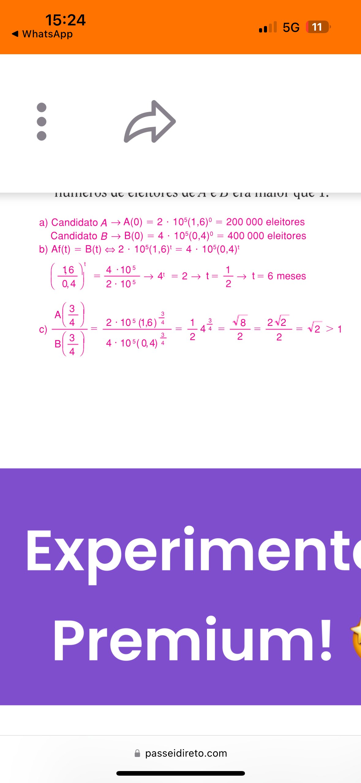 <p>15:24 5G 11 WhatsApp a) Candidato A -> 105(1,6)° = 200 000 eleitores Candidato B = 400 000 eleitores b) Af(t) = B(t) ( 0,4 ) = 4 2 1 6 meses 3 A 3 4 c) 4 = 2 = = 3 2 B 4 Experimento Premium! passeidireto.com</p>