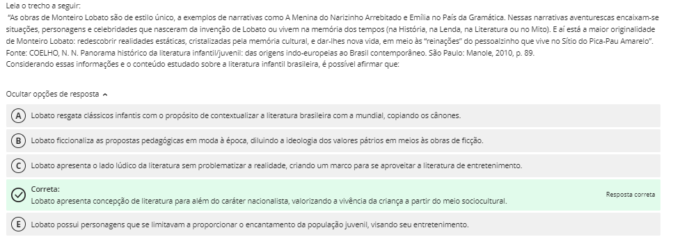 <p>Leia trecho a seguir: "As obras de Monteiro Lobato são de estilo único, a exemplos de narrativas como A Menina do Narizinho Arrebitado e Emilia no País da Nessas narrativas aventurescas encaixam-se situações, personagens e celebridades que nasceram da invenção de Lobato ou vivem na memoria dos tempos (na História, na Lenda, na Literatura ou no Mito). E ai está a maior originalidade de Monteiro Lobato: realidades estáticas, cristalizadas pela memoria cultural, e dar-lhes nova vida, em meio às "reinações" do pessoalzinho que vive no Sítio do Pica-Pau Fonte: COELHO, N.N. Panorama histórico da literatura infantil/juvenil: das origens indo-europeias ao Brasil São Paulo: Manole, 2010, p. 89. Considerando essas informações e estudado sobre a literatura infantil brasileira, é possível afirmar que: Ocultar opções de resposta A Lobato resgata classicos infantis com propósito de contextualizar a literatura brasileira com a mundial, copiando os cânones. B Lobato ficcionaliza as propostas em moda à época, diluindo a ideologia dos valores pátrios em meios às obras de ficção. Lobato apresenta lado lúdico da literatura sem problematizar a realidade, criando um marco para se aproveitar a literatura de entretenimento. Correta: Resposta correta Lobato apresenta concepção de literatura para além do caráter nacionalista, valorizando a vivência da criança a partir do meio E Lobato possui personagens que se limitavam a proporcionar encantamento da população juvenil, visando seu</p>