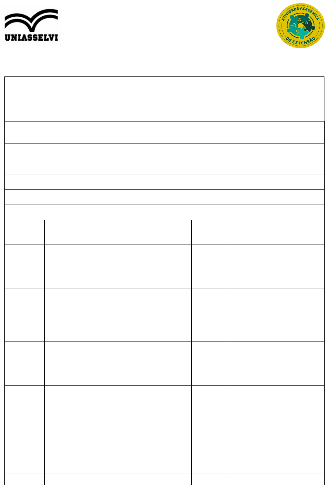 <p>CENTRO UNIVERSITÁRIO LEONARDO DA VINCI UNIASSELVI</p><p>FICHA DE FREQUÊNCIA DA ATIVIDADE DE EXTENSÃO</p><p>ACADÊMICO: CÍNTIA OLIVEIRA CAMARGO RIETH</p><p>MATRÍCULA: 7285887</p><p>TURMA: FLC135503PED</p><p>TÍTULO DA ATIVIDADE: Ação social de apoio no atendimento de municípios e cidades que tenham decretado situação de emergência ou em estado de calamidade pública</p><p>INSTITUIÇÃO CONCEDENTE:</p><p>CNPJ DA INSTITUIÇÃO CONCEDENTE:</p><p>TELEFONE DA INSTITUIÇÃO CONCEDENTE:</p><p>E-MAIL DA INSTITUIÇÃO CONCEDENTE:</p><p>ENDEREÇO DA INSTITUIÇÃO CONCEDENTE:</p><p>Data</p><p>Etapas das atividades desenvolvidas</p><p>Número de horas</p><p>Assinatura do Responsável (instituição concedente)</p><p>1 Realizar contato prévio com a instituição responsável por receber os donativos para explicar a atividade de extensão, para identificar as necessidades do órgão/entidade.</p><p>2 Efetivar cadastro como voluntário e conhecer a forma de organização para o desenvolvimento das atividades de recebimento, triagem, organização e redistribuição de doações recebidas pelo órgão/entidade responsável.</p><p>3 Desenvolvimento de atividades de extensão no local (Recebimento, triagem, organização e redistribuição de doações) conforme necessidade do local. (atividade obrigatória)</p><p>4 Desenvolvimento de atividades de extensão no local (Recebimento, organização e redistribuição de doações) conforme necessidade do local (atividade opcional)</p><p>5 Desenvolvimento de atividades de extensão no local (Recebimento, organização e redistribuição de doações) conforme necessidade do local. (atividade opcional)</p><p>6 Desenvolvimento de atividades de extensão no local (Recebimento, organização e redistribuição de doações) conforme necessidade do local. (atividade opcional)</p><p>7 Desenvolvimento de atividades de extensão no local (Recebimento, organização e redistribuição de doações) conforme necessidade do local. (atividade opcional)</p><p>8 Desenvolvimento de atividades de extensão no local (Recebimento, organização e redistribuição de doações) conforme necessidade do local. (atividade opcional)</p><p>9 Desenvolvimento de atividades de extensão no local (Recebimento, organização e redistribuição de doações) conforme necessidade do local. (atividade opcional)</p><p>10 Desenvolvimento de atividades de extensão no local (Recebimento, organização e redistribuição de doações) conforme necessidade do local. (atividade opcional)</p><p>11 Desenvolvimento de atividades de extensão no local (Recebimento, organização e redistribuição de doações) conforme necessidade do local. (atividade opcional)</p><p>12 Registrar, por meio de fotos e vídeos, a sua atuação no projeto.</p><p>13 Realizar uma entrevista (por escrito) com o responsável pelo local, com registros dos seguintes dados/percepções: Nome e função do responsável; A importância da doação e de ações de conscientização em momentos de situação de emergência.</p><p>14 Preenchimento da ficha de frequência, organização das evidências e elaboração de um relato descritivo da entrevista com o responsável pelo local.</p><p>15 Inserção da ficha de frequência (assinada e carimbada), das evidências (fotos, vídeos) e o relato descritivo no Ambiente de Aprendizagem (AVA) Uniasselvi para validação da atividade de extensão.</p><p>TOTAL DE HORAS</p><p>Declaro para os devidos fins que as informações acima prestadas são verdadeiras, sob pena de incorrer na prática do delito previsto no artigo 299 do Código Penal Brasileiro.</p><p>Data:</p><p>______________________________________________</p><p>Assinatura e carimbo do responsável da Instituição Concedente</p><p>image1.png</p><p>image2.png</p><p>image3.png</p><p>image30.png</p>