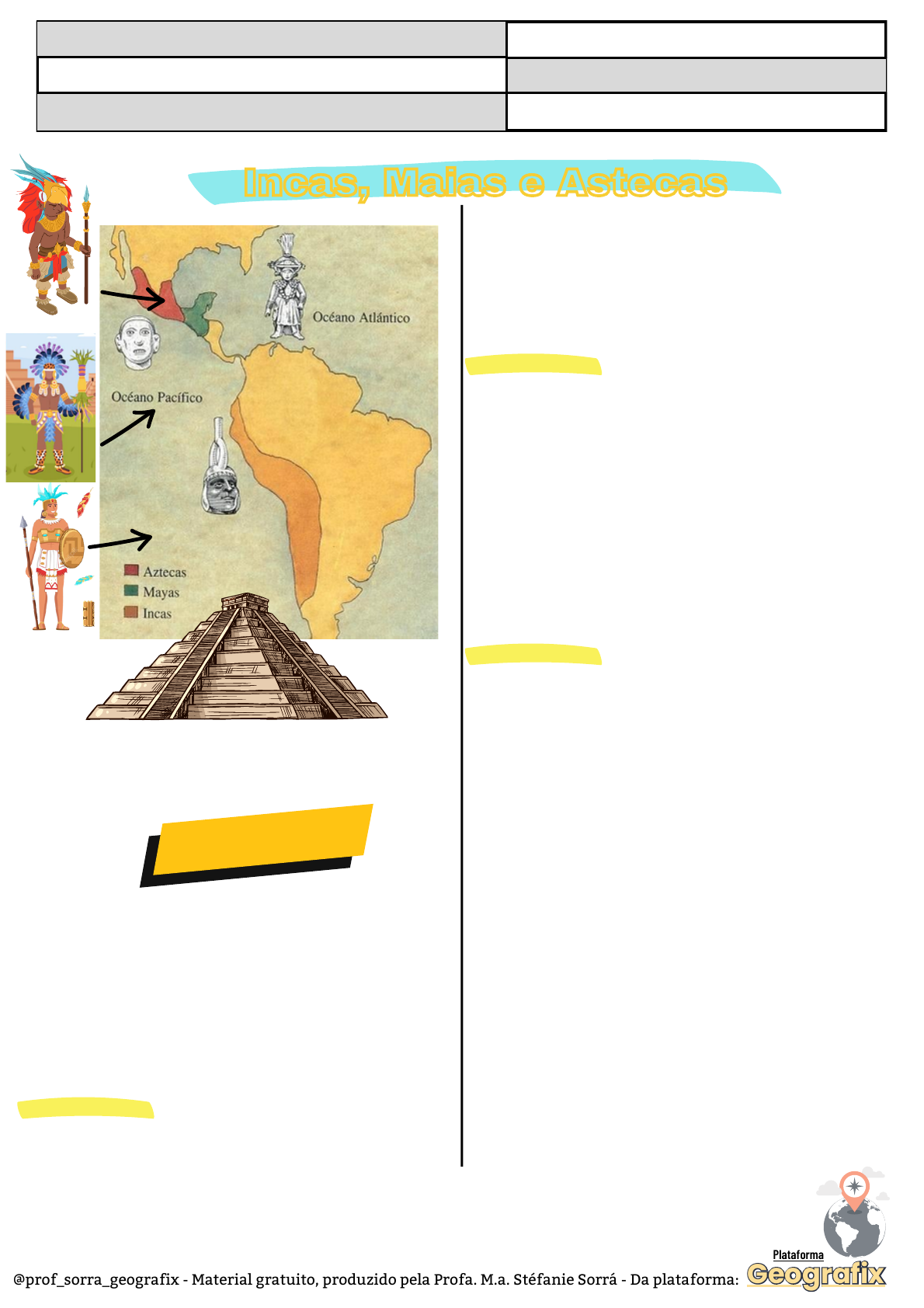 <p>Escola:</p><p>Aluno (a):</p><p>Professor(a):</p><p>Data:</p><p>Turma:</p><p>Comp. Curric.:</p><p>GeografixGeografix</p><p>Plataforma</p><p>Incas, Maias e Astecas</p><p>Incas, Maias e Astecas</p><p>ALÉM DISSO, OS INCAS DESENVOLVERAM UM</p><p>SISTEMA DE ESTRADAS E PONTES</p><p>IMPRESSIONANTE, QUE AJUDAVA NA</p><p>COMUNICAÇÃO E NO COMÉRCIO ENTRE SUAS</p><p>CIDADES.</p><p>OS ASTECAS SE ESTABELECERAM NO VALE DO</p><p>MÉXICO E FUNDARAM A CIDADE DE</p><p>TENOCHTITLÁN, ATUALMENTE A CIDADE DO</p><p>MÉXICO. ELES ERAM HABILIDOSOS</p><p>CONSTRUTORES DE PIRÂMIDES, SENDO A MAIOR</p><p>DELAS O TEMPLO MAYOR. OS ASTECAS TAMBÉM</p><p>POSSUÍAM UM SISTEMA DE ESCRITA BASEADO EM</p><p>HIERÓGLIFOS, ALÉM DE SEREM AGRICULTORES</p><p>TALENTOSOS E DOMINAREM TÉCNICAS DE</p><p>IRRIGAÇÃO.</p><p>OS MAIAS HABITAVAM PRINCIPALMENTE A REGIÃO</p><p>QUE COMPREENDE ATUALMENTE A GUATEMALA,</p><p>HONDURAS E SUL DO MÉXICO. ELES</p><p>CONSTRUÍRAM GRANDES CIDADES, COMO TIKAL, E</p><p>ERAM CONHECIDOS POR SUAS PIRÂMIDES E</p><p>TEMPLOS IMPRESSIONANTES. OS MAIAS</p><p>DESENVOLVERAM UM SISTEMA DE ESCRITA</p><p>COMPLEXO E TINHAM CONHECIMENTOS</p><p>AVANÇADOS EM ASTRONOMIA.</p><p>ESSAS CIVILIZAÇÕES ERAM ORGANIZADAS EM</p><p>SOCIEDADES COMPLEXAS, COM GOVERNANTES</p><p>PODEROSOS E UMA ESTRUTURA SOCIAL BEM</p><p>DEFINIDA. A RELIGIÃO TINHA UM PAPEL CENTRAL</p><p>EM SUAS VIDAS, E OS RITUAIS E SACRIFÍCIOS ERAM</p><p>COMUNS. A AGRICULTURA DESEMPENHAVA UM</p><p>PAPEL FUNDAMENTAL NA SUBSISTÊNCIA DESSAS</p><p>CIVILIZAÇÕES, COM DESTAQUE PARA O CULTIVO</p><p>DO MILHO PELOS ASTECAS.</p><p>@prof_sorra_geografix - Material gratuito, produzido pela Profa. M.a. Stéfanie Sorrá - Da plataforma:</p><p>AS CIVILIZAÇÕES DOS INCAS, ASTECAS E MAIAS</p><p>FORAM TRÊS IMPORTANTES CULTURAS PRÉ-</p><p>COLOMBIANAS QUE SE DESENVOLVERAM NA</p><p>AMÉRICA LATINA ANTES DA CHEGADA DOS</p><p>EUROPEUS. CADA UMA DESSAS CIVILIZAÇÕES TINHA</p><p>SUAS PRÓPRIAS CARACTERÍSTICAS E REALIZAÇÕES</p><p>SIGNIFICATIVAS.</p><p>OS INCAS VIVERAM NA REGIÃO DOS ANDES, ONDE</p><p>ATUALMENTE ESTÁ LOCALIZADO O PERU. ELES</p><p>CONSTRUÍRAM A CIDADE DE MACHU PICCHU, QUE</p><p>ERA UMA IMPORTANTE ÁREA DE CULTO E</p><p>ADMINISTRAÇÃO.</p><p>TEXTO DE APOIO</p><p>O Templo de Kukulkán ou Pirâmide de Kukulkán, foi construído</p><p>pelos Maias itzáes na antiga cidade de Chichén Itzá. Sua construção</p><p>foi iniciada no século VI d.c, tendo sido posteriormente ampliado</p><p>nos séculos VIII e XI d.c</p><p>FO</p><p>N</p><p>TE</p><p>: C</p><p>U</p><p>RS</p><p>O</p><p>E</p><p>N</p><p>EM</p><p>G</p><p>RA</p><p>TU</p><p>IT</p><p>O</p><p>http://geografix.club.hotmart.com/</p><p>http://geografix.club.hotmart.com/</p><p>http://geografix.club.hotmart.com/</p><p>rocha</p><p>Retângulo</p><p>rocha</p><p>Retângulo</p><p>GeografixGeografix</p><p>Plataforma</p><p>NO ENTANTO, APESAR DE SUAS REALIZAÇÕES</p><p>IMPRESSIONVEIS, TODAS AS TRÊS CIVILIZAÇÕES</p><p>FORAM CONQUISTADAS PELOS ESPANHÓIS</p><p>DURANTE A COLONIZAÇÃO EUROPEIA,</p><p>RESULTANDO NO DECLÍNIO DESSAS CULTURAS.</p><p>ATUALMENTE, PODEMOS APRENDER SOBRE ESSAS</p><p>CIVILIZAÇÕES POR MEIO DE ESTUDOS</p><p>ARQUEOLÓGICOS E HISTÓRICOS, QUE NOS</p><p>PERMITEM COMPREENDER SUA RICA HERANÇA</p><p>CULTURAL E SUAS CONTRIBUIÇÕES PARA A</p><p>HISTÓRIA DA HUMANIDADE</p><p>__________________________________________________</p><p>ATIVIDADE</p><p>QUAL DAS SEGUINTES CIVILIZAÇÕES CONSTRUIU</p><p>A CIDADE DE MACHU PICCHU?</p><p>1.</p><p>A) INCAS</p><p>B) ASTECAS</p><p>C) MAIAS</p><p>2.QUAL CIVILIZAÇÃO ERA CONHECIDA POR SUA</p><p>HABILIDADE NA CONSTRUÇÃO DE PIRÂMIDES?</p><p>A) INCAS</p><p>B) ASTECAS</p><p>C) MAIAS</p><p>3. QUAL CIVILIZAÇÃO DESENVOLVEU UM SISTEMA</p><p>DE ESCRITA BASEADO EM HIERÓGLIFOS?</p><p>A) INCAS</p><p>B) ASTECAS</p><p>C) MAIAS</p><p>4.QUAL CIVILIZAÇÃO UTILIZAVA O SISTEMA DE</p><p>TERRAÇOS PARA A AGRICULTURA?</p><p>A) INCAS</p><p>B) ASTECAS</p><p>C) MAIAS</p><p>5.QUAL DAS SEGUINTES CIVILIZAÇÕES CONSTRUIU</p><p>A CIDADE DE MACHU PICCHU?</p><p>A) INCAS</p><p>B) ASTECAS</p><p>C) MAIAS</p><p>6. DESCREVA BREVEMENTE A LOCALIZAÇÃO</p><p>GEOGRÁFICA DOS INCAS, ASTECAS E MAIAS.</p><p>_______________________________________________________</p><p>_______________________________________________________</p><p>_______________________________________________________</p><p>_______________________________________________________</p><p>7.CITE DUAS REALIZAÇÕES ARQUITETÔNICAS DAS</p><p>CIVILIZAÇÕES MAIAS.</p><p>_______________________________________________________</p><p>_______________________________________________________</p><p>_______________________________________________________</p><p>_______________________________________________________</p><p>8. EXPLIQUE A IMPORTÂNCIA DO CULTIVO DO</p><p>MILHO PARA AS CIVILIZAÇÕES ASTECAS.</p><p>_______________________________________________________</p><p>_______________________________________________________</p><p>_______________________________________________________</p><p>_______________________________________________________</p><p>@prof_sorra_geografix - Material gratuito, produzido pela Profa. M.a. Stéfanie Sorrá - Da plataforma:</p><p>FO</p><p>N</p><p>TE</p><p>:E</p><p>N</p><p>SI</p><p>N</p><p>A</p><p>RH</p><p>IS</p><p>TO</p><p>RI</p><p>A</p><p>.C</p><p>O</p><p>M</p><p>.B</p><p>R</p><p>AS CHINAMPAS FORAM INVENTADAS</p><p>PELOS ASTECAS. TÉCNICA USADA NA</p><p>AGRICULTURA ASTECA QUE SE BASEIA EM</p><p>ILHAS ARTIFICIAIS CONSTRUÍDAS DE</p><p>MADEIRA ENTRELAÇADA E PREENCHIDA</p><p>COM TERRA E MATERIAIS ORGÂNICOS.</p><p>http://geografix.club.hotmart.com/</p><p>http://geografix.club.hotmart.com/</p><p>http://geografix.club.hotmart.com/</p><p>rocha</p><p>Retângulo</p><p>rocha</p><p>Retângulo</p><p>rocha</p><p>Retângulo</p><p>GeografixGeografix</p><p>Plataforma</p><p>9.QUAIS FORAM AS PRINCIPAIS</p><p>CONTRIBUIÇÕES DOS INCAS NA ÁREA DA</p><p>ENGENHARIA?</p><p>______________________________________________</p><p>_________