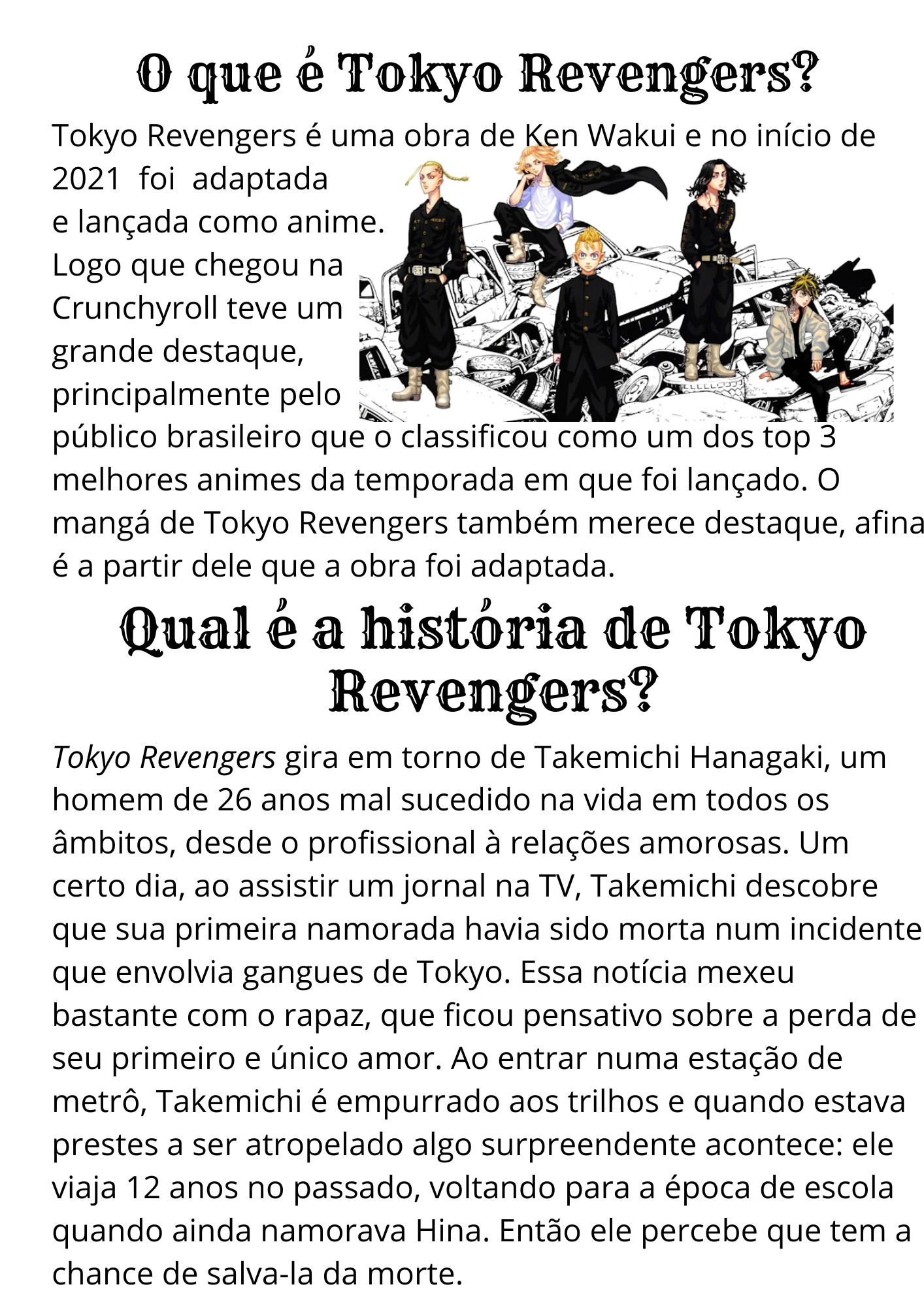 <p>O que é Tokyo Revengers? Tokyo Revengers é uma obra de Ken Wakui e no início de 2021 foi adaptada e lançada como anime. Logo que chegou na Crunchyroll teve um grande destaque, principalmente pelo público brasileiro que o classificou como um dos top 3 melhores animes da temporada em que foi lançado. O mangá de Tokyo Revengers também merece destaque, afina é a partir dele que a obra foi adaptada. Qual é a história de Tokyo Revengers? Tokyo Revengers gira em torno de Takemichi Hanagaki, um homem de 26 anos mal sucedido na vida em todos os âmbitos, desde profissional à relações amorosas. Um certo dia, ao assistir um jornal na TV, Takemichi descobre que sua primeira namorada havia sido morta num incidente que envolvia gangues de Tokyo. Essa notícia mexeu bastante com rapaz, que ficou pensativo sobre a perda de seu primeiro e único amor. Ao entrar numa estação de metrô, Takemichi é empurrado aos trilhos e quando estava prestes a ser atropelado algo surpreendente acontece: ele viaja 12 anos no passado, voltando para a época de escola quando ainda namorava Hina. Então ele percebe que tem a chance de salva-la da morte.</p>