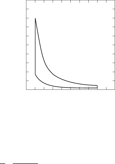 <p>Chapter 2</p><p>Heat Engine Cycles</p><p>2.1) An engine cylinder contains 7 × 10−5 kg of fuel with a heat of combustion, qc, of 45,000 kJ/kg. The</p><p>volume V1 at top dead center is 0.15×10−3 m3, and the volume V2 at bottom dead center is 1.50×10−3</p><p>m3. The air-fuel ratio is 16:1, and the mixture temperature T1 at the start of compression is 300 K.</p><p>Modeling the compression and combustion as an ideal gas (γ = 1.4, cv = 0.71 kJ/kg K) Otto cycle, (a)</p><p>what is the maximum temperature T3 and pressure P3 , (b) What is the pressure P1 at the start of</p><p>compression?</p><p>3</p><p>2</p><p>1</p><p>4</p><p>Volume (V/V2)</p><p>P</p><p>re</p><p>s</p><p>s</p><p>u</p><p>re</p><p>(</p><p>P</p><p>/P</p><p>1</p><p>)</p><p>Figure 2.1: Problem 2-1 P-V plot</p><p>a) The heat input is given by:</p><p>Qin = mfqc = mqin =</p><p>(</p><p>7.0× 10−5</p><p>)</p><p>(45,000)</p><p>Qin = 3.15kJ</p><p>The compression ratio is given by:</p><p>r =</p><p>V1</p><p>V2</p><p>=</p><p>1.50× 10−3</p><p>0.15× 10−3</p><p>r = 10</p><p>1</p><p>2 CHAPTER 2. HEAT ENGINE CYCLES</p><p>Process 1-2: isentropic compression</p><p>T2 = T1r</p><p>γ−1 = (300) (10)</p><p>1.4−1</p><p>T2 = 753K</p><p>Process 2-3: constant volume heat addition</p><p>T3 =</p><p>Qin</p><p>mcv</p><p>+ T2</p><p>The mass of gas in the cylinder:</p><p>m = ma +mf = mf (1 +AF ) =</p><p>(</p><p>7× 10−5</p><p>)</p><p>(1 + 16)</p><p>m = 1.19× 10−3 kg</p><p>The maximum temperature:</p><p>T3 =</p><p>Qin</p><p>mcv</p><p>+ T2 =</p><p>3.15</p><p>(</p><p>1.19× 10−3</p><p>)</p><p>(0.71)</p><p>+ 753</p><p>T3 = 4481K</p><p>The maximum pressure:</p><p>P3 =</p><p>mRT3</p><p>V3</p><p>=</p><p>(</p><p>1.19× 10−3</p><p>)</p><p>(0.287) (4481)</p><p>0.15× 10−3</p><p>P3 = 10,203kPa</p><p>b) Working backwards</p><p>P2 =</p><p>P3T2</p><p>T3</p><p>=</p><p>(10,203) (753)</p><p>4481</p><p>P2 = 1714kPa</p><p>P1 =</p><p>P2</p><p>rγ</p><p>=</p><p>1714</p><p>101.4</p><p>P1 = 68.2kPa</p><p>(Slightly throttled from Patm = 101 kPa)</p><p>3</p><p>2.2) The Lenoir air cycle is composed of three processes: 1-2 constant volume heat addition, 2-3 isentropic</p><p>expansion, and 3-1 constant pressure heat rejection. This cycle is named after Jean Lenoir (1822-1900),</p><p>a Belgian engineer who developed an internal combustion engine in 1858. It is a cycle in which com-</p><p>bustion occurs without compression of the mixture. (a) Draw the Lenoir cycle on p − V and T − s</p><p>diagrams, (b) Assuming the working fluid is an ideal gas with constant properties, derive an expression</p><p>for the thermal efficiency of the Lenoir air cycle, and (c) Compare the Lenoir cycle thermal efficiency</p><p>to the Otto cycle efficiency for standard atmospheric pressure and temperature, Qin = 1000 J, r = 8,</p><p>m = 1.0 g, and γ = 1.4.</p><p>The p− V and T − s diagrams are shown below:</p><p>3</p><p>2</p><p>1</p><p>Volume</p><p>P</p><p>re</p><p>s</p><p>s</p><p>u</p><p>re</p><p>Figure 2.2: Problem 2-2 p− V plot</p><p>3</p><p>2</p><p>1</p><p>Entropy</p><p>T</p><p>e</p><p>m</p><p>p</p><p>e</p><p>ra</p><p>tu</p><p>re</p><p>Figure 2.3: Problem 2-2 T − s plot</p><p>4 CHAPTER 2. HEAT ENGINE CYCLES</p><p>Process 1-2: Constant volume heat addition</p><p>T2 =</p><p>Q1−2</p><p>mcv</p><p>+ T1</p><p>=</p><p>1000</p><p>(1)(0.72)</p><p>+ 298</p><p>= 1687K</p><p>Process 2-3: Isentropic expansion</p><p>T3 = T2 (1/r)</p><p>γ−1</p><p>= 1687(1/8)0.4</p><p>= 734K</p><p>The Lenoir cycle thermal efficiency is</p><p>η =</p><p>Wout</p><p>Qin</p><p>= 1−</p><p>Qout</p><p>Qin</p><p>= 1−</p><p>mcp(T3 − T1)</p><p>mcv(T2 − T1)</p><p>= 1− γ</p><p>(T3 − T1)</p><p>(T2 − T1)</p><p>= 1− 1.4</p><p>(734− 298)</p><p>(1687− 298)</p><p>= 0.56</p><p>The Otto cycle efficiency is η = 1− r1−γ= 0.565, slightly greater than the Lenoir cycle.</p><p>5</p><p>2.3) (a) Show for an Otto cycle that T3/T2 = T4/T1. (b) Derive the Otto cycle efficiency equation, Equation</p><p>(2.10).</p><p>3</p><p>2</p><p>1</p><p>4</p><p>Volume (V/V2)</p><p>P</p><p>re</p><p>s</p><p>s</p><p>u</p><p>re</p><p>(</p><p>P</p><p>/P</p><p>1</p><p>)</p><p>Figure 2.4: Problem 2-3 P-V plot</p><p>a) From the cycle analysis of Section 2.2; for an isentropic compression:</p><p>T2</p><p>T1</p><p>= rγ−1</p><p>T4</p><p>T3</p><p>=</p><p>(</p><p>1</p><p>r</p><p>)γ−1</p><p>(</p><p>T2</p><p>T1</p><p>)</p><p>·</p><p>(</p><p>T4</p><p>T3</p><p>)</p><p>= 1</p><p>T3</p><p>T2</p><p>=</p><p>T4</p><p>T1</p><p>b) The thermal efficiency is</p><p>η = 1−</p><p>Qin</p><p>Qout</p><p>Qout = mc (T4 − T3)</p><p>Qin = mc (T3 − T2)</p><p>Substituting we obtain</p><p>η = 1−</p><p>Qin</p><p>Qout</p><p>= 1−</p><p>T4 − T1</p><p>T3 − T2</p><p>= 1−</p><p>T1</p><p>(</p><p>T4</p><p>T1</p><p>− 1</p><p>)</p><p>T2</p><p>(</p><p>T3</p><p>T2</p><p>− 1</p><p>)</p><p>η = 1−</p><p>T1</p><p>T2</p><p>6 CHAPTER 2. HEAT ENGINE CYCLES</p><p>2.4) Derive the Otto and Diesel cycle imep equation, Equation (2.11).</p><p>The imep is defined as:</p><p>imep =</p><p>W</p><p>Vd</p><p>W = η ·Qin</p><p>r =</p><p>Vc + Vd</p><p>Vc</p><p>−→ Vc =</p><p>Vd</p><p>r − 1</p><p>V1 = Vc + Vd = Vd</p><p>(</p><p>r</p><p>r − 1</p><p>)</p><p>imep</p><p>P1</p><p>=</p><p>(</p><p>1</p><p>P1</p><p>)(</p><p>η ·Qin</p><p>V1</p><p>)(</p><p>r</p><p>r − 1</p><p>)</p><p>7</p><p>2.5) For equal maximum temperature and heat input, which cycle will be more efficient, the Diesel or Otto?</p><p>Prove your answer by comparing the two cycles on the T − s diagram. The two cycles should have a</p><p>common state corresponding to the start of compression.</p><p>The two cycles are plotted on the Figure below, labeled as Diesel (d) and Otto (o). The common start</p><p>of compression is labeled point 1. If the Diesel cycle is assumed to have a greater compression ratio</p><p>than the Otto cycle, then T2d > T2o. The constant pressure heat addition line for the Diesel cycle has</p><p>a smaller slope than the constant volume heat addition line for the Ot