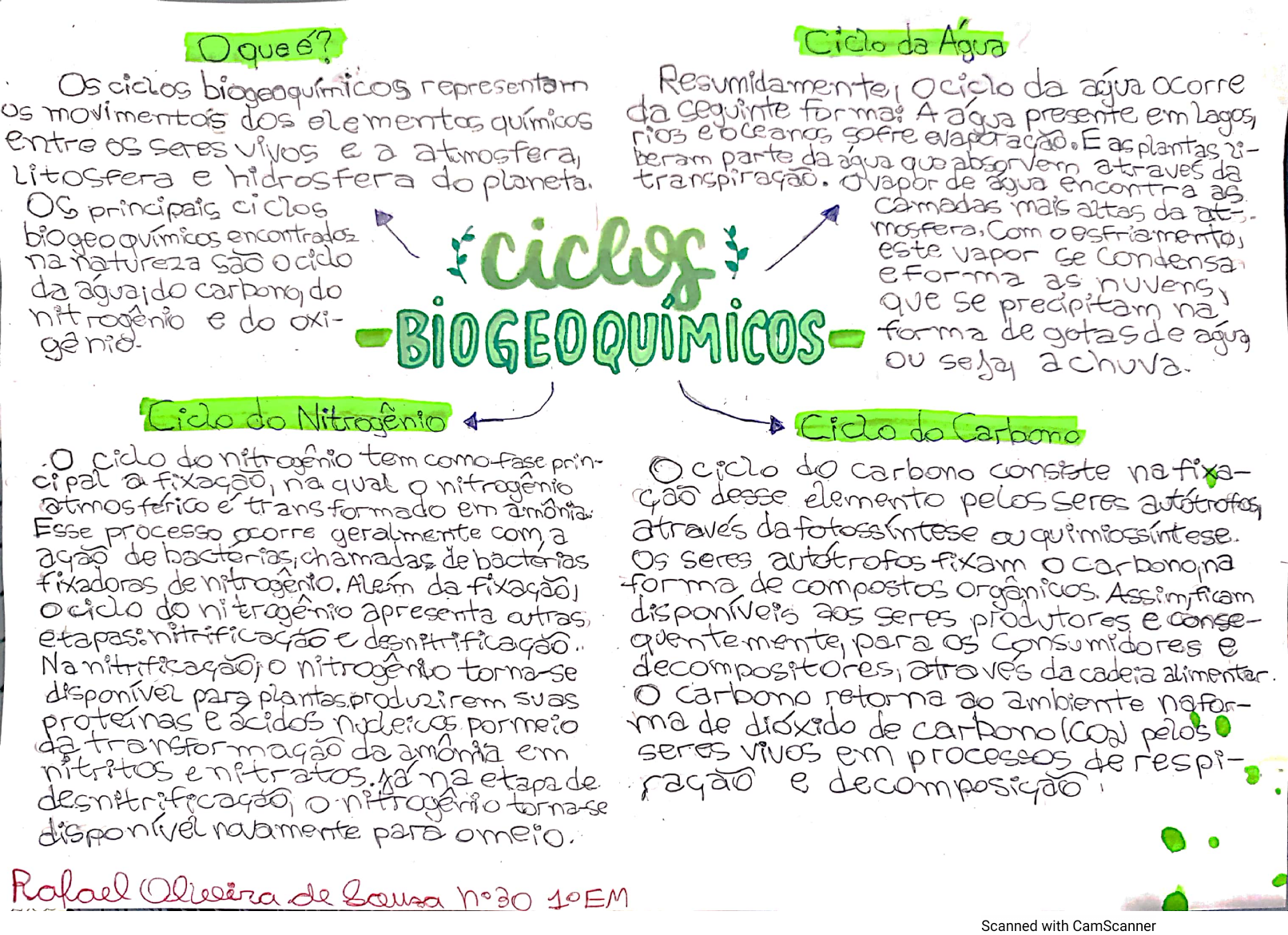 <p>quee? da Agua Os ciclos biogeoquimicos representam Resumidamente da agua ocorre movimento's dos ele mentos da seguinte A agua presente em Lagos, entre vivos e a rios sofre E as plantas 2i- Litosfera e hidrosFera do planeta. Beram parte atraves da ovapor de agua encontra as OS principais ciclos camadas mais da at- encontratos da carbono, do mosfera, Com na natureza sao Ocido este vapor condensa eForma as nuvens, hit rogenio e do get se precipitam forma de gotasde ou sesa do Nitrogenio do Carbono do tem como-Fase prin- cipal a na qual ciclo do carbono consiste nafixa- atmosterico e tr ans formado em desse elemento pelos seres Esse processo geralmente a da fotoss a quimiossint ese. do bacterias, chamadas de bacterias OS seres autotrofos fixam car Fixadoras de nitrogenio. Alem da do apresenta forma de compostos disponíveis 205 seres e conse- e para Consumidores e nitroge torna-se decompositores, ves para plantas.pr suas retorna ambiente proteinas e acidos pormeio da em ma do dioxido de pelos nitritos enits atos. na etapa de seres vivos em processos de respi- 0 torna-se e disponível para omeio. Rafael de Sousa 10EM Scanned with CamScanner</p>