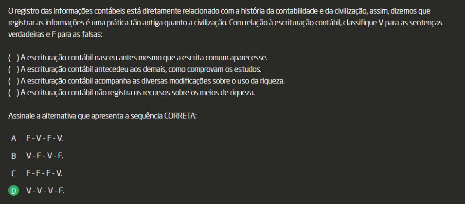 <p>0 registro das informações contábeis está diretamente relacionado com a história da contabilidade e da civilização, assim, dizemos que registrar as informações é uma prática tão antiga quanto a civilização. Com relação à escrituração contábil, classifique V para as sentenças verdadeiras e F para as falsas: ( ) A escrituração contábil nasceu antes mesmo que a escrita comum aparecesse. ( ) A escrituração contábil antecedeu aos demais, como comprovam estudos. ( ) A escrituração contábil acompanha as diversas modificações sobre uso da ( ) A escrituração contábil não registra os recursos sobre os meios de Assinale a alternativa que apresenta a sequência CORRETA: A F-V-F-V B V-F-V-F D</p>