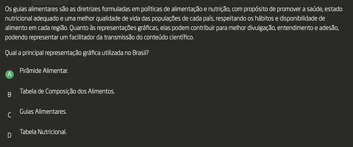 <p>Os guias alimentares são as diretrizes formuladas em políticas de promover a saúde, estado nutricional e uma melhor qualidade de vida das populações de cada país, respeitando os hábitos e disponibilidade de alimento em cada região. Quanto às representações gráficas, elas podem contribuir para melhor divulgação, entendimento e adesão, podendo representar um facilitador da transmissão do conteúdo científico. Qual a principal representação gráfica utilizada no Brasil? Pirâmide Alimentar. A B Tabela de Composição dos Alimentos. Guias Alimentares. Tabela Nutricional. D</p>