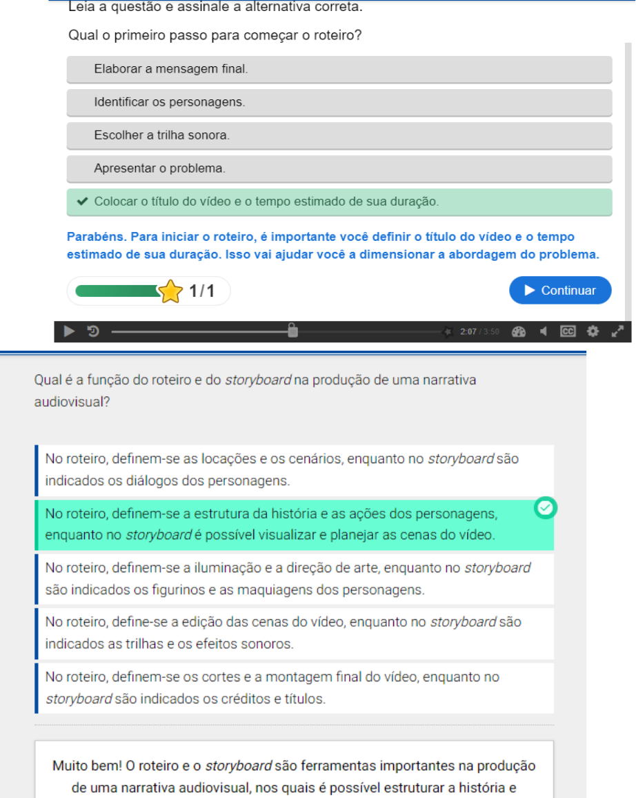 <p>Modulo 2</p><p>Unidade 3</p><p>Qual é a diferença entre "interação" e "interatividade"? Como você define esses dois conceitos na sua prática profissional?</p><p>Na prática profissional, "interação" refere-se à troca de informações entre elementos, enquanto "interatividade" descreve a capacidade de sistemas responderem dinamicamente às ações dos usuários, facilitando uma experiência participativa</p><p>Você já utilizou algum tipo de interatividade em sua rotina de trabalho? De que forma avalia se elas são ou não eficazes?</p><p>Um exemplo claro de interatividade são as redes sociais, onde os usuários podem compartilhar conteúdo, comentar, curtir e interagir uns com os outros de forma instantânea.</p><p>Feedback dos usuários, Métricas de desempenho, Análise de dados,</p><p>Quais técnicas de aprendizagem ativa você conhece que são mais eficazes para o seu dia a dia?</p><p>As metodologias ativas mais conhecidas são a Aprendizagem Classroom, Sala de Aula Invertida e Aprendizagem Cooperativa. Cada uma enfatiza diferentes aspectos da participação do aluno.</p><p>Levantamento de conhecimentos prévios; Gamificação onde podem oferecer recursos de jogos, como missões, quizzes e estudos divididos em etapas, para criar um caminho de aprendizagem divertido.</p><p>O que você entende por gamificação? Conhece elementos de gamificação que podem ser incorporados em sua prática de atuação?</p><p>A gamificação pode incluir elementos como: Narrativa, Feedback, Cooperação, Pontuações, Competição, Recompensas, Desafios, Rankings.</p><p>A gamificação pode ser usada para:</p><p>Engajar os alunos e promover reflexões;Estimular os alunos a solucionar problemas e desafios; Aumentar a motivação dos alunos; Criar competições; Conquistar níveis ou pontos; Atribuir recompensas; Promover a participação ativa; Estimular a troca de experiências; Melhorar a cultura organizacional; Impulsionar o engajamento, a motivação e o desempenho dos colaboradores; Estabelecer metas desafiadoras.</p><p>Você conhece a utilização do storytelling para a criação de trilhas de aprendizagem ou trilhas de aprendizagem gamificadas?</p><p>As trilhas de aprendizagem gamificadas alinham os colaboradores com as necessidades atuais e futuras da organização ao desenvolver suas habilidades técnicas e comportamentais de maneira linear ou agrupada no meio educacional.</p><p>Unidade 4</p><p>No início desta unidade, você leu e refletiu sobre as questões a seguir. Agora, elas estão sendo retomadas para que você tenha a chance de respondê-las a partir do conhecimento acumulado ao longo dessa trajetória. Mais uma vez, se desejar, faça anotações. Depois, compare os dois momentos e observe a mudança de perspectiva.</p><p>O que você entende por avaliação orientada por competências?</p><p>é uma análise da performance dos funcionários de uma empresa que relaciona o desempenho atual do profissional com as competências desejadas para determinado cargo.</p><p>O que você acha que constitui uma "boa prática" de avaliação do processo de aprendizagem? Já considerou que é possível incorporar técnicas de storytelling nessa prática?</p><p>A avaliação da aprendizagem deve ser vista como um mecanismo para que o professor possa detectar as dificuldades dos alunos,</p><p>Qual é a importância de uma rubrica de avaliação e como ela pode ser usada para avaliar o desempenho dos seus pares e/ou alunos?</p><p>A rubrica de avaliação é uma ferramenta essencial para fornecer critérios claros e objetivos para avaliar o desempenho de pares ou alunos.</p><p>Como você fornece feedbacks aos seus pares e/ou alunos? Considerando o que aprendeu sobre storytelling até aqui, como acredita que poderia trabalhar com esse conceito na construção de feedbacks?</p><p>O feedback na escola representa um momento de interação significativa entre o estudante e seu professor(a), com foco no desempenho e desenvolvimento geral do aluno.</p><p>Mod 3</p><p>image6.png</p><p>image7.png</p><p>image8.png</p><p>image9.png</p><p>image10.png</p><p>image11.png</p><p>image12.png</p><p>image13.png</p><p>image14.png</p><p>image15.png</p><p>image16.png</p><p>image17.png</p><p>image18.png</p><p>image19.png</p><p>image20.png</p><p>image21.png</p><p>image1.png</p><p>image2.png</p><p>image3.png</p><p>image4.png</p><p>image5.png</p>