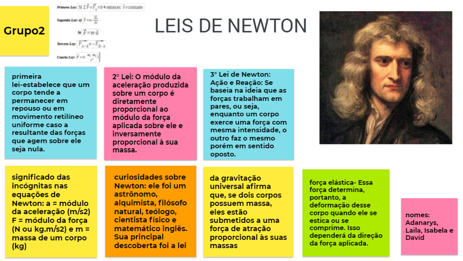 <p>Segunda a) Grupo2 LEIS DE NEWTON primeira Lei: o módulo da Lei de Newton: lei-estabelece que um aceleração produzida Ação e Reação: Se corpo tende a sobre um corpo é baseia na ideia que as permanecer em diretamente forças trabalham em repouso ou em proporcional ao pares, ou seja, movimento retilíneo módulo da força enquanto um corpo uniforme caso a aplicada sobre ele e exerce uma força com resultante das forças mesma intensidade, o inversamente que agem sobre ele outro faz o mesmo proporcional à sua seja nula. porém em sentido massa. oposto. significado das curiosidades sobre da gravitação incógnitas nas Newton: ele foi um universal afirma força elástica- Essa força determina, equações de que, se dois corpos portanto, a Newton: a = módulo alquimista, filósofo possuem massa, deformação desse da aceleração (m/s2) natural, teólogo, eles estão corpo quando ele se F = módulo da força cientista físico e submetidos a uma estica ou se A (N ou kg.m/s2) e m = matemático inglês. força de atração comprime. Isso L massa de um corpo Sua principal proporcional às suas dependerá da direção D (kg) descoberta foi a lei massas da força aplicada.</p>