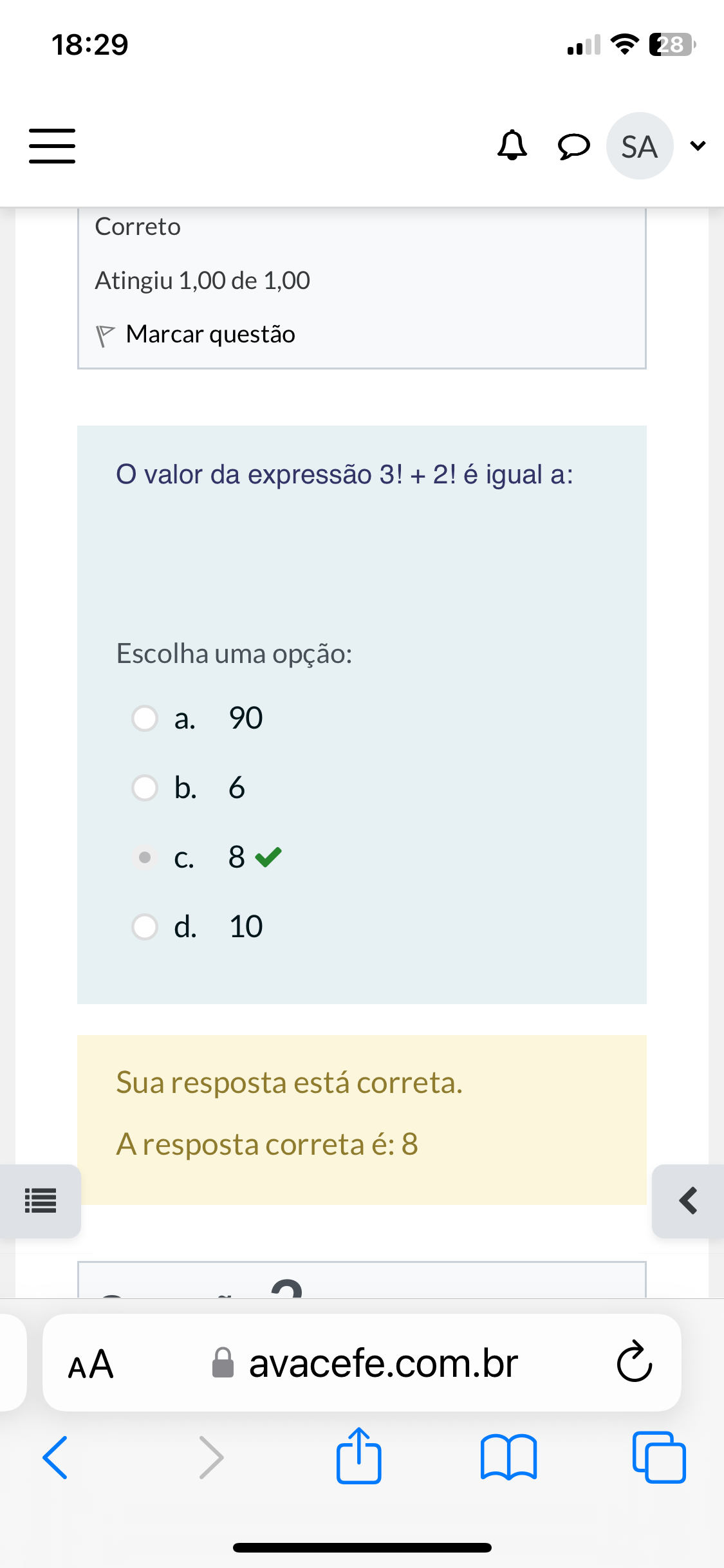 <p>18:29 28 Correto Atingiu 1,00 de 1,00 P Marcar questão valor da expressão 3! + 2! é igual a: Escolha uma opção: a. 90 b. 6 C. 8 d. 10 Sua resposta está correta. A resposta correta é: 8 AA avacefe.com.br</p>