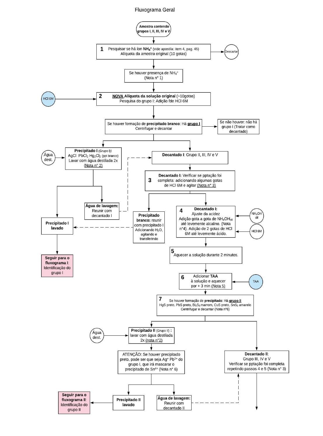 <p>Continua</p><p>FLUXOGRAMA I</p><p>(Grupo I)</p><p>FLUXOGRAMA II</p><p>(Grupo II)</p><p>FLUXOGRAMA III</p><p>(Grupo IIIa)</p><p>FLUXOGRAMA IV</p><p>(Grupo IIIb)</p><p>FLUXOGRAMA V</p><p>(Grupo IV)</p><p>FLUXOGRAMA VI</p><p>(Grupo V)</p><p>ANEXO 1</p><p>Nota n° 1:</p><p>Uma vez que o íon amônio foi encontrado, deve-se tentar eliminá-lo ao máximo para</p><p>identificação do íon potássio do Grupo V, a ser utilizado mais adiante.</p><p>Deve-se tomar uma alíquota de 25 a 30 gotas da amostra original e deixá-la sob</p><p>aquecimento, no banho-maria por 2 horas, aproximadamente. Depois de transcorrido</p><p>esse tempo, pode-se proceder à identificação do íon K+ direto na amostra, já que os</p><p>teores de NH4OH estão bem reduzidos, por conta do aquecimento. Toma-se o tubo de</p><p>ensaio, dobra-se o volume da solução com água destilada e em seguida, agita-se com</p><p>bastão de vidro, vigorosamente. Esta solução deve ser dividida em 2 partes. O íon</p><p>potássio pode ser identificado com HClO4 (ácido perclórico) e/ou ácido pícrico, conforme</p><p>apostila de prática página 45, item 2a e 2b.</p><p>Nota n°2: Como lavar um precipitado.</p><p>Deve-se adicionar água destilada até ultrapassar completamente o precipitado e deixar</p><p>um pequeno excesso de água em relação ao volume ocupado pelo precipitado. Agita-se,</p><p>COM BAST��O, até que todo o precipitado entre em contato com a água adicionada.</p><p>Centrifugue. Junta-se esta água de lavagem ao decantado de onde o precipitado foi</p><p>separado originalmente.</p><p>Nota n°3: Verificando se a precipitação foi completa.</p><p>Uma vez que tenha havido a formação de precipitado, deve-se centrifugá-lo para separar</p><p>precipitado do decantado. Neste momento, dois problemas podem ocorrer:</p><p>1°) o precipitado ainda terá uma certa quantidade de decantado, por isso, deverá ser</p><p>lavado vide nota n° 2;</p><p>2°) O decantado contém alguma fração do precipitado, que ainda não precipitou, por isso</p><p>deve-se verificar se a precipitação foi completa. Como? Novamente há duas</p><p>situações.</p><p>a) Como o precipitado precisa ser lavado, é possível que haja um volume grande de</p><p>águas de lavagem, que ao serem reunidas geraram um volume grande de</p><p>solução. Assim sendo, quando houver um volume muito grande de decantado. Ao</p><p>invés de trabalhar com dois tubos de ensaio que pode ser extremamente</p><p>trabalhoso, deve-se simplificar este problema, transferindo a solução para um</p><p>becker, de 50 ou 100 ml. A este becker, deve-se juntar todo o decantado e as</p><p>águas de lavagem. Levar à chapa de aquecimento e reduzir o volume ao máximo,</p><p>até próximo da secura. Transfere-se novamente para um tubo de ensaio, não se</p><p>esquecendo de lavar o becker com pequenos volumes de água destilada, várias</p><p>vezes. Cuidado para não deixar o volume final ultrapassar 50% do volume do</p><p>tubo de ensaio.</p><p>b) Se o volume do decantado, mais as águas de lavagem formam um volume</p><p>pequeno, não precisa reduzir o volume, basta prosseguir normalmente.</p><p>continua</p><p>Continuação do ANEXO 1 página 2</p><p>Nota n°4: Ajuste da acidez.</p><p>Este ajude da acidez é crucial. Se não for muito bem feito, trará serias consequências</p><p>negativas. Assim, todo cuidado é pouco. Um dos maiores problemas também é o volume</p><p>no interior do tubo de ensaio. Como estão sendo adicionadas várias gotas de NH4OH</p><p>dil.,ainda que a adição tenha sido feita gota a gota, mas invariavelmente o volume se</p><p>torna maior, e pode ultrapassar os ¾ do volume do tubo. Se isto vier a acontecer, deve-se</p><p>fazer uso de NH4OH conc., gota a gota, testando com papel tornassol o pH da solução,</p><p>após cada gota adicionada. Mas, ATENÇÃO, use com moderação; caso contrário, o pH</p><p>ficará muito alto e 1 ou 2 gotas de HCl não serão suficientes para acidificar o meio.</p><p>Lembre-se, o pH deverá ficar neutro ou tão próximo quanto possível da neutralidade.</p><p>Lembre-se ainda que se o volume da solução estiver muito grande, não tem outra solução</p><p>senão proceder como recomendado na Nota no 3, 2a, reduzindo o volume.</p><p>Nota n° 5:</p><p>Verifique se há quantidade de água suficiente no becker do banho-maria. O tubo de</p><p>ensaio deverá ficar mergulhado na água do banho-maria; caso contrário, não será</p><p>aquecido devidamente e não haverá liberação de H2S, impedindo a precipitação dos</p><p>sulfetos. Lembre-se, falou TAA (tioacetamida), falou aquecimento.</p><p>Nota n°6:</p><p>Se houver formação de precipitado preto é porque:</p><p>1° Há precipitação de cobre como sulfeto (CuS↓) de cor preta. Mas, para que esta</p><p>precipitação ocorra, a solução amostra tem que ser azul, característica do cobre. Se a</p><p>solução for incolor, o precipitado será, no máximo, amarelo do SnS2↓ e/ou As2S3 ↓ que</p><p>também é amarelo. Embora as tonalidades de amarelo sejam diferentes</p><p>individualmente, mas ao se misturarem irão assumir um terceiro tom de amrelo, que</p><p>não será característico de nenhum dos dois.</p><p>2° Há formação de precipitado preto, bem preto, mesmo sem haver a presença de íon</p><p>cobre na amostra original. Neste caso, este precipitado poderá ser ou Pb++ (provável)</p><p>ou Ag+, provenientes do grupo I. Isso porque o Kps do PbCl2 é ~10-5, muito alto.</p><p>Consequentemente, por mais bem feita que tenha sido a separação do grupo I, grande</p><p>parte do Pb++ não precipitou e precipitará no grupo II, sob a forma de PbS↓ preto. Caso</p><p>idêntico ocorre com a prata, formando Ag2S↓ preto, em menor extensão que o Pb++,</p><p>mas ainda ocorre.</p><p>Kps (PbS)= 10-26,6 Kps (Ag2S)= 10-49,2 Kps (PbCl2)= 10-4,79 Kps AgCl= 10-9,75</p><p>A solução original é incolor, logo não contém Cu++, mas pode conter As3+ e Sn4+. E, se</p><p>houver algum(ns) cátion(
