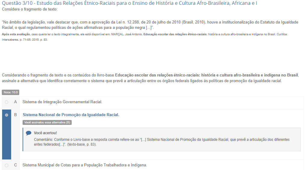 <p>Questão 3/10 - Estudo das Relações para Ensino de História e Cultura Afro-Brasileira, Africana e Considere 0 fragmento de texto: "No âmbito da vale destacar que, com a aprovação da Lei n. de 20 de julho de 2010 (Brasil, 2010), houve a institucionalização do Estatuto da Igualdade Racial, 0 qual regulamentou políticas de ações afirmativas para a população negra Após esta caso queira ler texto ele está disponível em: Educação escolar das relações história e cultura afro-brasileira e no Curitiba: p. 2015 p. 83. Considerando fragmento de texto e os conteúdos do livro-base Educação escolar das relações história e cultura afro-brasileira e no Brasil, assinale a alternativa que identifica corretamente 0 sistema que prevê a articulação entre os órgãos federais ligados às políticas de promoção da igualdade racial. Nota: 10.0 A Sistema de Integração Governamental B Sistema Nacional de Promoção da Igualdade Você assinalou essa alternativa (B) Você acertou! Comentário: Conforme 0 Livro-base a resposta correta refere-se ao "[...] Sistema Nacional de Promoção da Igualdade Racial, que prevê a articulação dos diferentes entes p. 83). C Sistema Municipal de Cotas para a População Trabalhadora e</p>
