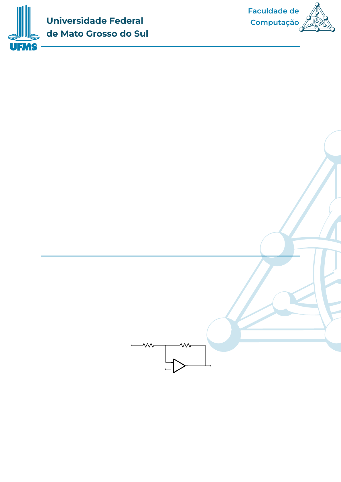 <p>Faculdade de</p><p>ComputaçãoUniversidade Federal</p><p>de Mato Grosso do Sul</p><p>Curso: Engenharia de Computação Data: 23 e 25/10/2024</p><p>Professora: Daniela L. Catelan Disciplina: Circuitos Eletrônicos</p><p>Monitor: Isaac Kosloski O. Turma: P02 e P01 - 2024.2</p><p>Prática Experimental 8 - Circuitos Básicos com AmpOp</p><p>Objetivos</p><p>• Verificar, experimentalmente, o funcionamento de alguns circuitos básicos com</p><p>Amplificadores Operacionais (AmpOps). [1] [2].</p><p>Materiais</p><p>• 2 Fontes de Tensão Variável</p><p>• Gerador de Funções</p><p>• Mult́ımetro Digital</p><p>• Matriz de contatos (protoboard)</p><p>• CIs: LM741 e LM324</p><p>• Resistores:</p><p>2, 2kΩ, 4, 7kΩ, 5, 6kΩ, 22kΩ e</p><p>150kΩ</p><p>• Fios e cabos para conexões</p><p>Procedimentos</p><p>OBSERVAÇÕES IMPORTANTES!</p><p>Para melhor acurácia nos valores da análise e eficiência nas práticas experimentais, observe:</p><p>▶ Sempre meça as resistências reais dos resistores, que apresentam um erro pelo fabricante.</p><p>▶ Verifique, também, a tensão da fonte de alimentação.</p><p>▶ Não se esqueça de pesquisar pelo data sheet dos componentes utilizados no experimento!</p><p>Etapa 1 - Circuito Diferencial e Realimentação Negativa</p><p>▷ Monte o circuito da figura 1, utilizando o CI LM741;</p><p>▷ Monte uma fonte de ±15V para alimentar o ampop;</p><p>▷ Ajuste no canal 1 do gerador de funções, uma tensão triangular Vtri = 500mV/100Hz (tensão de pico);</p><p>▷ Ajuste no canal 2 do gerador de funções, uma tensão senoidal Vsin = 700mV/100Hz (tensão de pico);</p><p>▷ Faça VA = Vtri e VB = Vsin e observe o resultado no osciloscópio.</p><p>▷ Faça VA = Vsin e VB = Vtri e observe o resultado no osciloscópio.</p><p>−</p><p>+VB</p><p>150kΩ</p><p>Vo</p><p>22kΩ</p><p>VA</p><p>Figura 1: Circuito diferencial em realimentação negativa.</p><p>1</p><p>Faculdade de</p><p>ComputaçãoUniversidade Federal</p><p>de Mato Grosso do Sul</p><p>Etapa 2 - Seguidor de Tensão e Somador Inversor</p><p>▷ Monte o circuito da figura 2, utilizando o CI LM324;</p><p>▷ Monte uma fonte de ±15V para alimentar o ampop;</p><p>▷ Ajuste no canal 1 do gerador de funções, uma tensão triangular Vtri = 500mV/100Hz (tensão de pico);</p><p>▷ Ajuste no canal 2 do gerador de funções, uma tensão senoidal Vsin = 700mV/100Hz (tensão de pico);</p><p>▷ Faça VA = Vtri e VB = Vsin e observe o resultado no osciloscópio.</p><p>▷ Faça VA = Vsin e VB = Vtri e observe o resultado no osciloscópio.</p><p>−</p><p>+</p><p>4, 7kΩ</p><p>Vo</p><p>2, 2kΩ</p><p>5, 6kΩ</p><p>−</p><p>+VA</p><p>−</p><p>+VB</p><p>Figura 2: Circuito somador inversor com seguidores de tensão.</p><p>Tratamento de dados</p><p>Etapa 3 - Análise dos circuitos e resultados</p><p>▷ Faça a análise dos circuitos de forma teórica (ideal)</p><p>▷ Explique seus funciomentos, em particular, os circuito que compõem o circuito da Figura 2.</p><p>▷ Compare os resultados com os da experimentação e de simulação.</p><p>Etapa 4 - Entrega do relatório</p><p>▷ Construa o relatório e o entregue via AVA até a data determinada.</p><p>Referências</p><p>[1] F. G. Capuano and M. A. M. Marino, Laboratório de Eletricidade e Eletrônica, 24th ed. Editora Érica Ltda,</p><p>2010.</p><p>[2] R. L. Boylestad and L. Nashelsky, Dispositivos eletrônicos e teoria de circuitos, 11th ed. Pearson Education do</p><p>Brasil, 2013.</p><p>2</p>