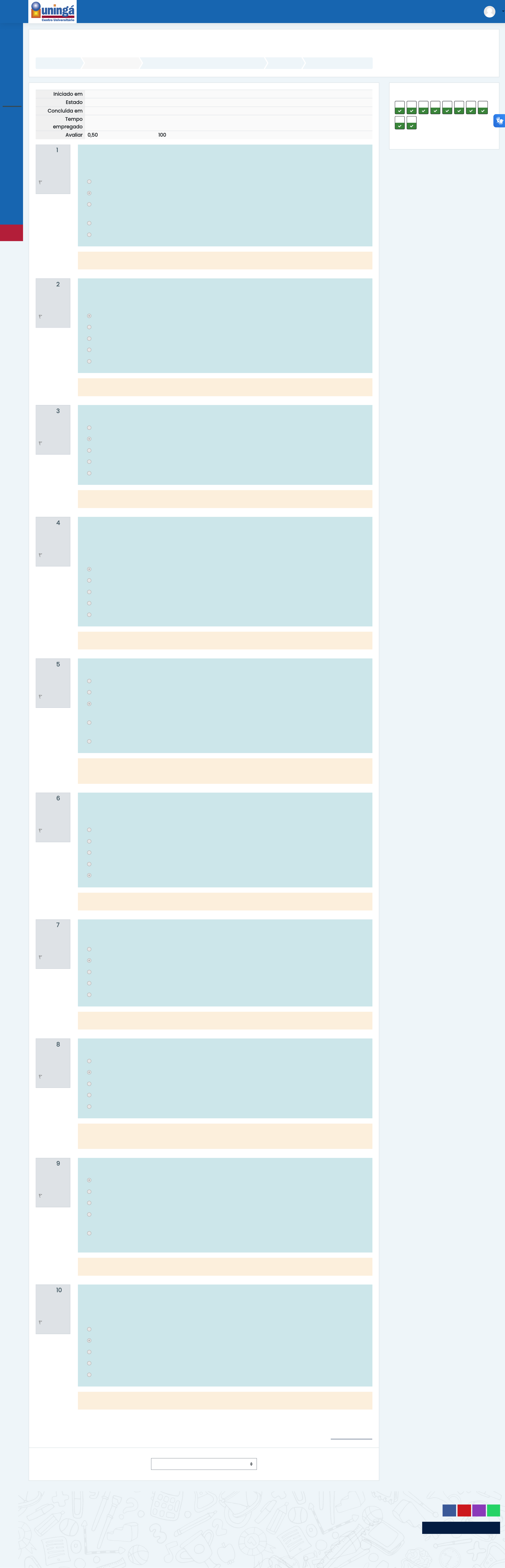<p>2024/4 - Metodologia e Técnicas de Pesquisa</p><p>Página inicial Minhas disciplinas 2024/4 - Metodologia e Técnicas de Pesquisa UNIDADE II Avaliação - Unidade II</p><p>Questão 1</p><p>Correto</p><p>Atingiu 0,05</p><p>de 0,05</p><p>Marcar</p><p>questão</p><p>Questão 2</p><p>Correto</p><p>Atingiu 0,05</p><p>de 0,05</p><p>Marcar</p><p>questão</p><p>Questão 3</p><p>Correto</p><p>Atingiu 0,05</p><p>de 0,05</p><p>Marcar</p><p>questão</p><p>Questão 4</p><p>Correto</p><p>Atingiu 0,05</p><p>de 0,05</p><p>Marcar</p><p>questão</p><p>Questão 5</p><p>Correto</p><p>Atingiu 0,05</p><p>de 0,05</p><p>Marcar</p><p>questão</p><p>Questão 6</p><p>Correto</p><p>Atingiu 0,05</p><p>de 0,05</p><p>Marcar</p><p>questão</p><p>Questão 7</p><p>Correto</p><p>Atingiu 0,05</p><p>de 0,05</p><p>Marcar</p><p>questão</p><p>Questão 8</p><p>Correto</p><p>Atingiu 0,05</p><p>de 0,05</p><p>Marcar</p><p>questão</p><p>Questão 9</p><p>Correto</p><p>Atingiu 0,05</p><p>de 0,05</p><p>Marcar</p><p>questão</p><p>Questão 10</p><p>Correto</p><p>Atingiu 0,05</p><p>de 0,05</p><p>Marcar</p><p>questão</p><p>Terminar revisão</p><p>Iniciado em quarta, 2 out 2024, 15:26</p><p>Estado Finalizada</p><p>Concluída em quarta, 2 out 2024, 15:31</p><p>Tempo</p><p>empregado</p><p>5 minutos 3 segundos</p><p>Avaliar 0,50 de um máximo de 0,50(100%)</p><p>De forma geral, fichamento é o ato de transcrever anotações após a leitura para uma possível utilização</p><p>posterior. Para uma melhor explicação, são divididos em: bibliográfico, crítico, de conteúdo e de citações. Assim,</p><p>a alternativa que, respectivamente, caracteriza cada um deles é:</p><p>a. Objetivo, conciso, informal, criterioso.</p><p>b. Ideia geral da obra, opinião do autor (resenha), todas as partes (resumo), cópia de trechos. </p><p>c. De síntese, ideia geral da obra para citar em um artigo, pessoal (todas as partes), parcial (só com trechos</p><p>do autor).</p><p>d. Crítico, preciso, ideia geral, opinião do autor (resenha).</p><p>e. De livro, de opinião, de cópia de trechos, de aspas.</p><p>A resposta correta é: Ideia geral da obra, opinião do autor (resenha), todas as partes (resumo), cópia de trechos.</p><p>A respeito dos elementos pós-textuais, assinale a alternativa que completa adequadamente as lacunas:</p><p>______________ é um documento extra criado pelo próprio autor, e ______________ é um documento</p><p>para exemplificação não criado pelo autor do trabalho.</p><p>a. Apêndice / Anexo </p><p>b. Anexo / Apêndice</p><p>c. Epígrafe / Apêndice</p><p>d. Referências / Apêndice</p><p>e. Anexo / Referências</p><p>A resposta correta é: Apêndice / Anexo</p><p>Qual é a forma correta de identificar um segundo anexo no seu trabalho?</p><p>a. 2º ANEXO – MODELO DE PAGAMENTO.</p><p>b. ANEXO B – Modelo de pagamento. </p><p>c. Anexo segundo – Modelo de pagamento.</p><p>d. Anexo 2 – Modelo de pagamento.</p><p>e. Anexo dois – Modelo de pagamento.</p><p>A resposta correta é: ANEXO B – Modelo de pagamento.</p><p>Analisando a parte sobre leitura temática de Severino (2007), podemos concluir que, para encontrar o tema,</p><p>precisamos observar como o autor inicia o texto e como ele o encerra. Assim, pensando no filme Vida Maria,</p><p>sugerido na unidade, qual seria o tema quando o autor começa com uma menina, Maria, desenhando o nome à</p><p>janela, sendo interrompida pela mãe, e termina com essa mesma cena, outra Maria, vivendo a mesma</p><p>situação?</p><p>a. O ciclo repetitivo da vida da mulher no sertão. </p><p>b. A pobreza, que leva a situações parecidas.</p><p>c. A vida da mulher no sertão.</p><p>d. A ausência de escolarização no Nordeste.</p><p>e. A falta de oportunidades para os sertanejos, principalmente mulheres.</p><p>A resposta correta é: O ciclo repetitivo da vida da mulher no sertão.</p><p>As estratégias de skimming e scanning, respectivamente, referem-se:</p><p>a. ao processo literalmente de desnatar e escanear um texto.</p><p>b. a estratégias de leitura, que significam investigando e desnatando.</p><p>c. ao processo de dar uma olhada no todo e captar a ideia geral, e de procurar informações específicas</p><p>no texto, ampliando o que queremos encontrar.</p><p></p><p>d. ao processo de escanear, deixando restar o tema principal, e desnatar, ampliando informações</p><p>específicas.</p><p>e. a processos de leitura rápidos e eficazes de um texto utilizados apenas na língua inglesa.</p><p>A resposta correta é: ao processo de dar uma olhada no todo e captar a ideia geral, e de procurar informações</p><p>específicas no texto, ampliando o que queremos encontrar.</p><p>“Importa em contribuir de forma inédita para o conhecimento e visa à obtenção do grau acadêmico de doutor.</p><p>Deve defender uma ideia, um método, uma descoberta, uma conclusão obtida a partir de uma exaustiva</p><p>pesquisa e trabalho científicos”. Essa é a definição de</p><p>a. stricto sensu.</p><p>b. dissertação.</p><p>c. TCC da pós-graduação.</p><p>d. monografia.</p><p>e. tese. </p><p>A resposta correta é: tese.</p><p>Severino (2007) lista cinco pontos que devem ser observados pelos alunos para atingir bons resultados no</p><p>ensino-aprendizagem. Assinale a alternativa que apresenta o único requisito NÃO mencionado.</p><p>a. Empenho pessoal com instrumentos de trabalho adequados.</p><p>b. Auxílio de um colega de classe. </p><p>c. Necessidade de se fazer apontamentos e registros.</p><p>d. Obstáculos superados, tais como o desânimo e o desencanto.</p><p>e. Condições de estudo adequadas.</p><p>A resposta correta é: Auxílio de um colega de classe.</p><p>São características sobre o resumo e a resenha, EXCETO:</p><p>a. Na resenha, com base nos conhecimentos prévios, é realizado um comentário crítico.</p><p>b. Em ambos, o autor é responsável pela sua construção, resolvendo as partes que pode tirar ou não. </p><p>c. Os pontos principais do texto estão presentes tanto no resum